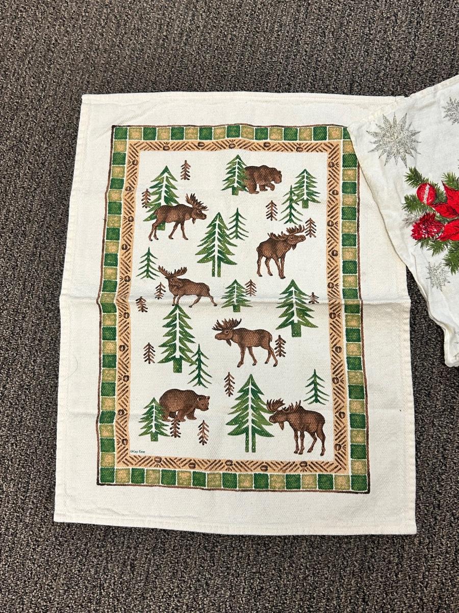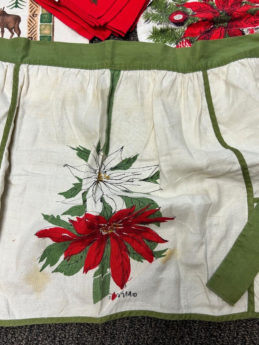 Mixed Lot of Vintage Winter Seasonal Holiday Kitchen Linen Towels Half Apron Dinner Napkins. Some spots and discoloration from previous use.