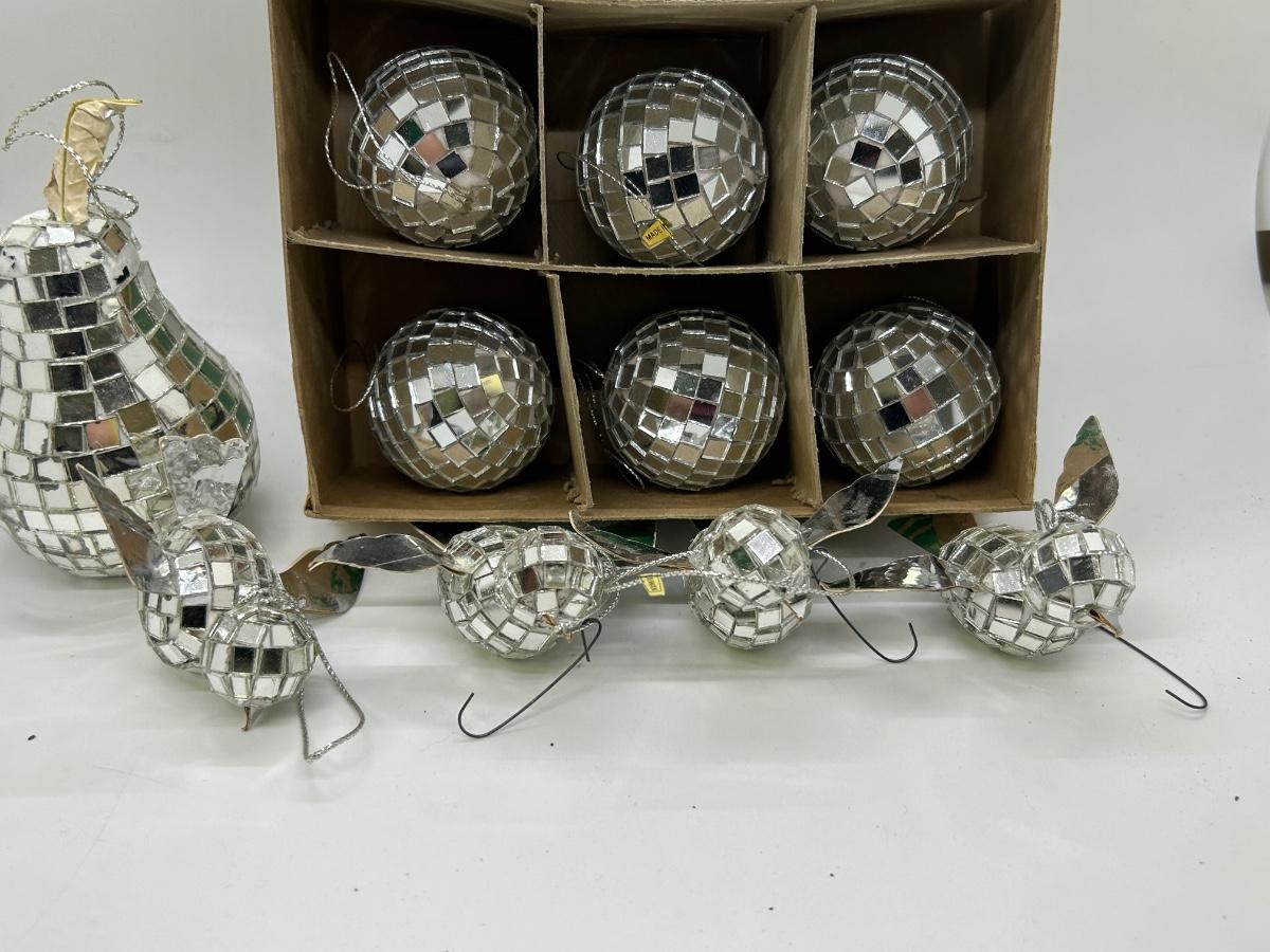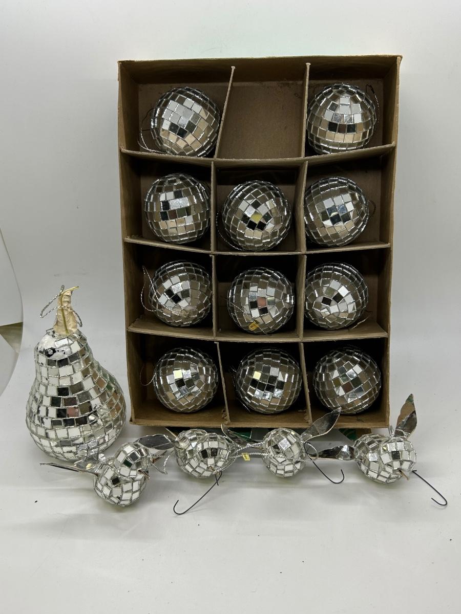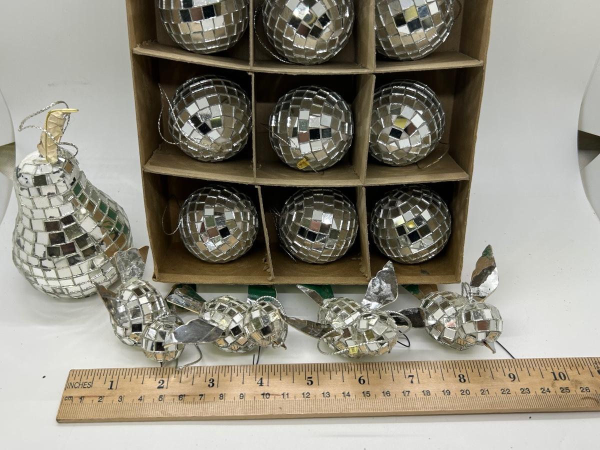 Mirror Ball Style Hanging Christmas Holiday Ornaments for Decor or Crafts. Mixed lot of styles. 11 mirror balls, 4 birds, and a pear shaped ornament. Great for adding sparkle to a tree or holiday wreath.