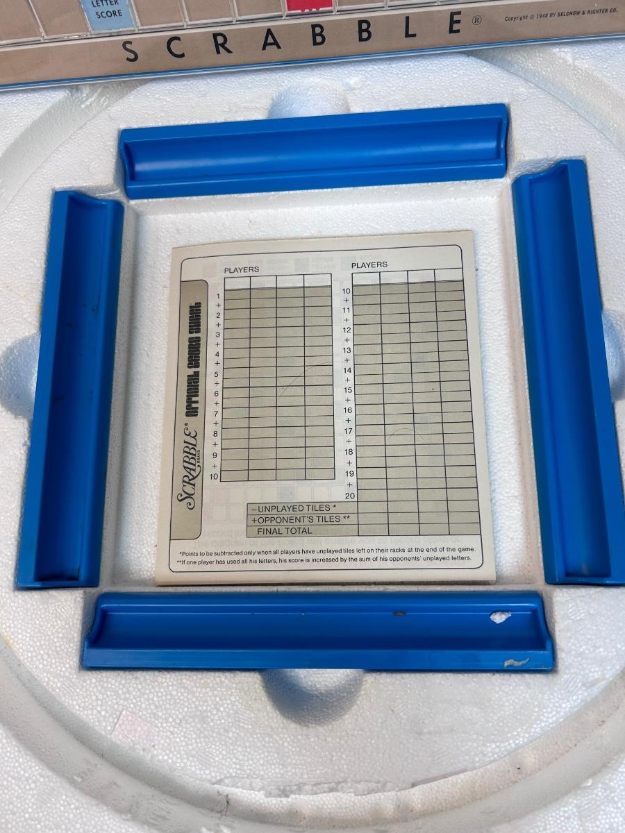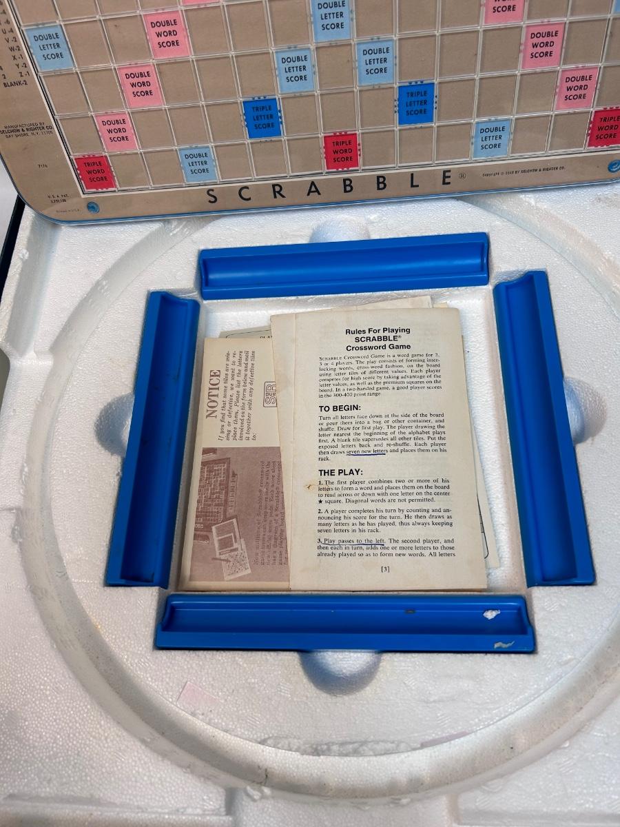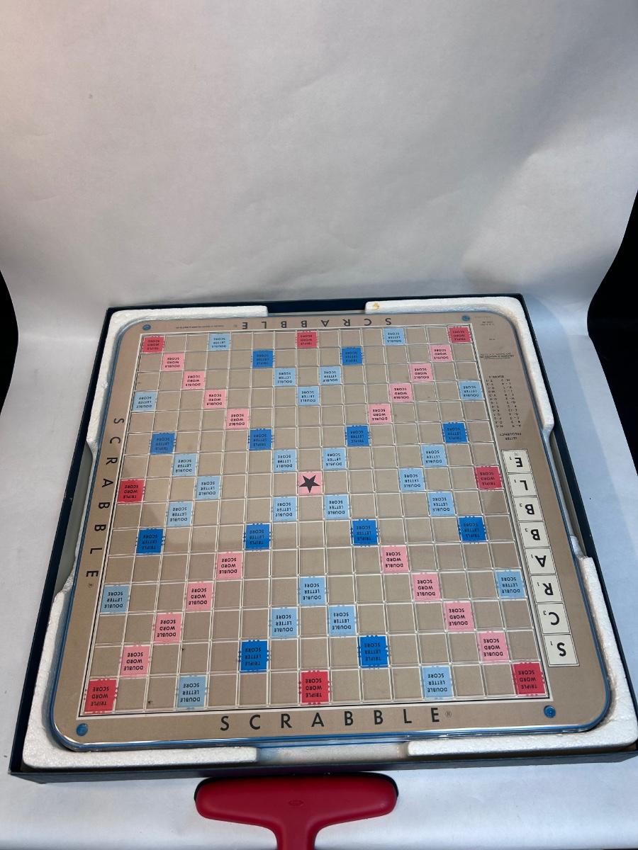Vintage Deluxe Edition SCRABBLE Crossword Letter Tile Boardgame Lazy Susan Board Burgundy Tiles. Game is in good condition. Did not check tiles for completeness but there is a lot of letters. Rest of game complete. Box has wear.