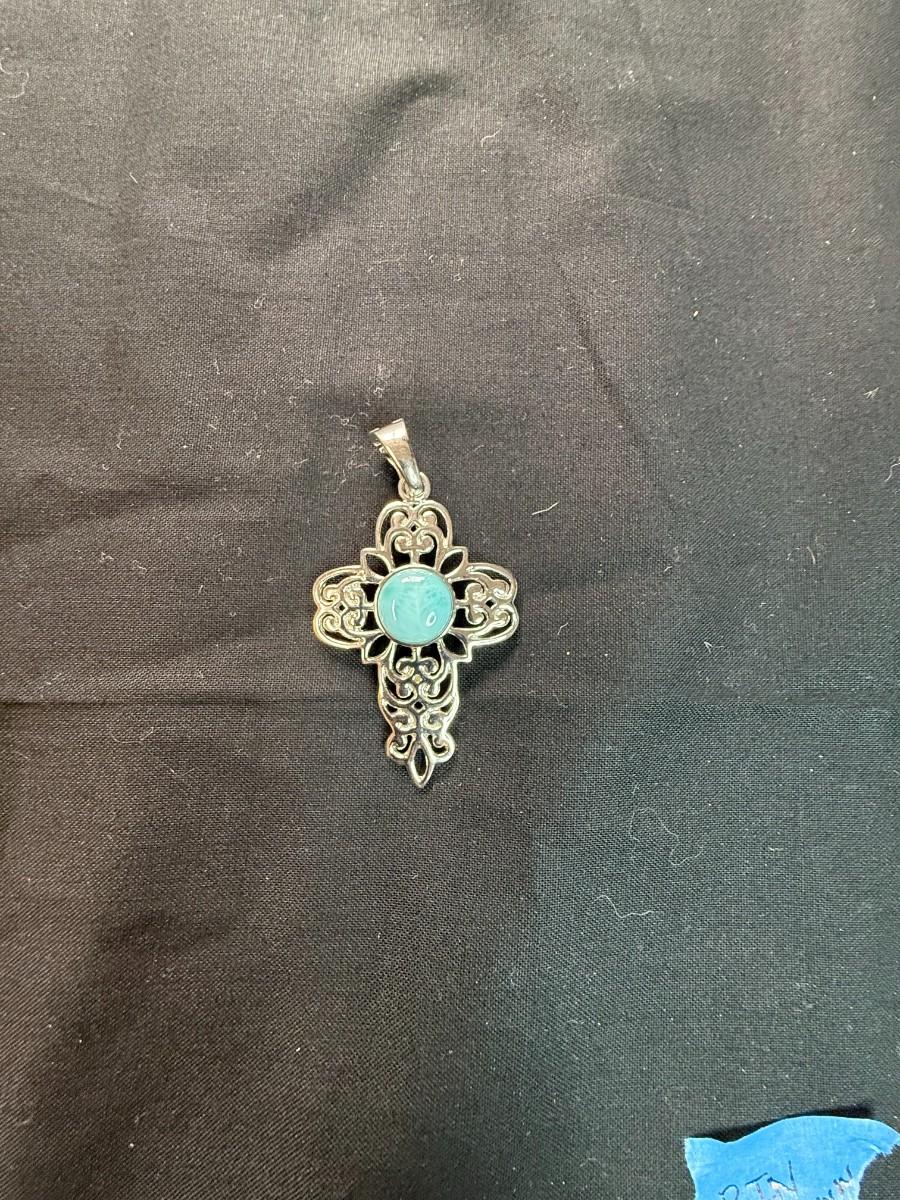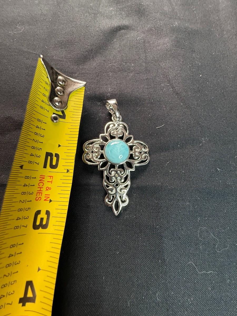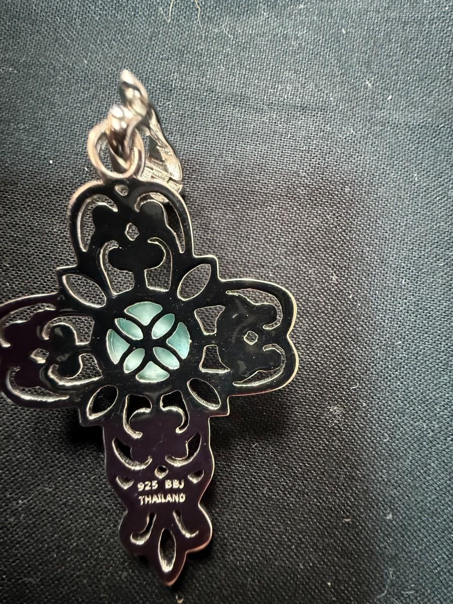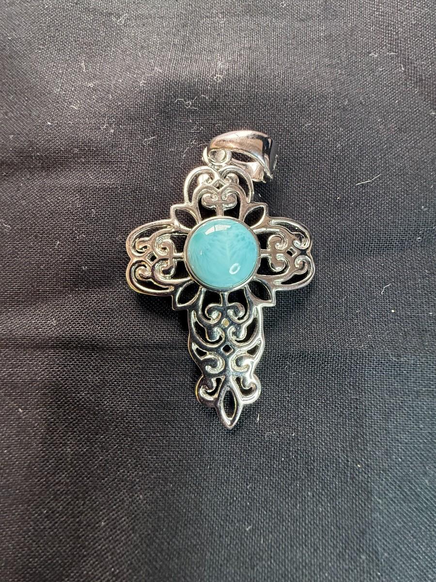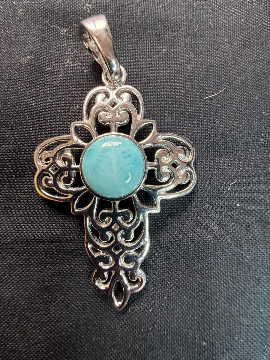 BBJ Sterling Silver & Larimar Scroll Design Cross Pendant