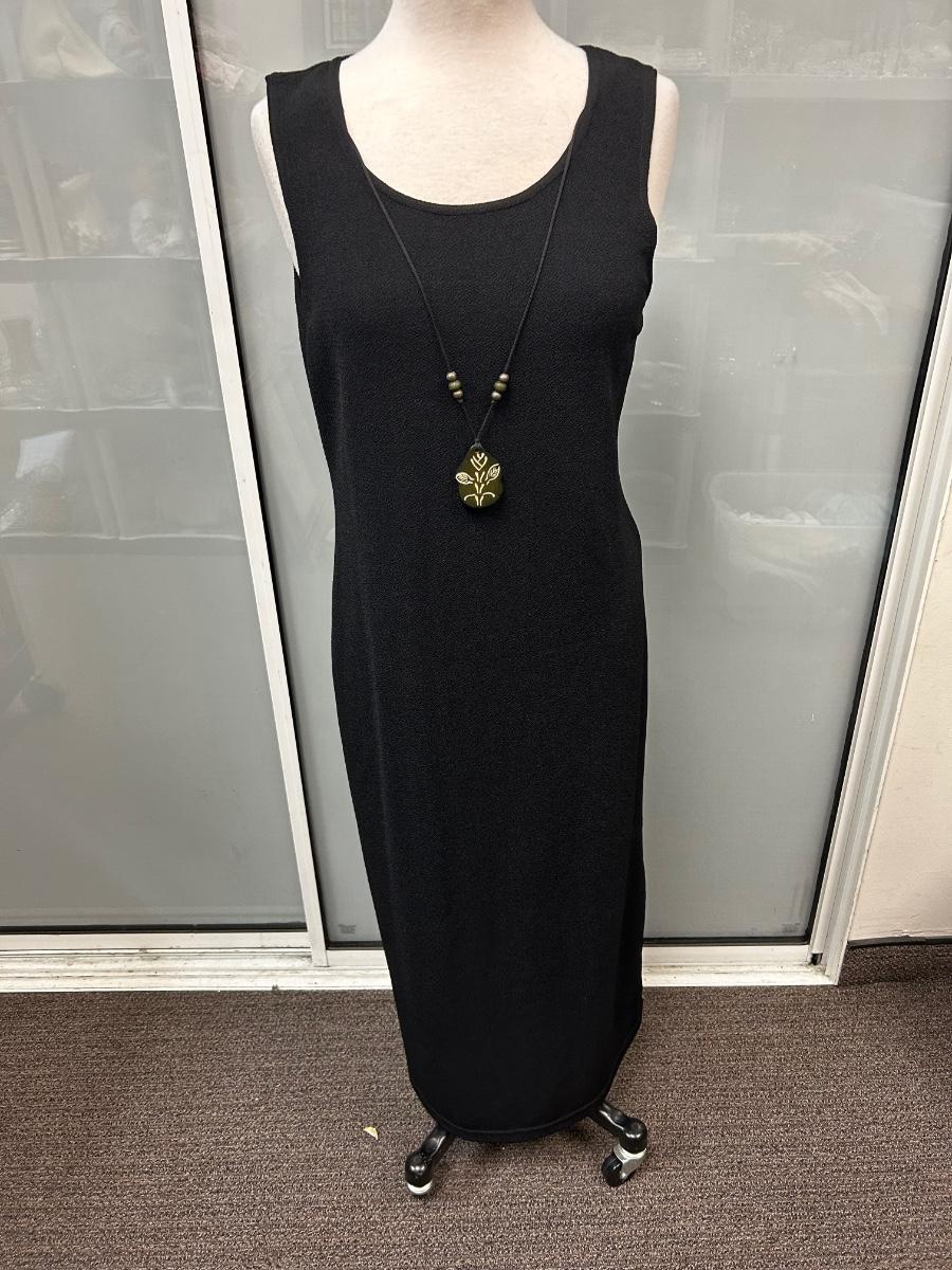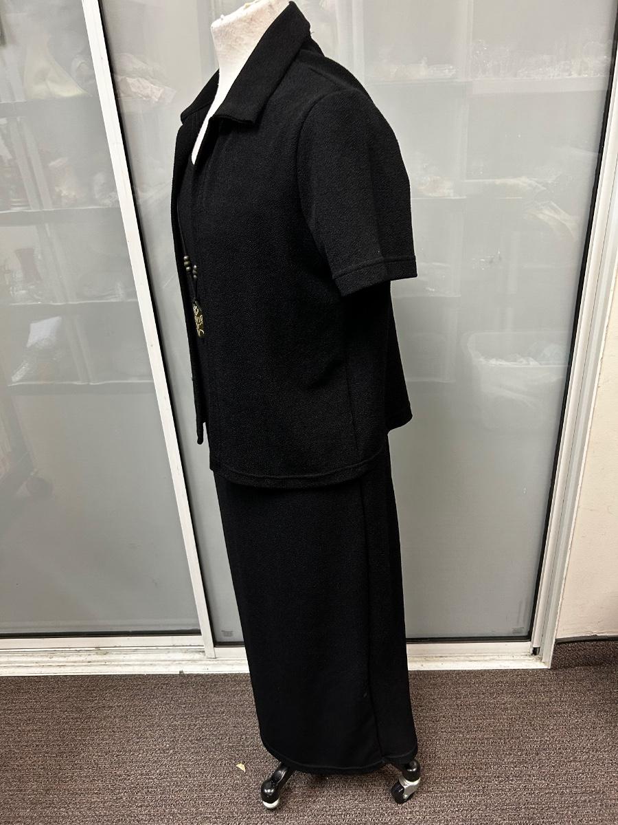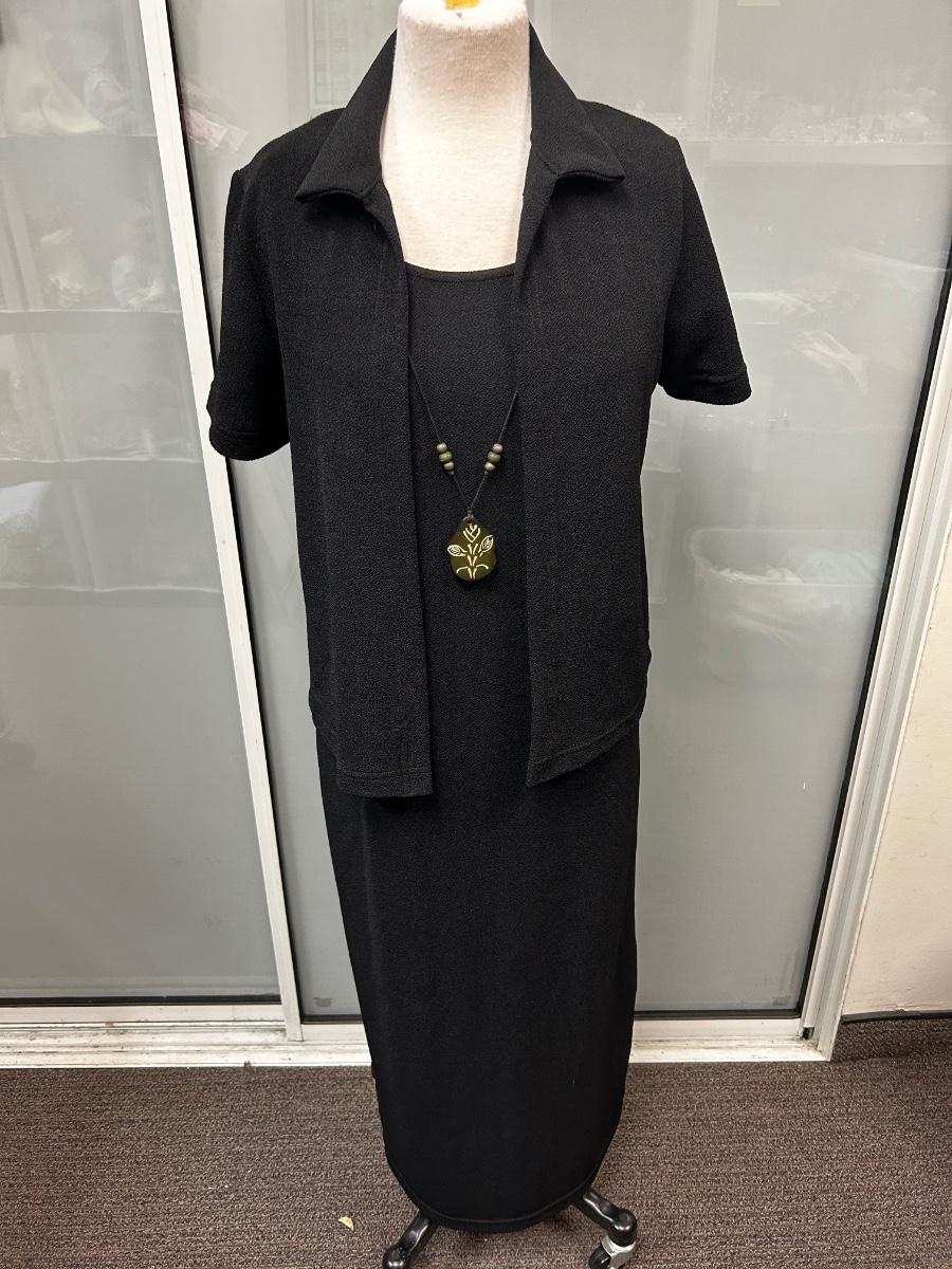 Two Piece Black Sleeveless Body Con Maxi Dress with Short Sleeve Cover Blouse Removeable necklace. In good condition. Size 8.