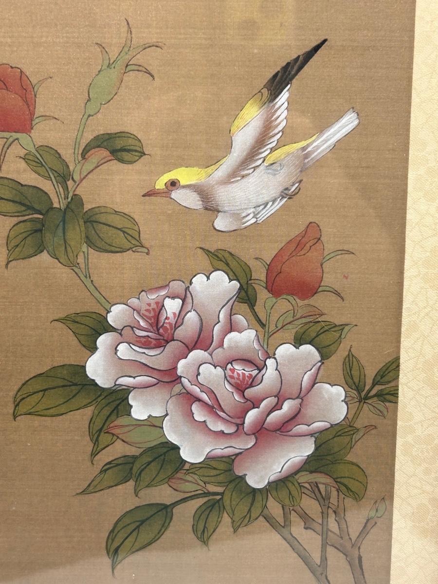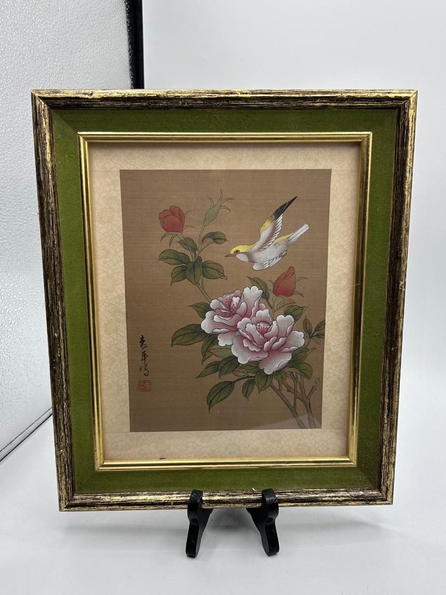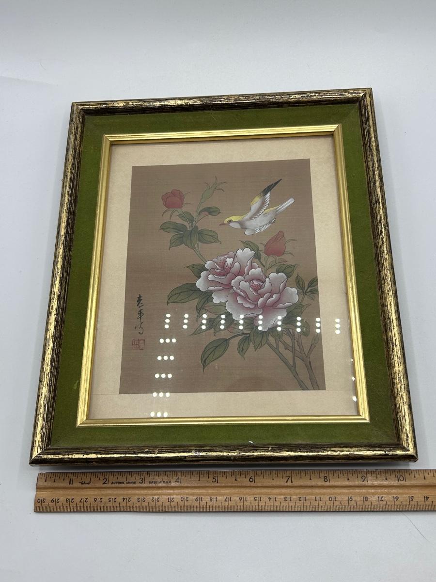 Beautiful Vintage Bird and Flowers Painting on Fabric Paper Asian Framed Art