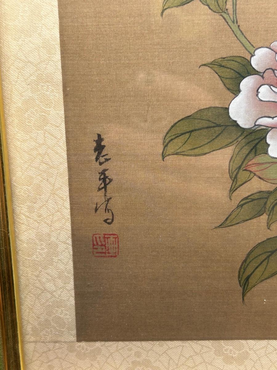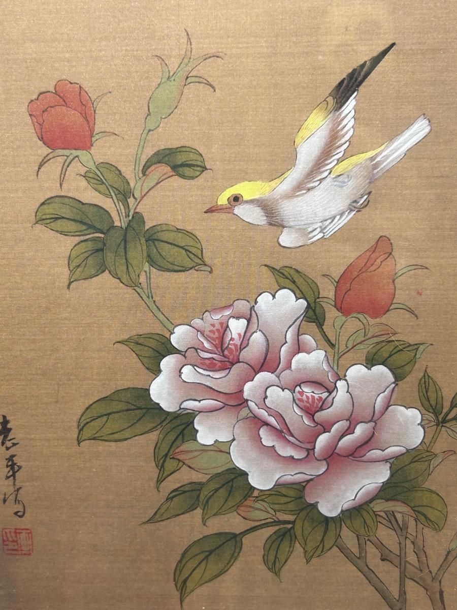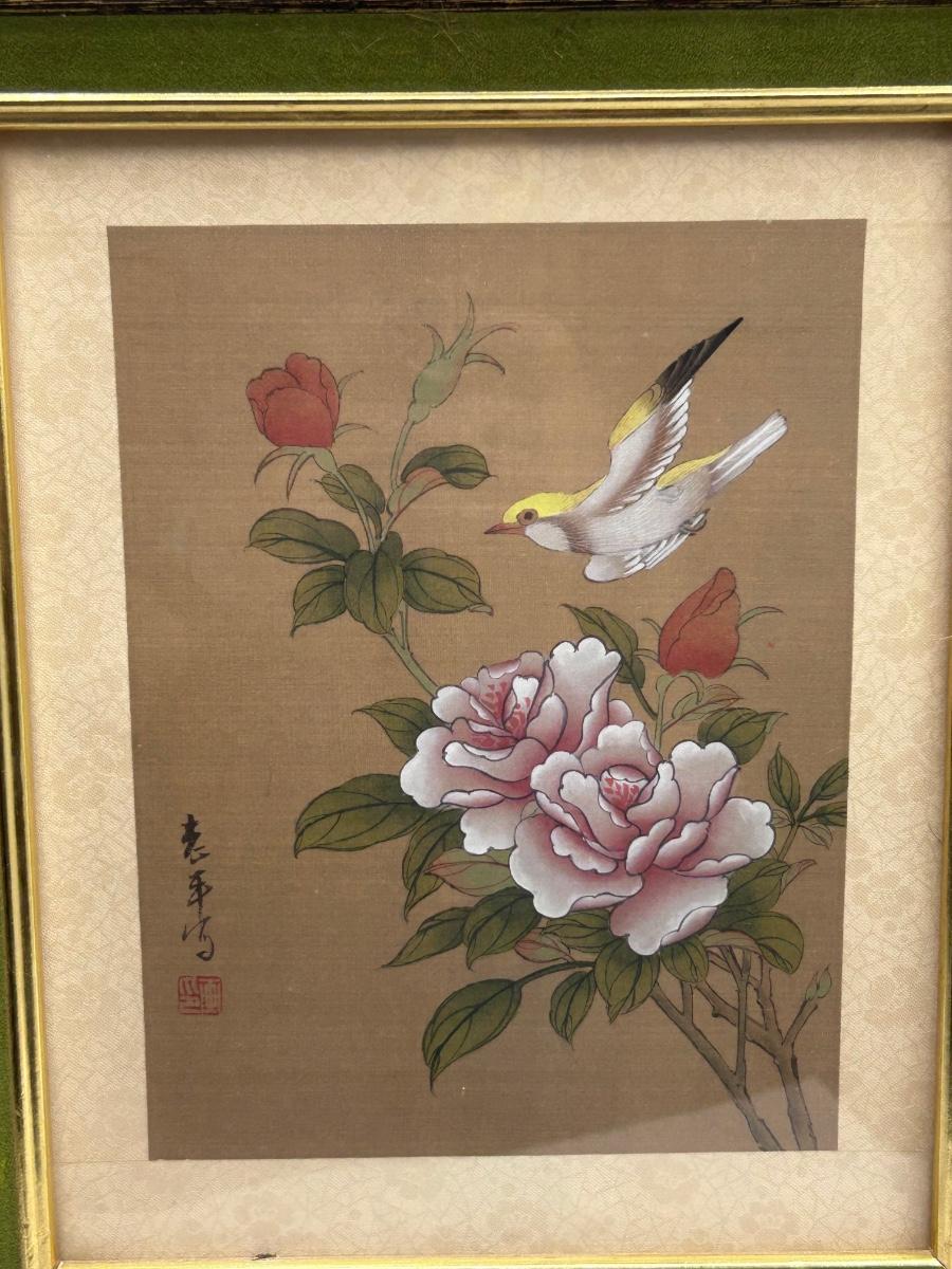 Beautiful Vintage Bird and Flowers Painting on Fabric Paper Asian Framed Art