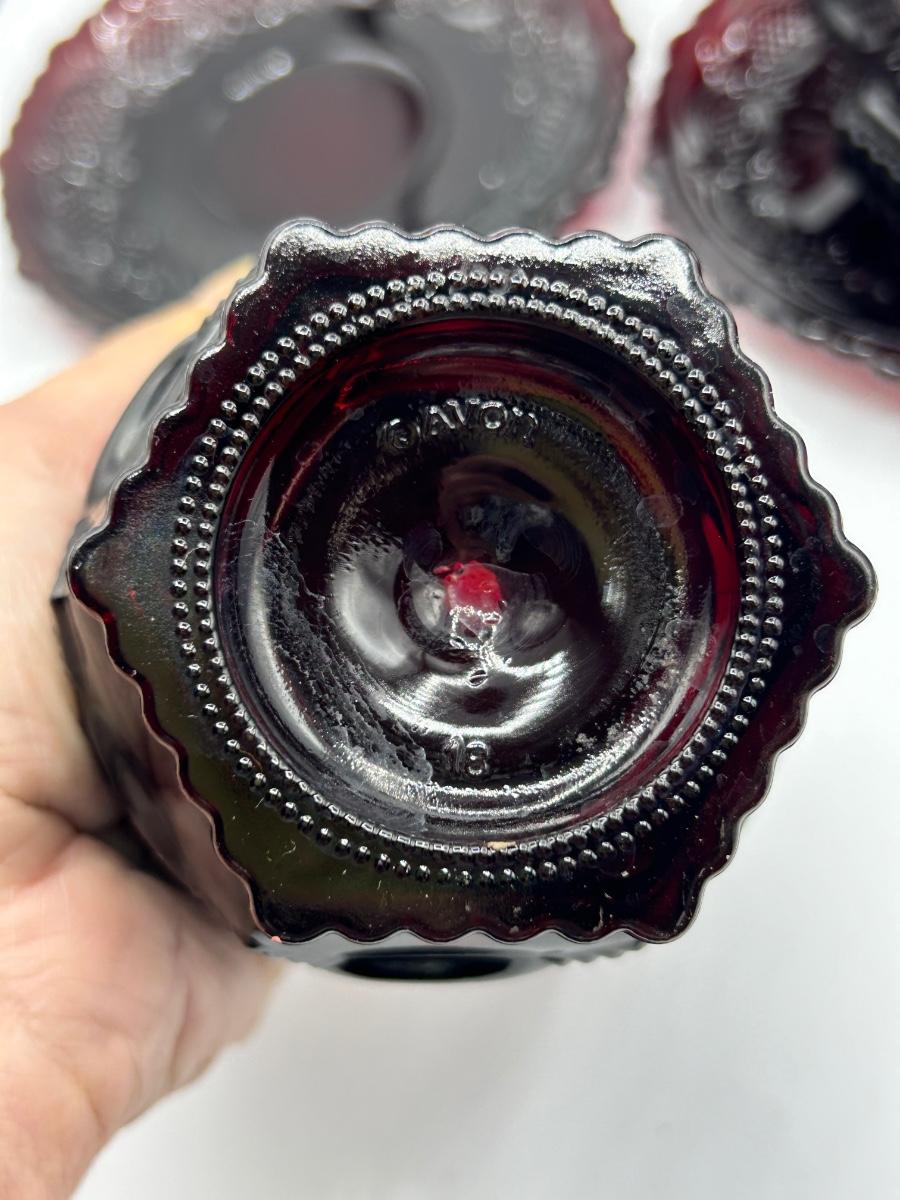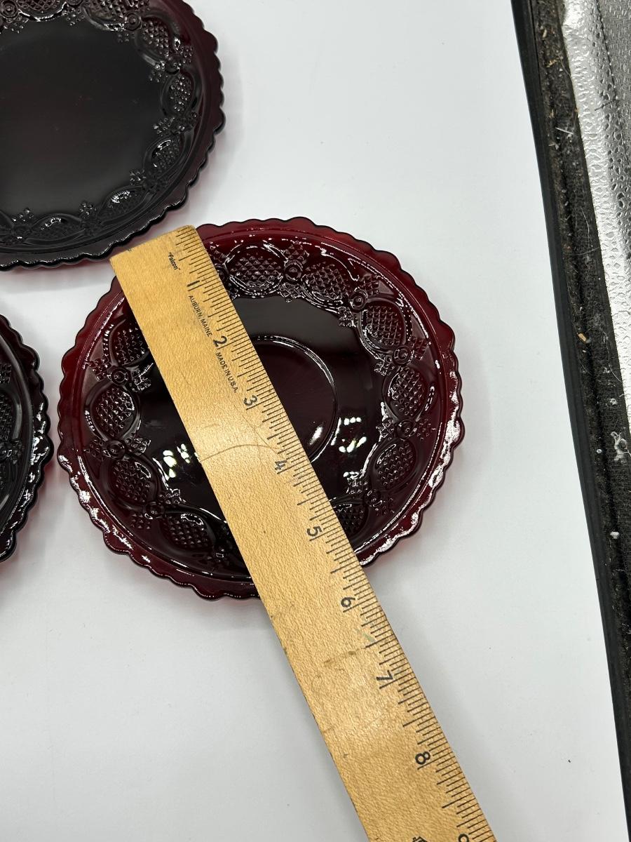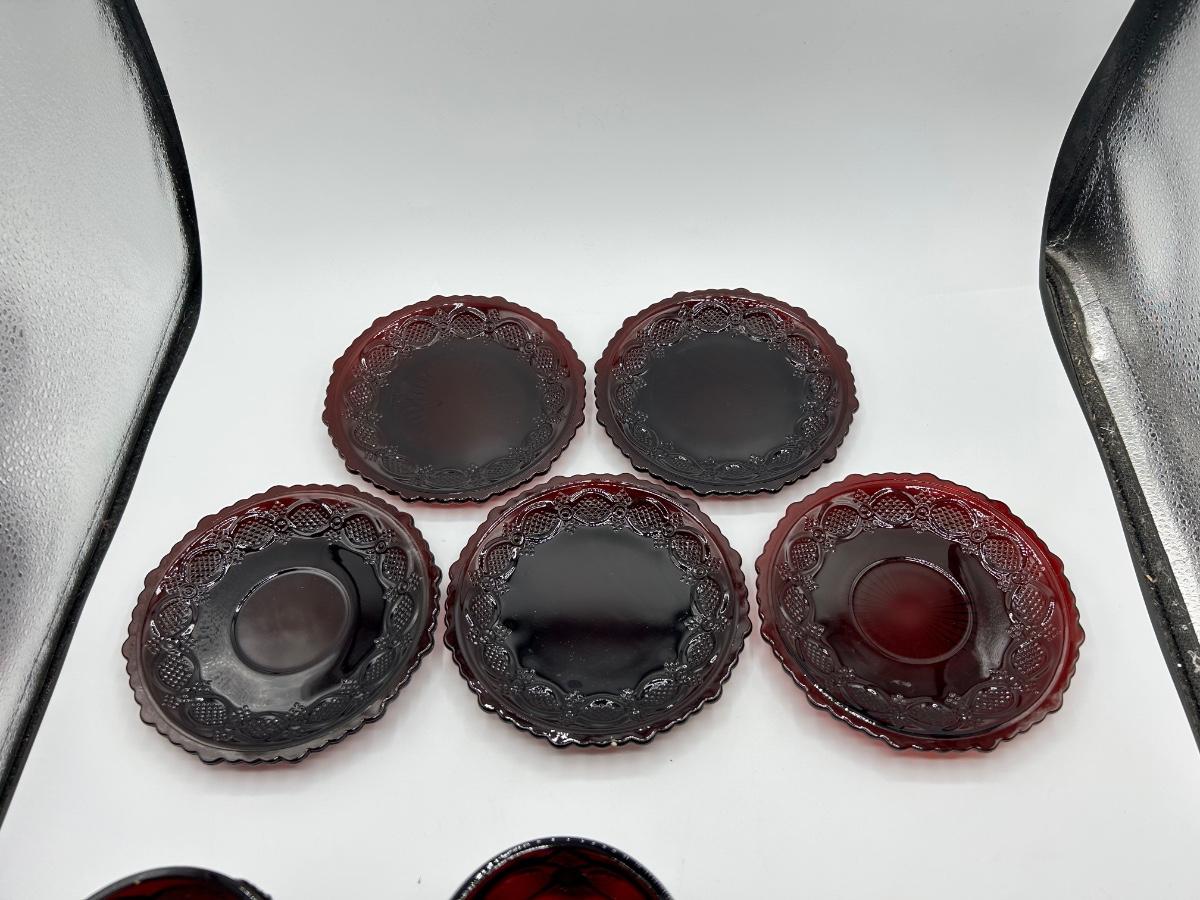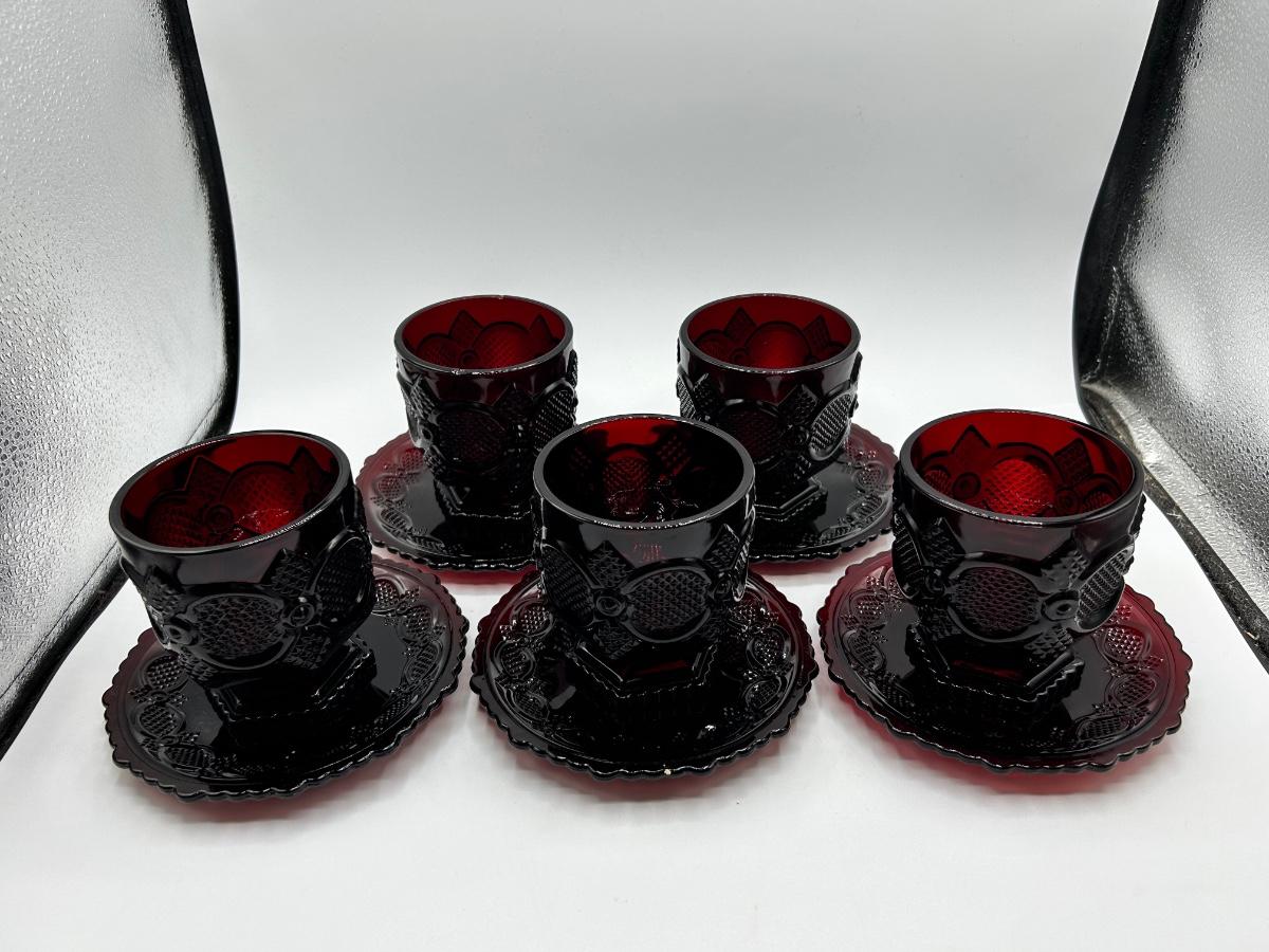 Vintage Lot of 5 Footed Dessert Fruit Bowls with Saucer Plates 1876 Cape Cod Pressed Ruby Red Glass Avon 1970s. In vintage condition, did find a couple very small chips. Two plate styles but they are all the same size.