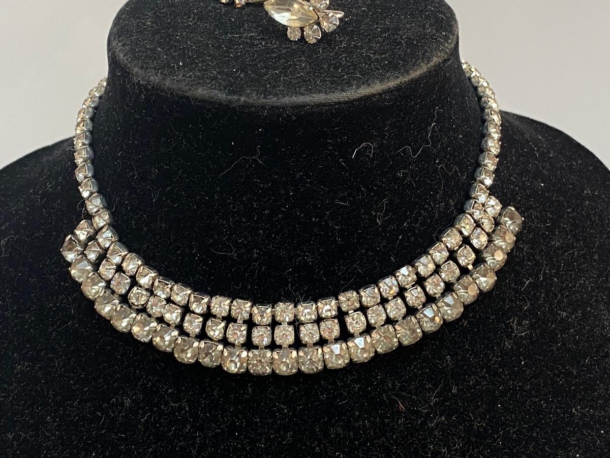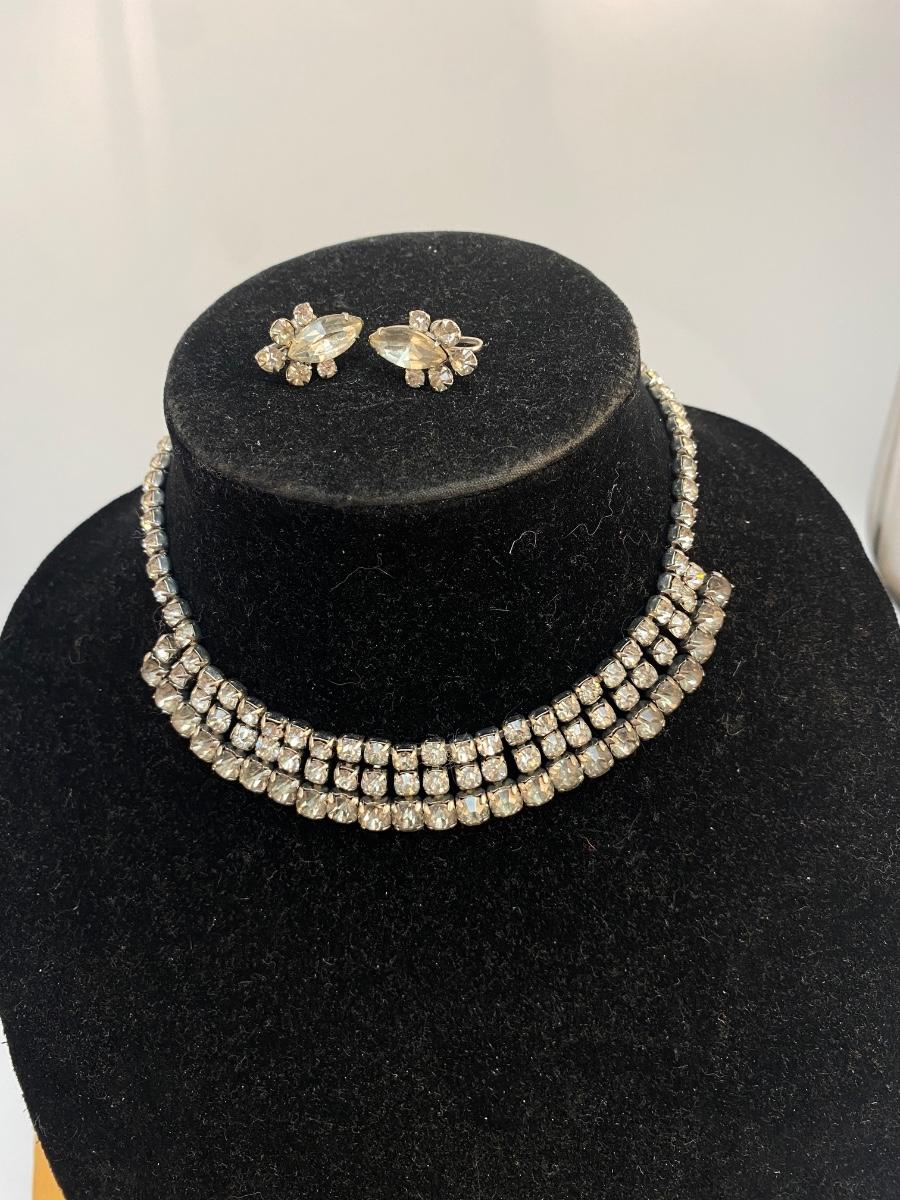 Vintage Crystal Clear Rhinestone Choker Necklace & Screwback Earrings