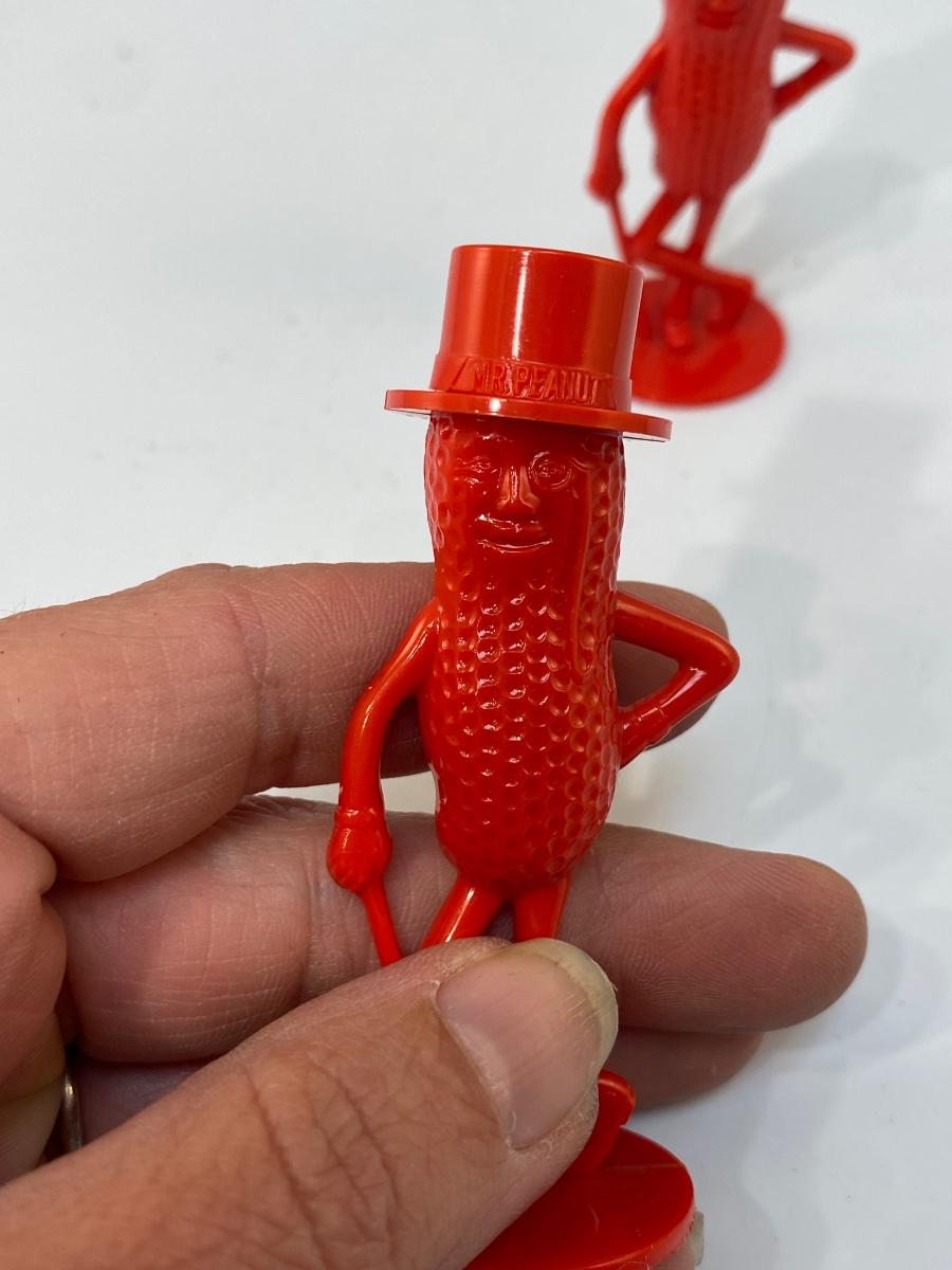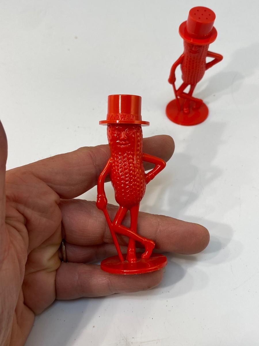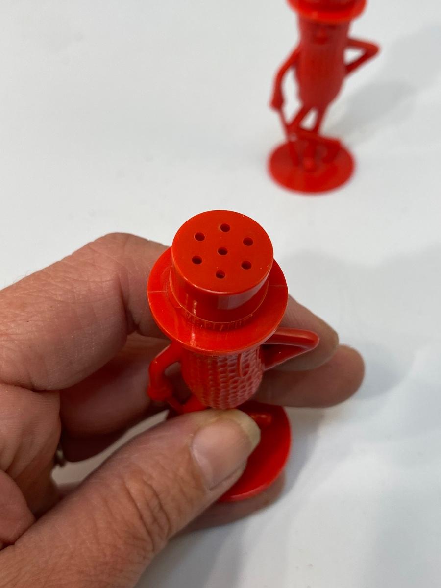 Retro Red Plastic Mr. Peanut Salt Shakers, Top of hat twists on off for filling. One hat is loose. In good displayable condition. About 3" size.