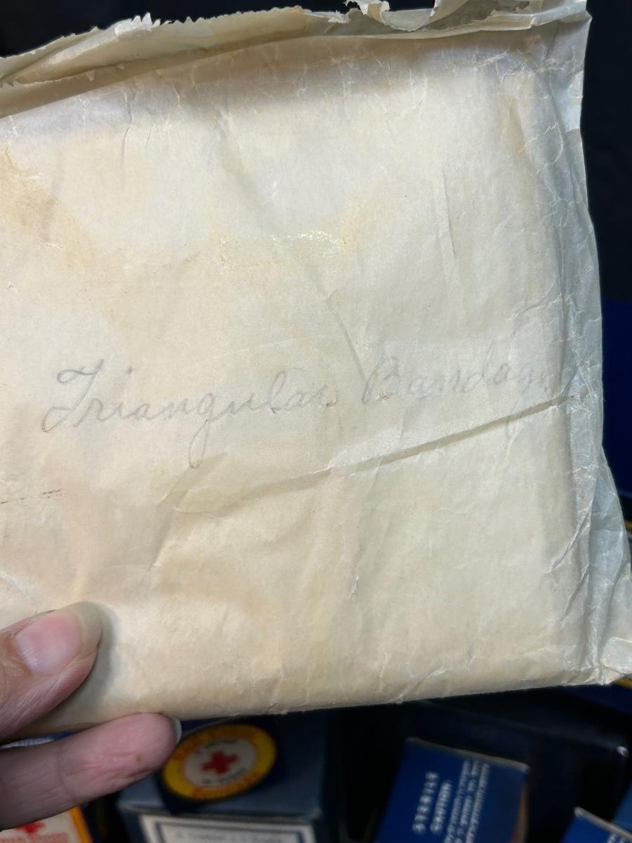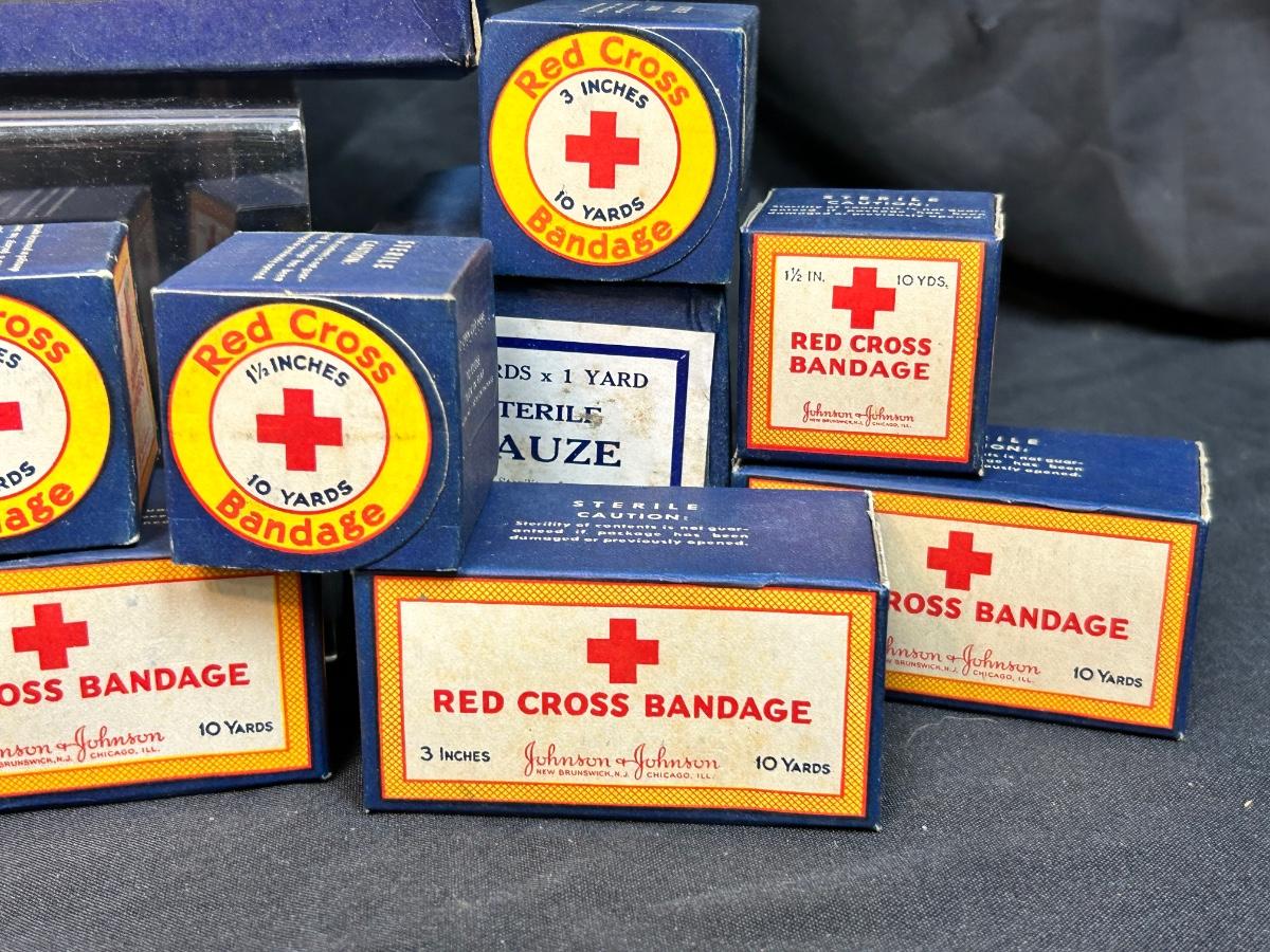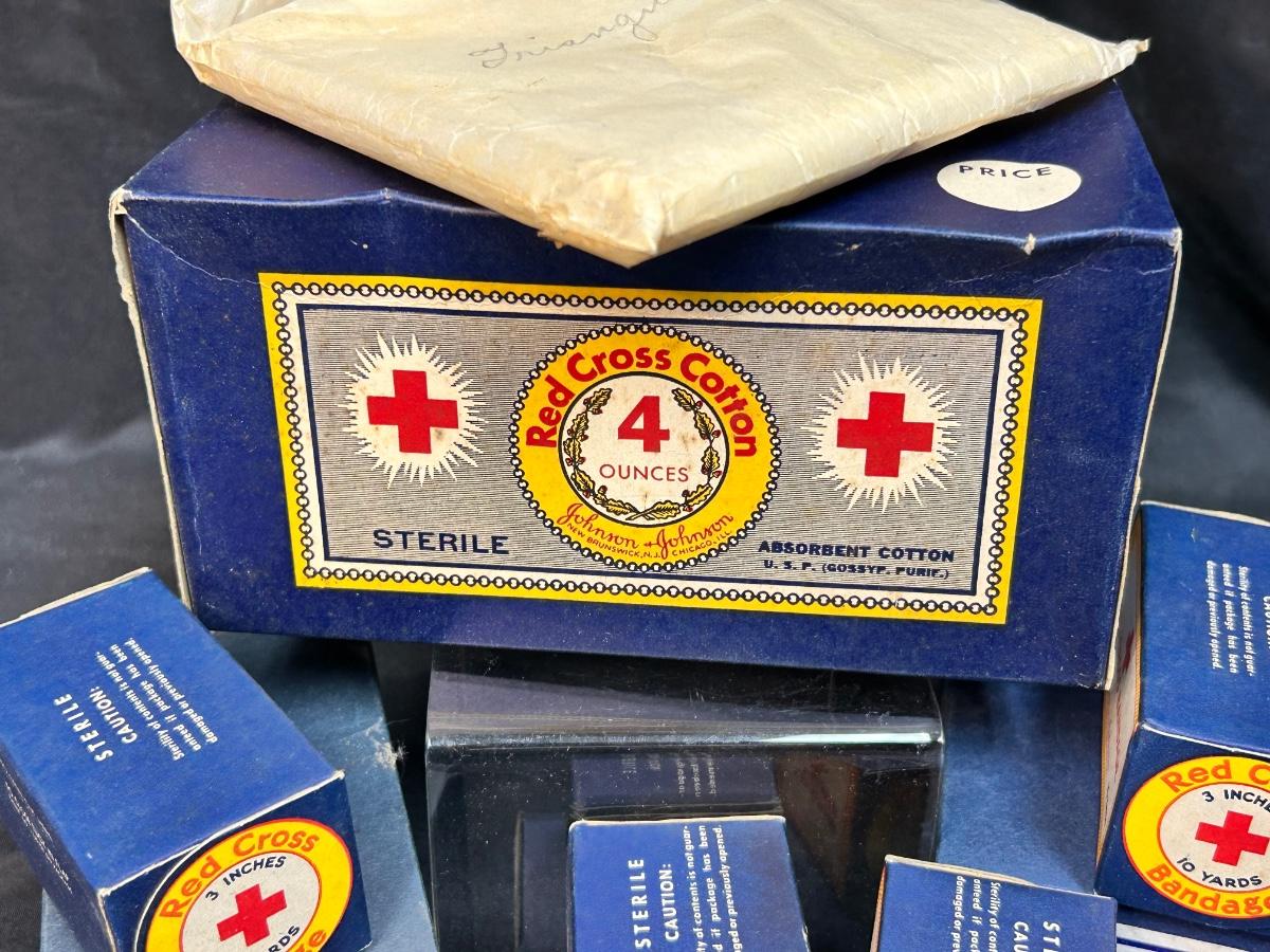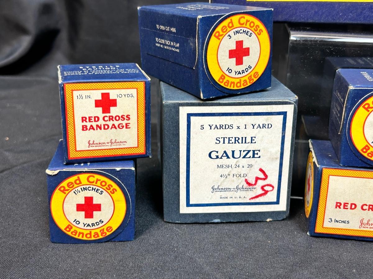 Vintage Red Cross Cotton Unopened Boxes Sterile Gauze Bandages. Vintage packaging, great for display. All boxes seem to be unopened, except the triangle bandage which is cloth like.