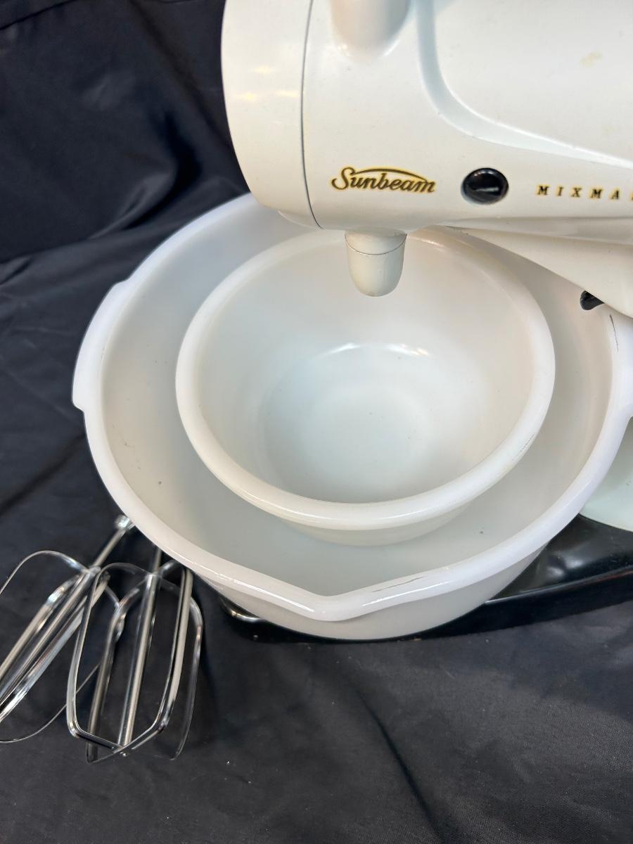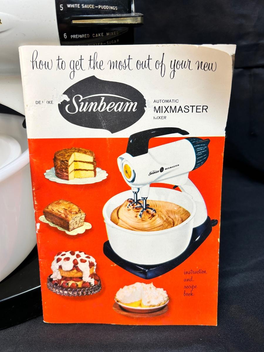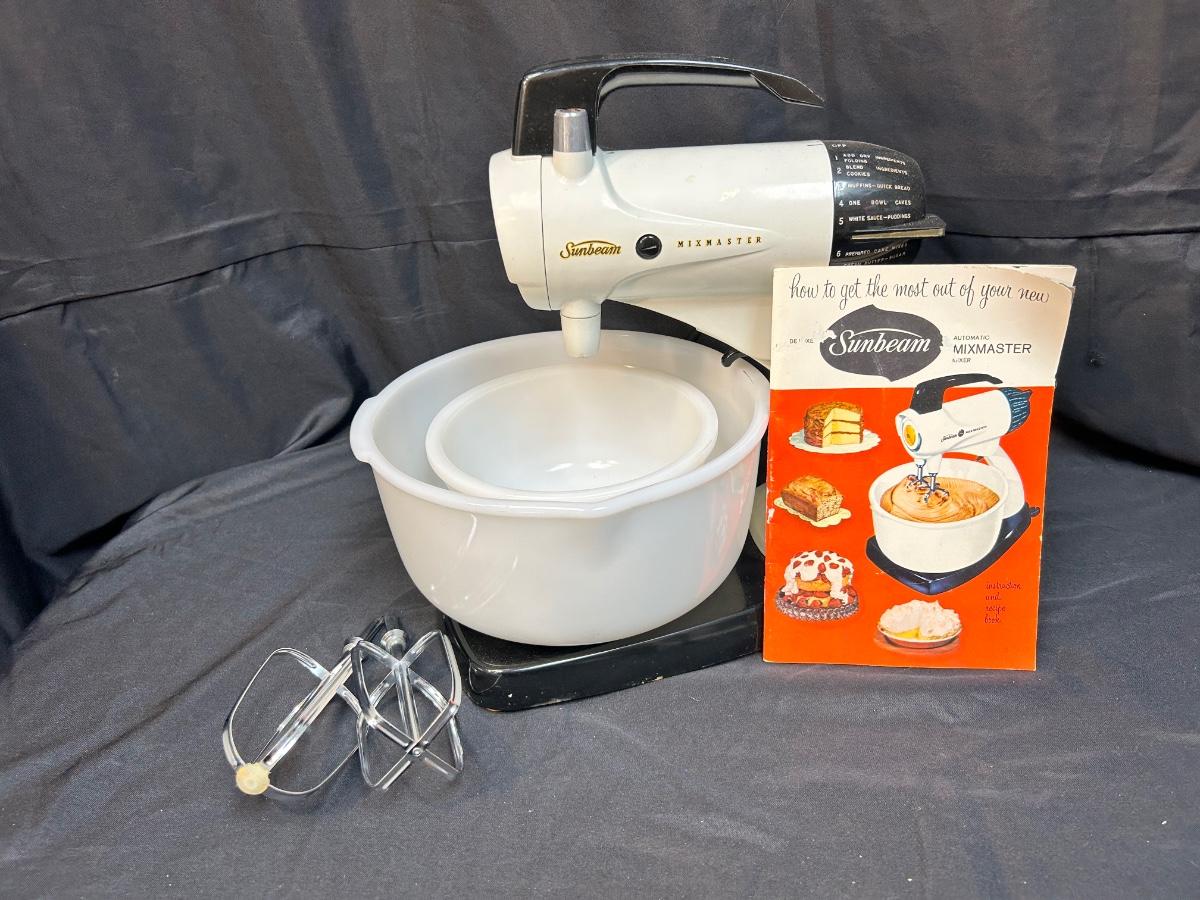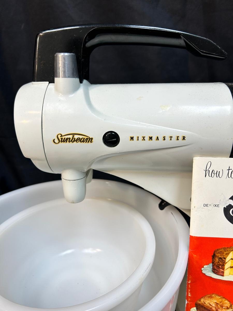 Vintage Retro Sunbeam Mixmaster Mixer with Two Bowls and Booklet. In good vintage condition. Bowls have no chips. Comes with a set of beaters. Unfortunately, it is untested as the cord has some light damage and needs to be repaired.
