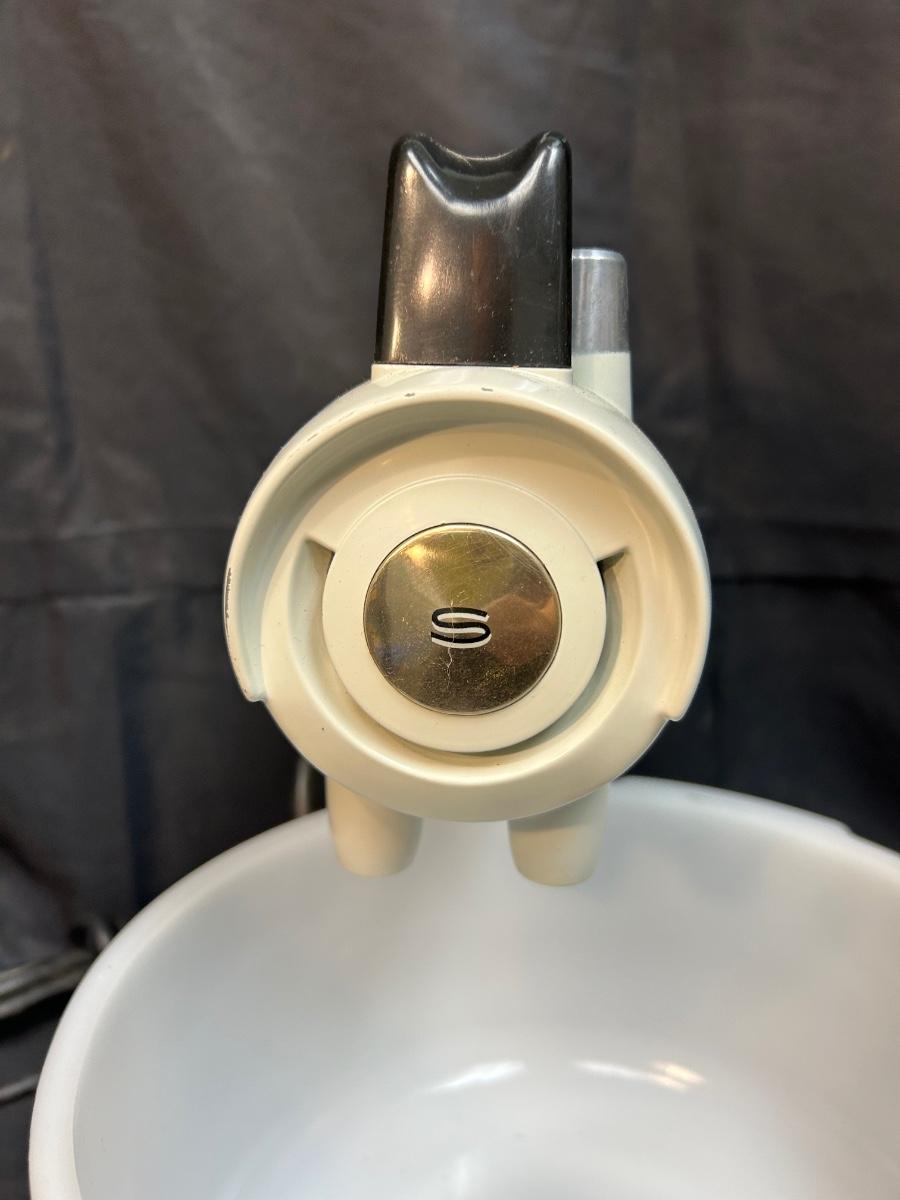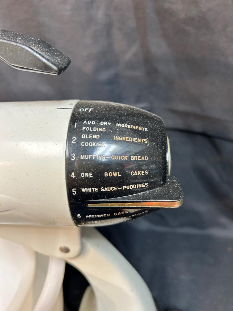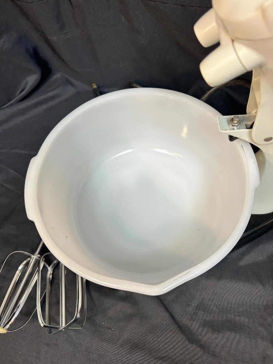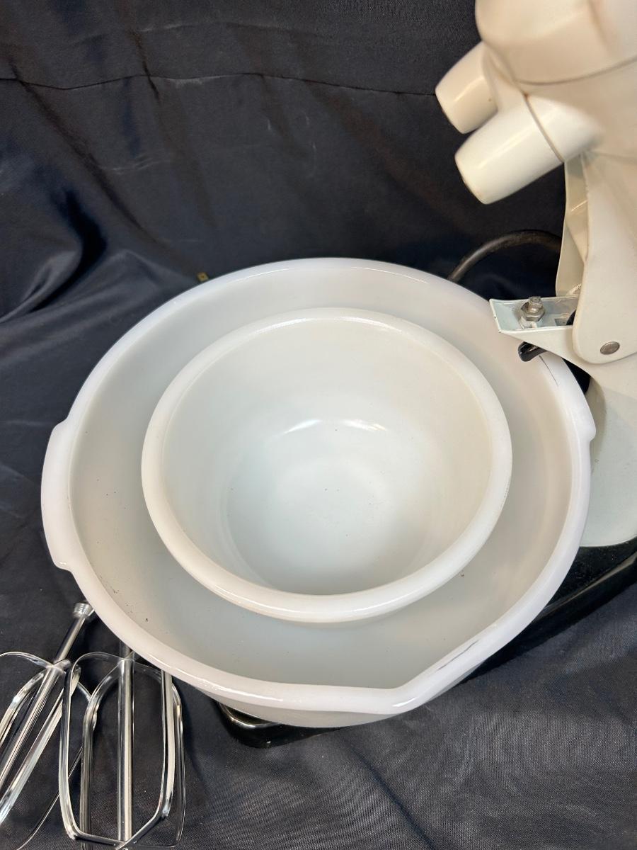 Vintage Retro Sunbeam Mixmaster Mixer with Two Bowls and Booklet. In good vintage condition. Bowls have no chips. Comes with a set of beaters. Unfortunately, it is untested as the cord has some light damage and needs to be repaired.