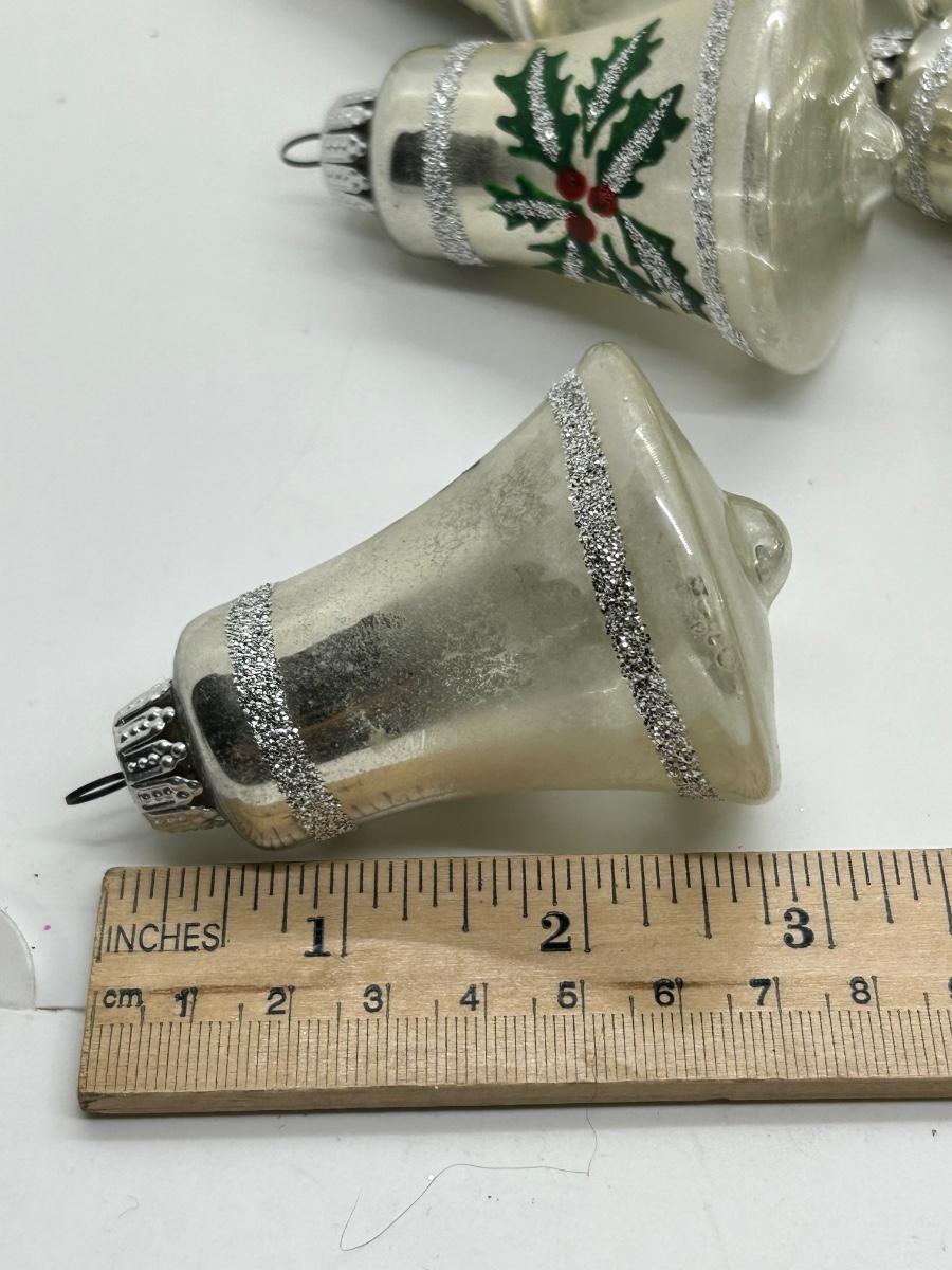 Vintage Blown Glass Bell Shaped Christmas Holiday Tree Ornaments Holly and Glitter West Germany