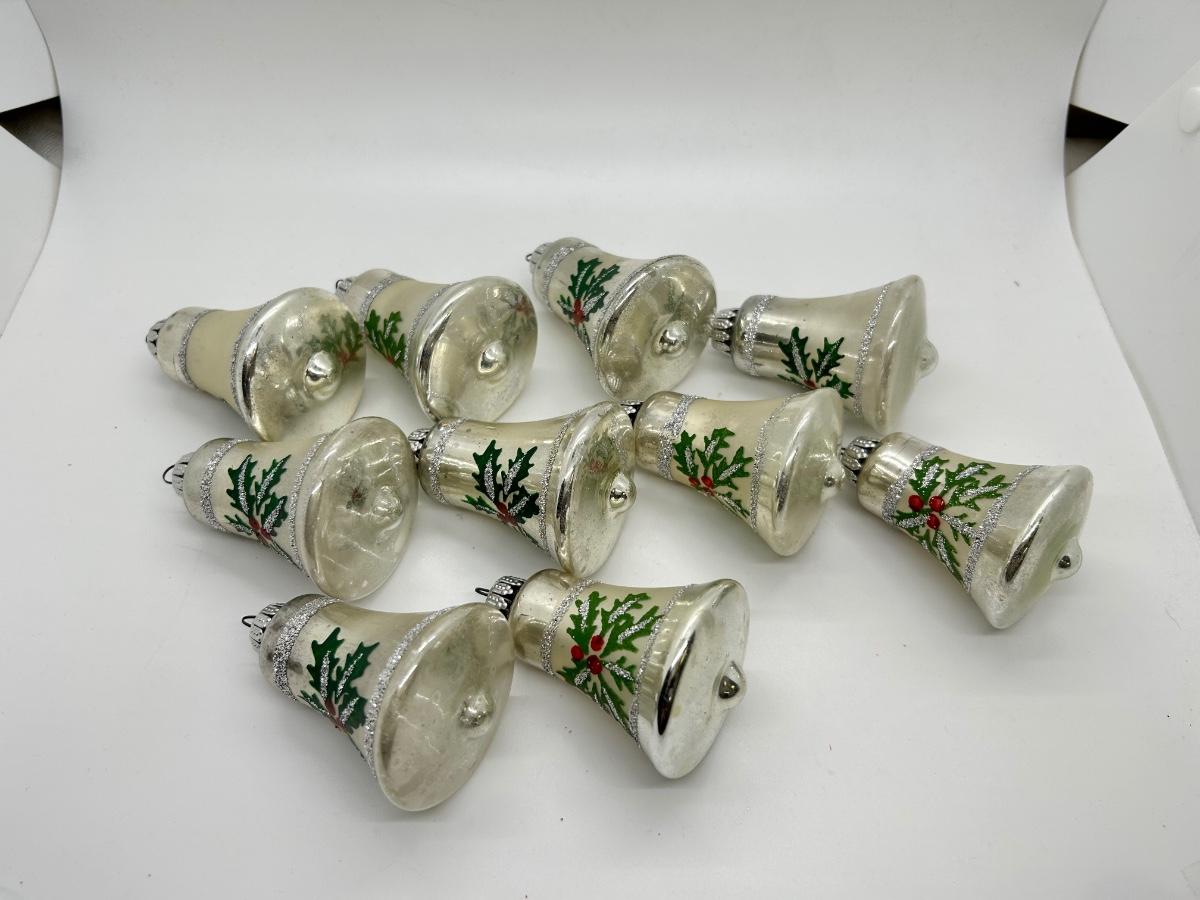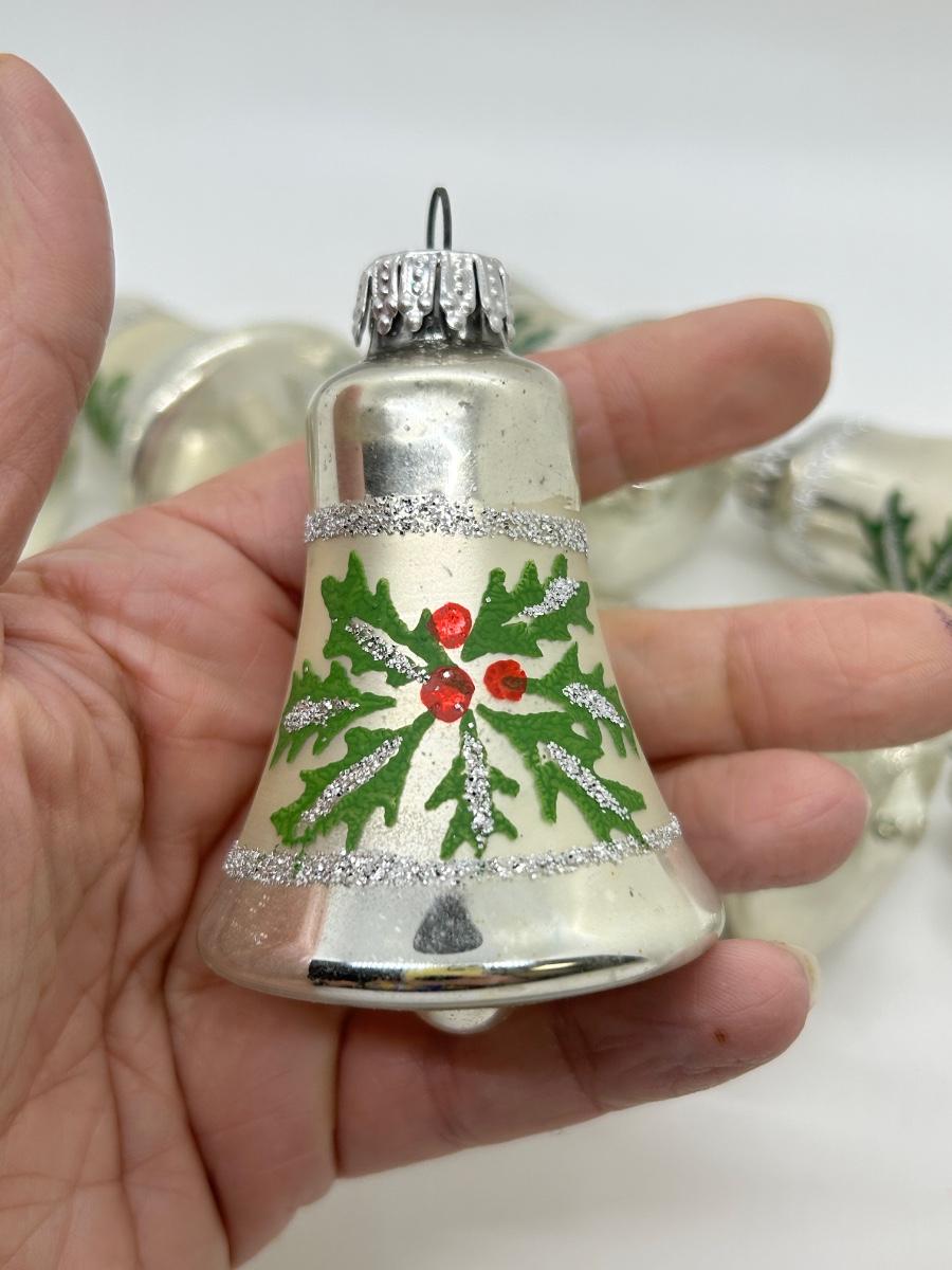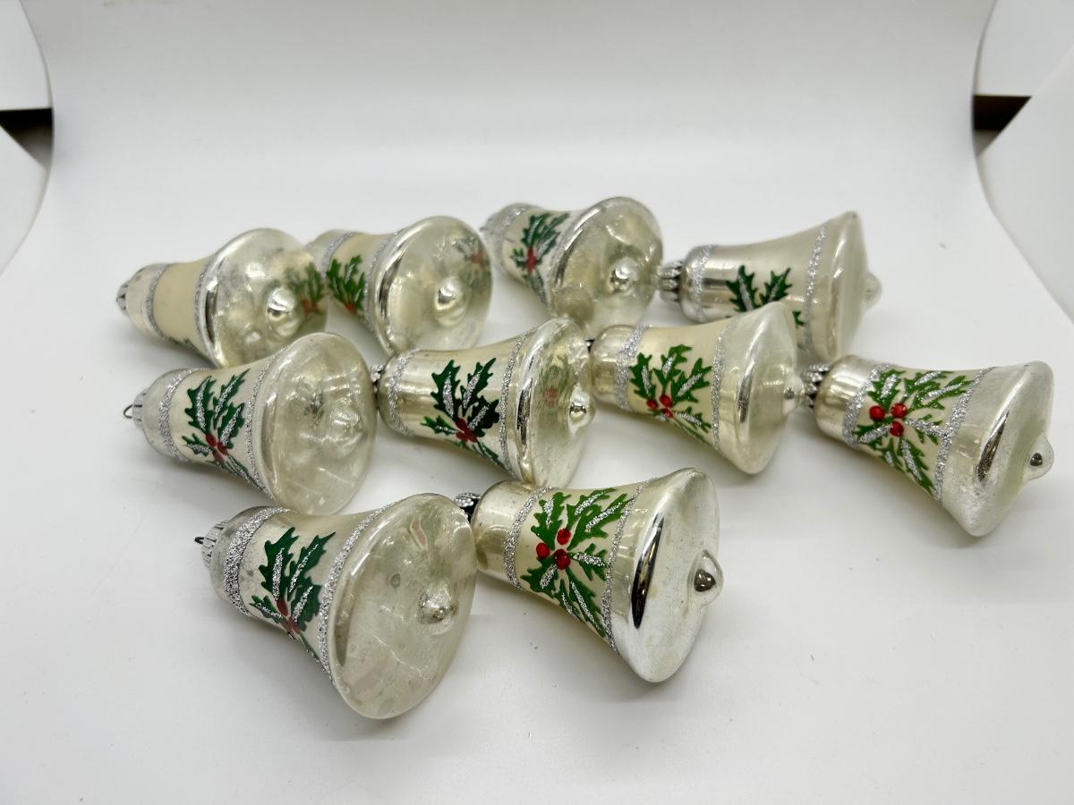 Vintage Blown Glass Bell Shaped Christmas Holiday Tree Ornaments Holly and Glitter West Germany. In good vintage condition. ne broken ornaments. Light wear consistent with age and use. Lot of 10. About 3" size.