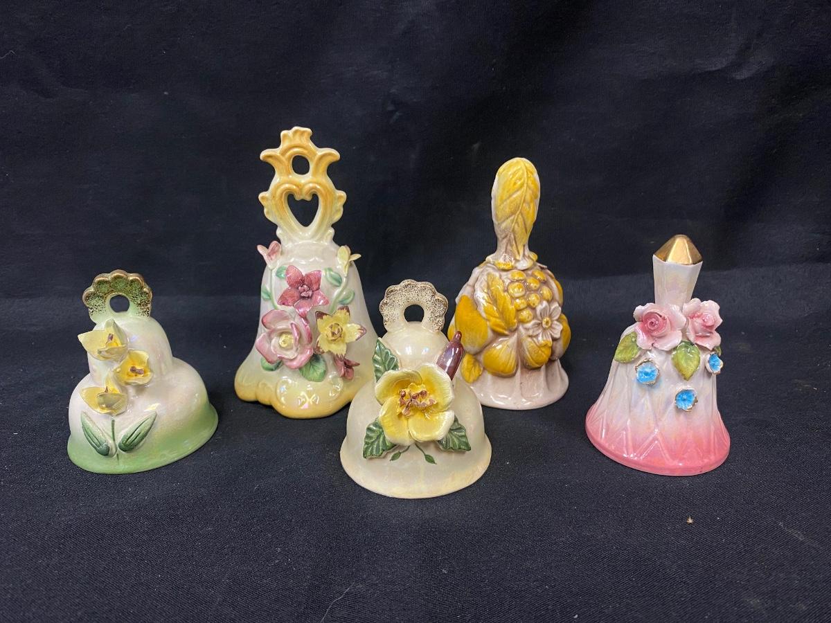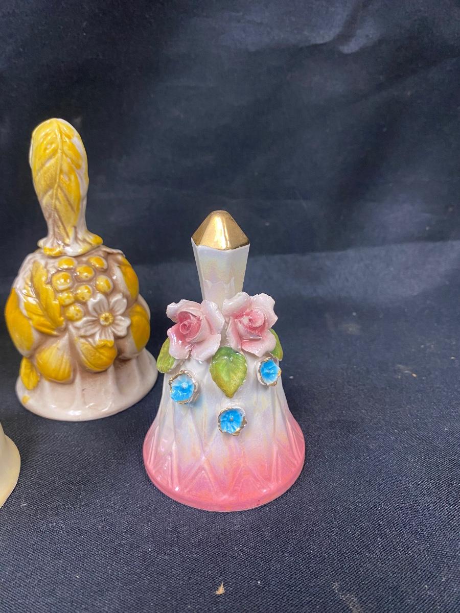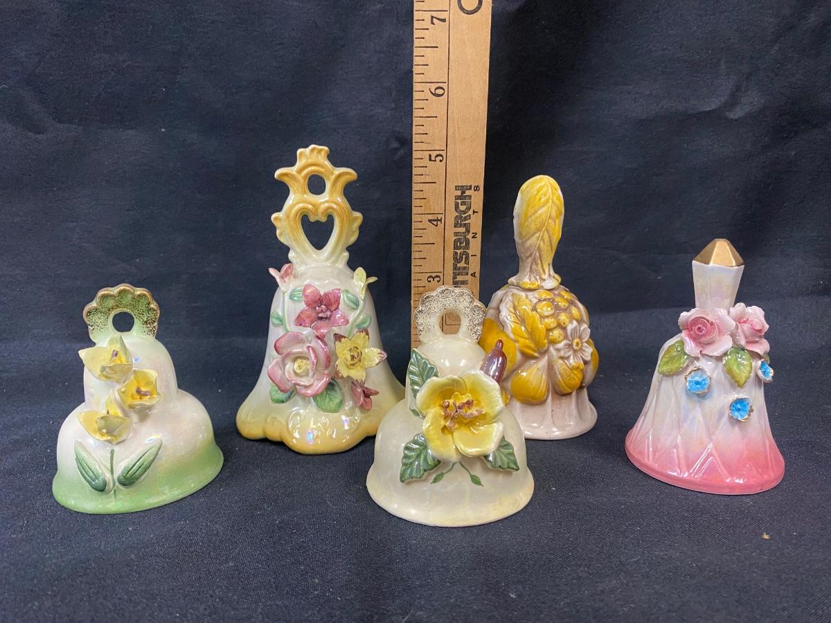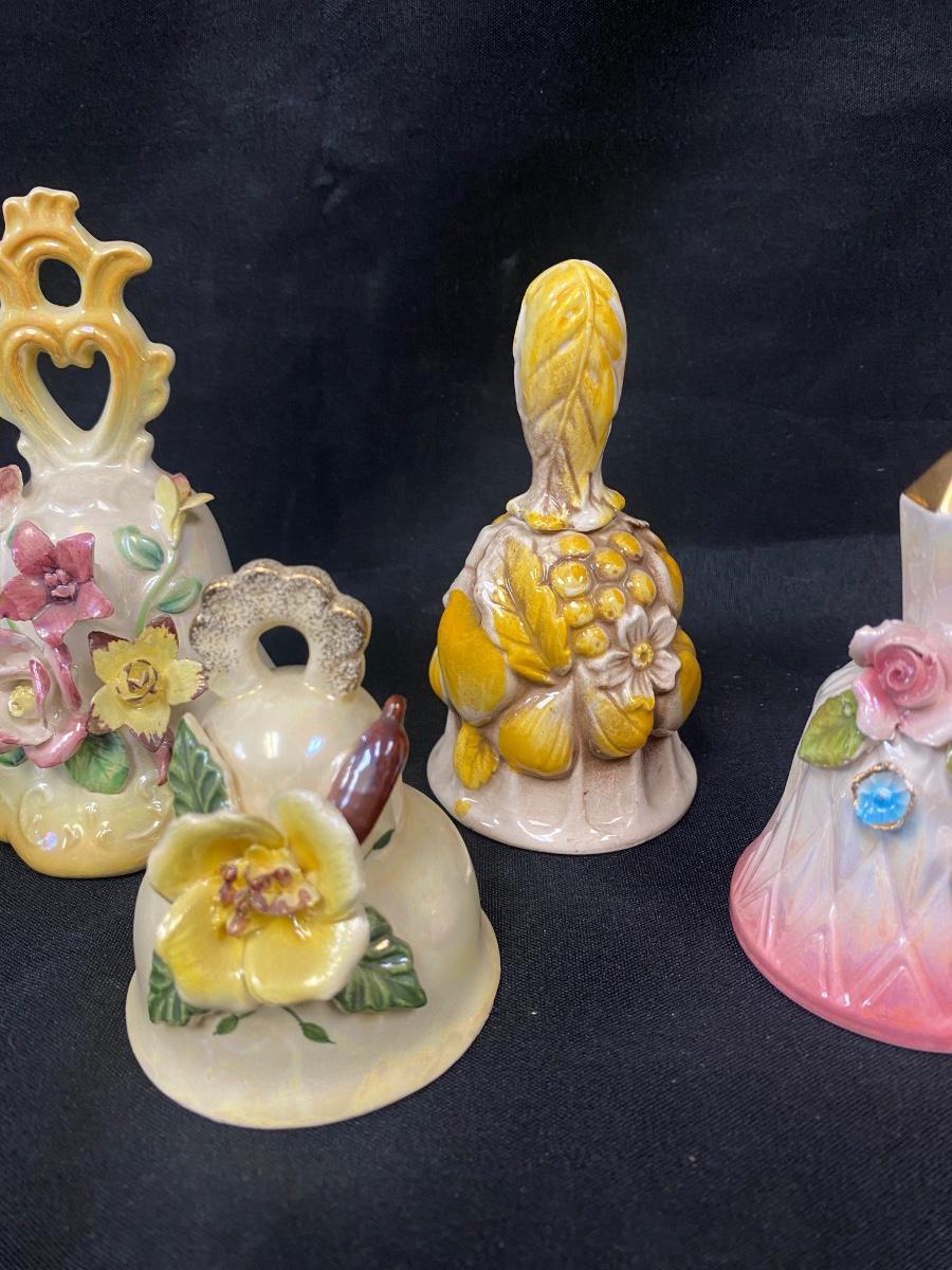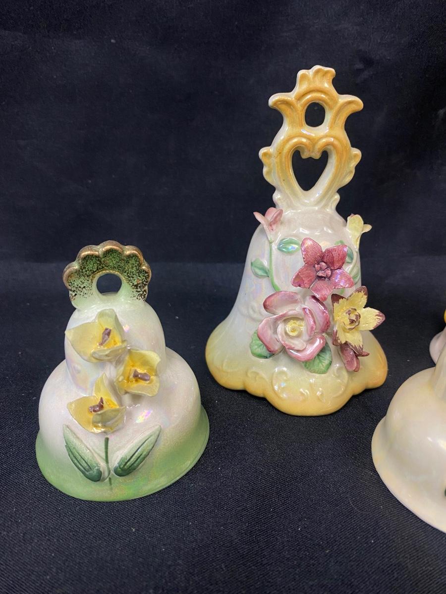Vintage Floral Ceramic Porcelain Bells Iridescent Majolica Capodimonte Styled. In good vintage condition. One is a bit different but all look good.