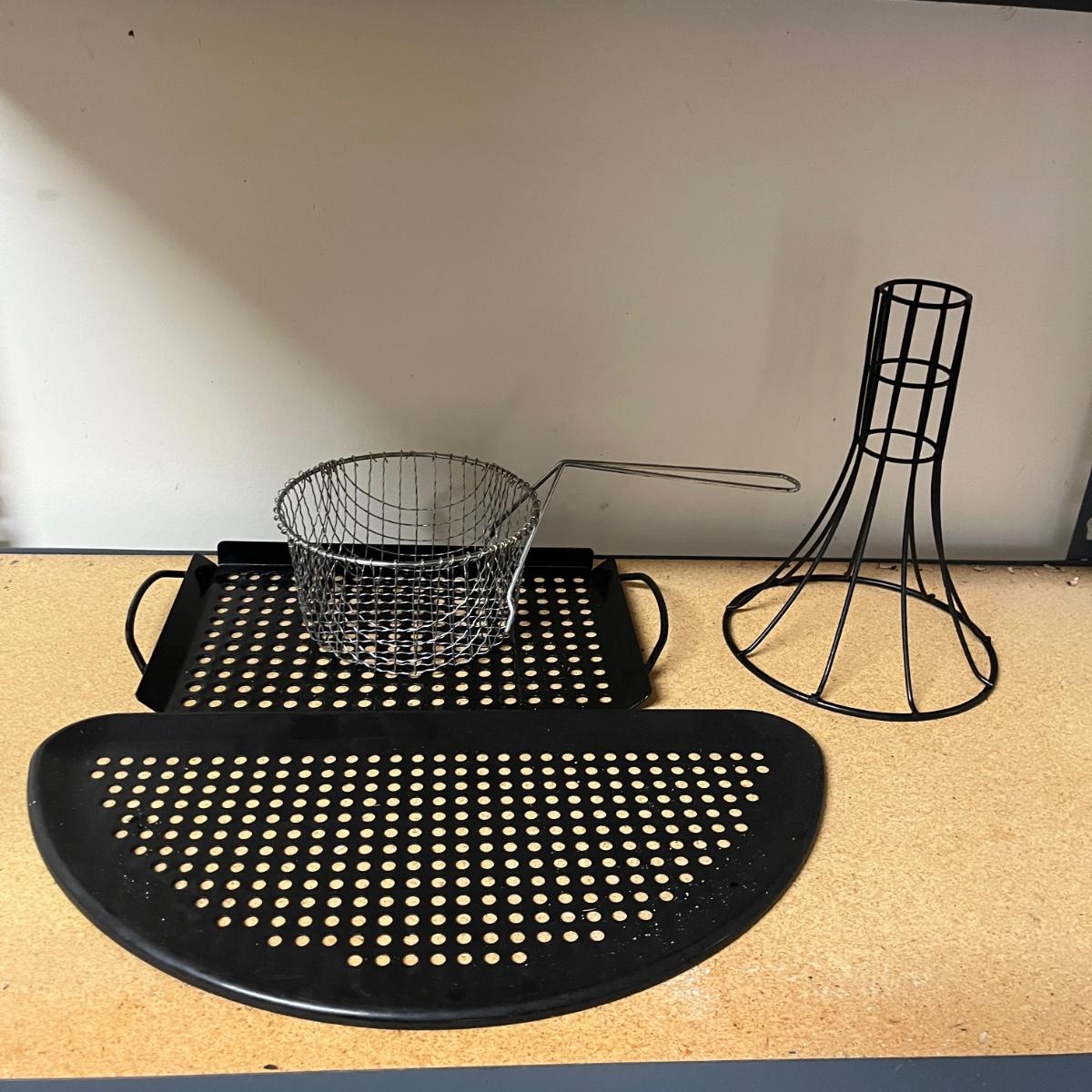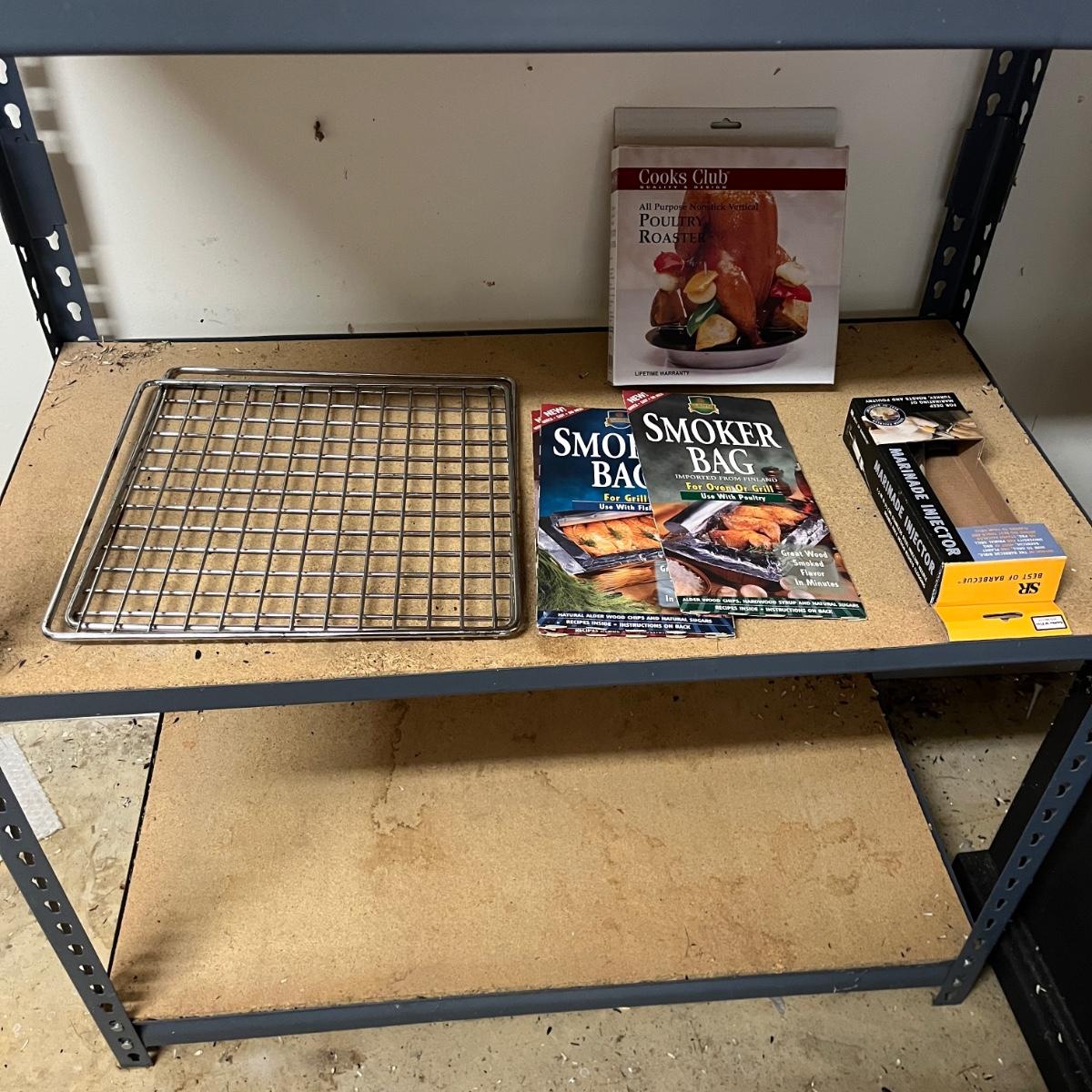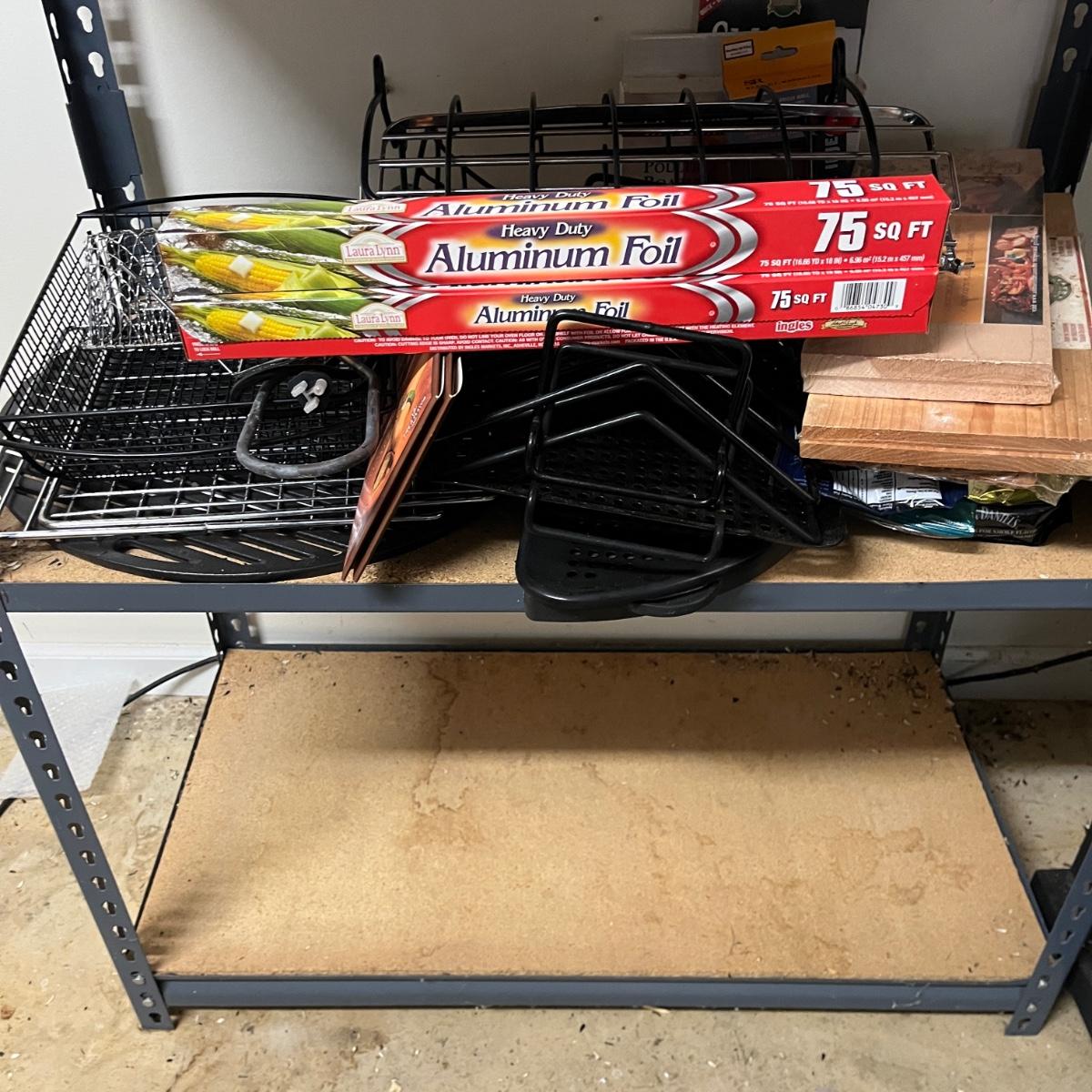 Lot includes cedar planks, metal baskets, electric charcoal starter (not tested), flavor pellets, two new rolls of aluminum foil and more. Largest basket measures 18” x 11” x 3.75”H.
