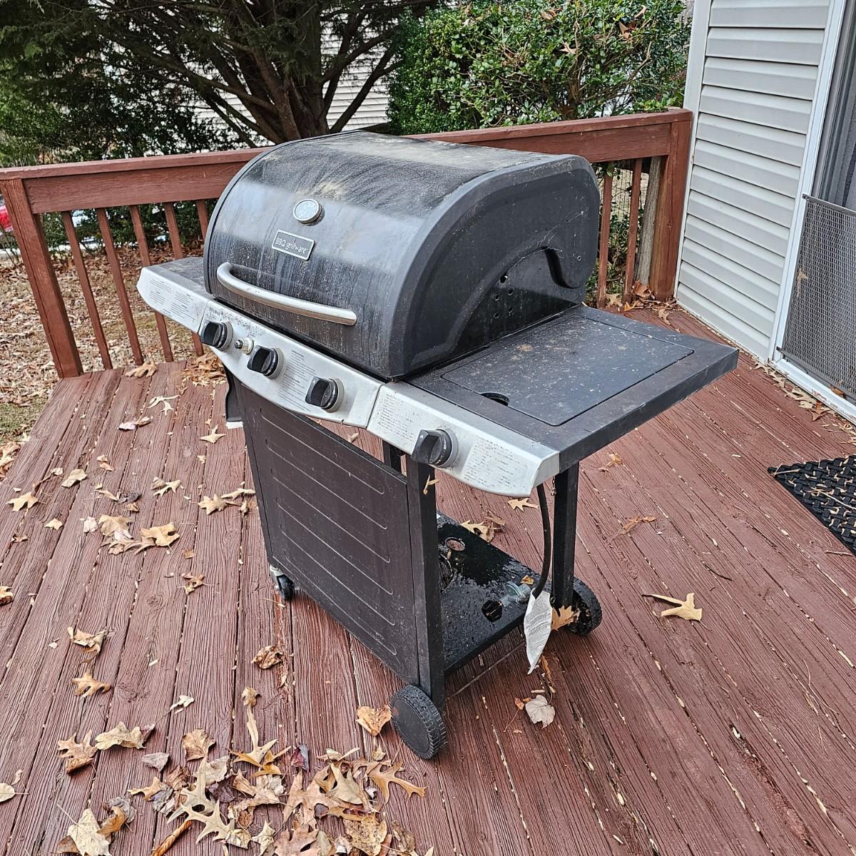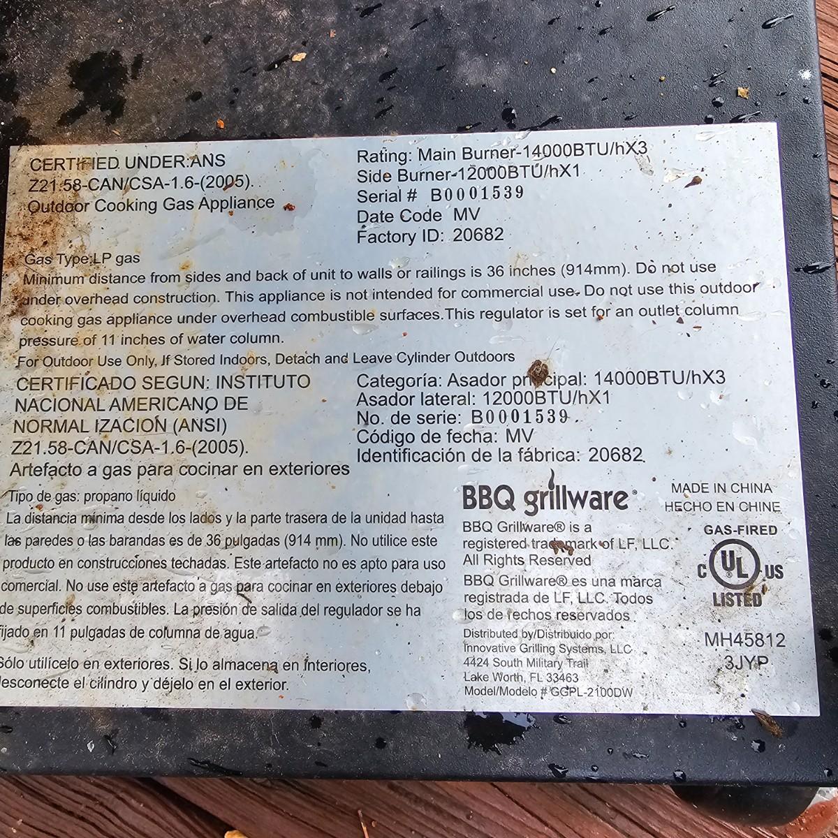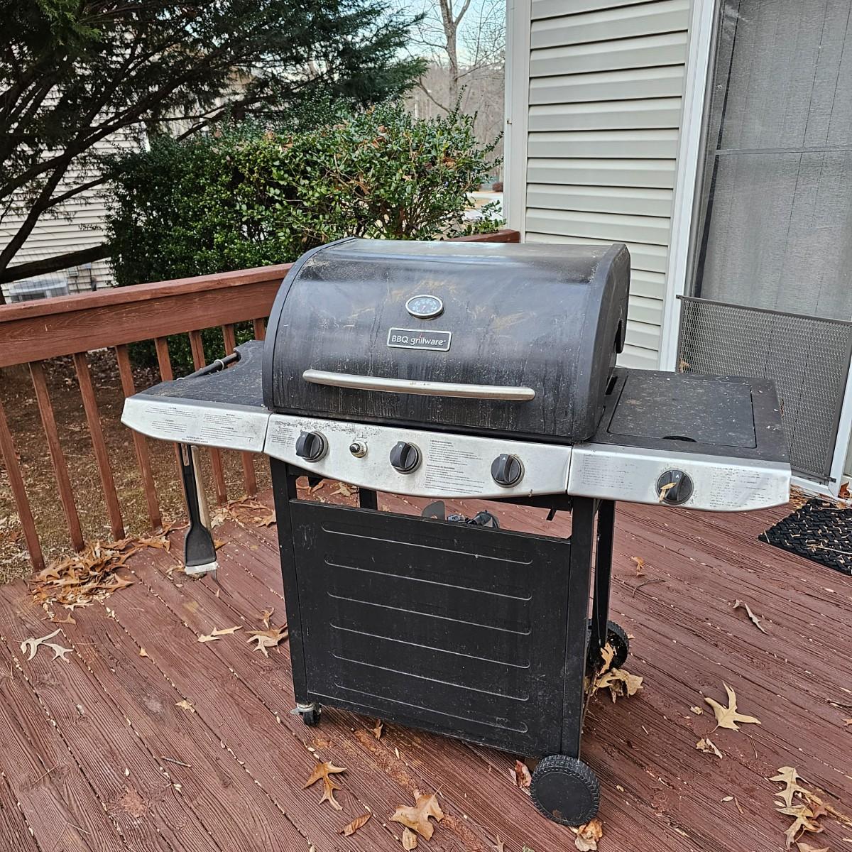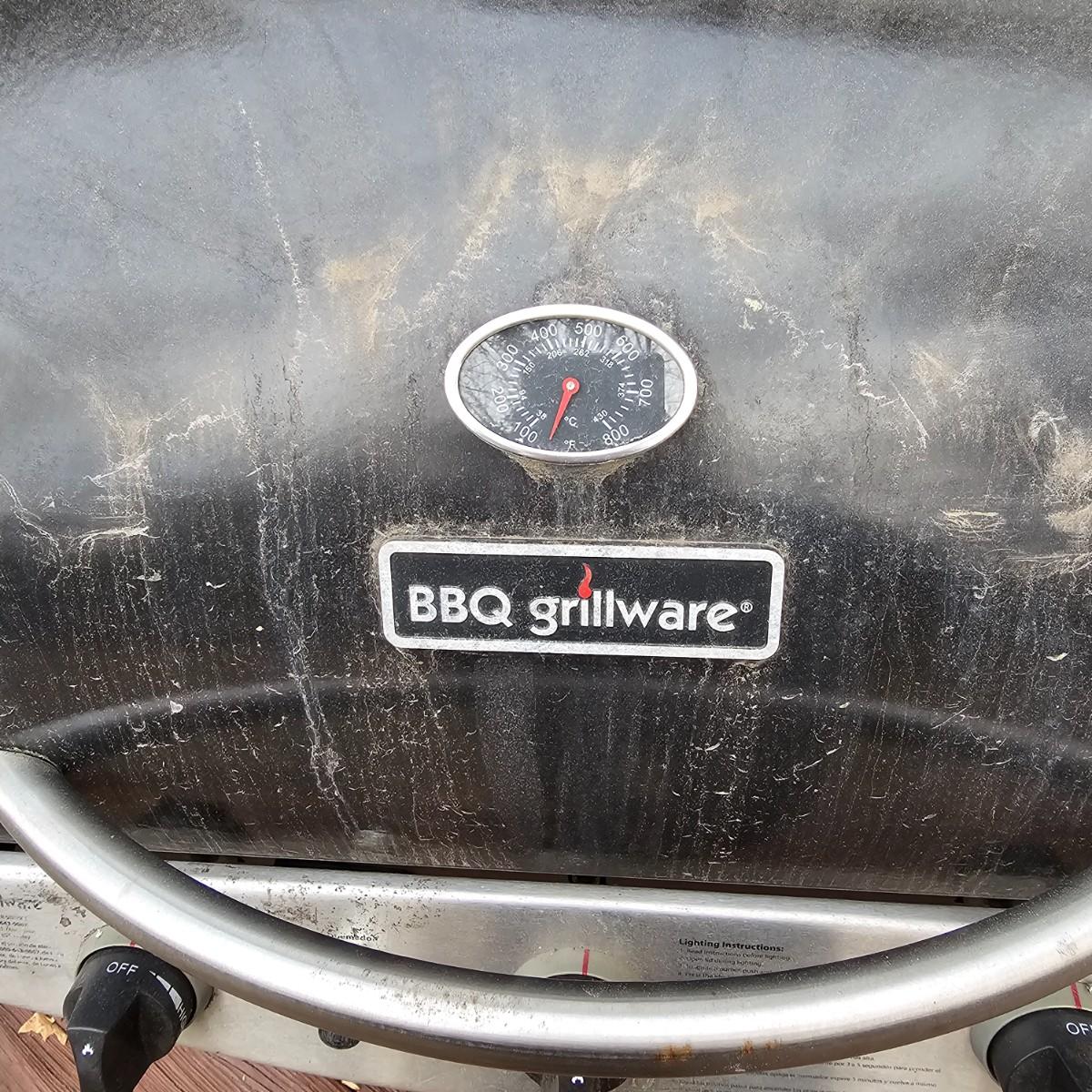 One Grillware brand barbecue grill, three main burners and a side unit. Has built in thermometer in lid, self igniter (untested), and two tools plus cover. Grill measures 52.5" x 23" x 46"H. No LP tank included. Cover has small tear in top. See photos for details. Local pickup only.