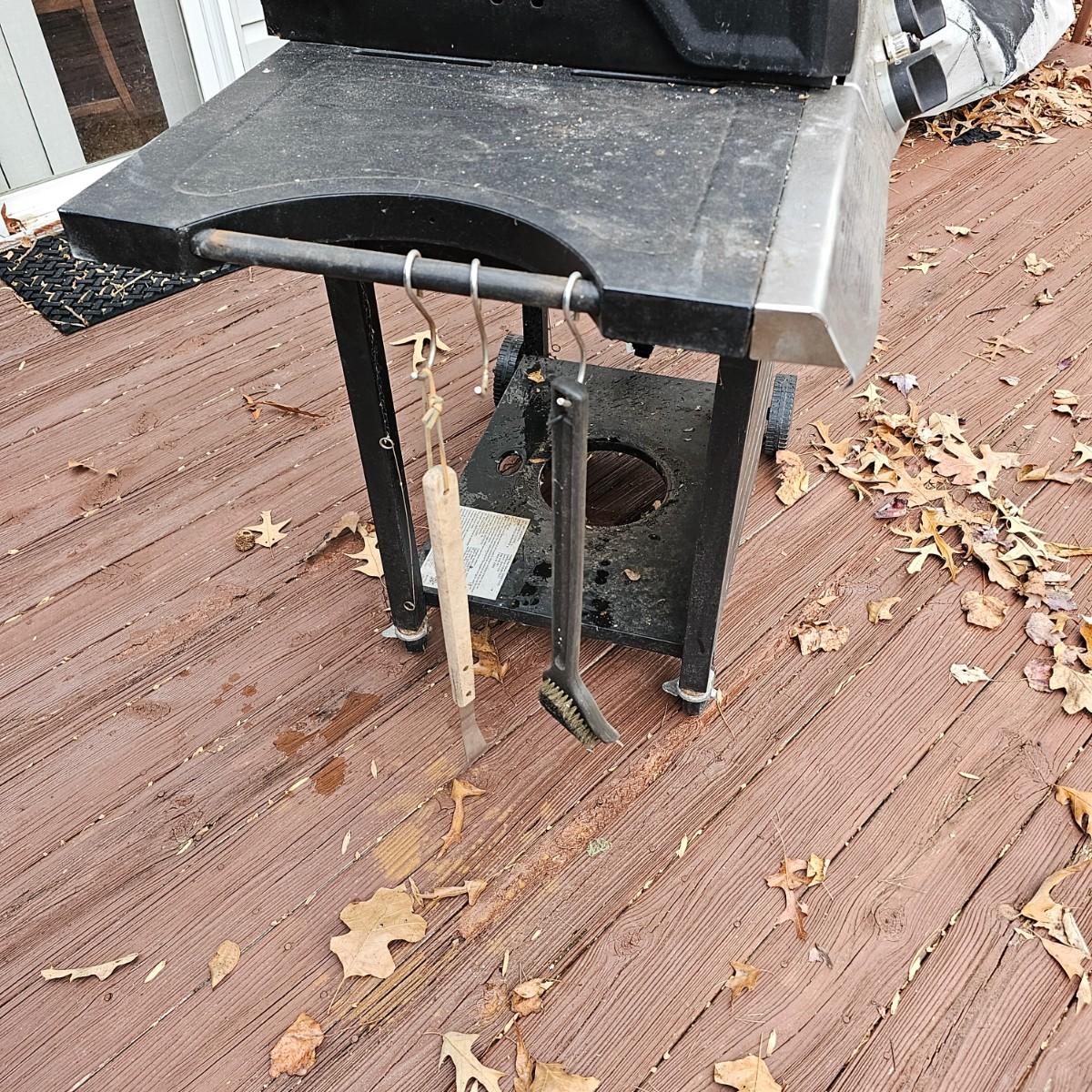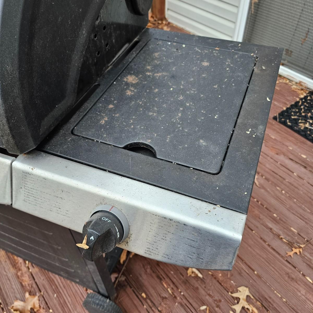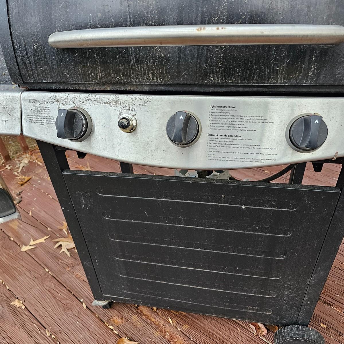 One Grillware brand barbecue grill, three main burners and a side unit. Has built in thermometer in lid, self igniter (untested), and two tools plus cover. Grill measures 52.5" x 23" x 46"H. No LP tank included. Cover has small tear in top. See photos for details. Local pickup only.