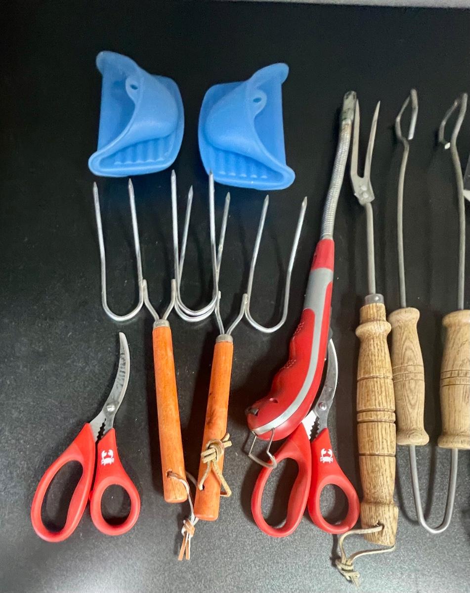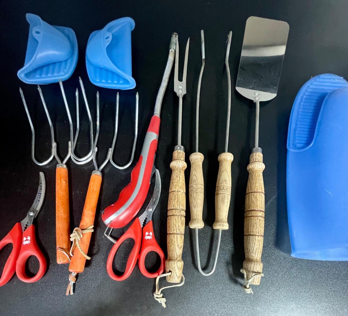Lot includes spatula, tongs and fork; heavy silicone hot pad glove and 2 finger-thumb grips, butane lighter, 2 scissors for cutting/breaking crab legs, and a pair of meat forks.