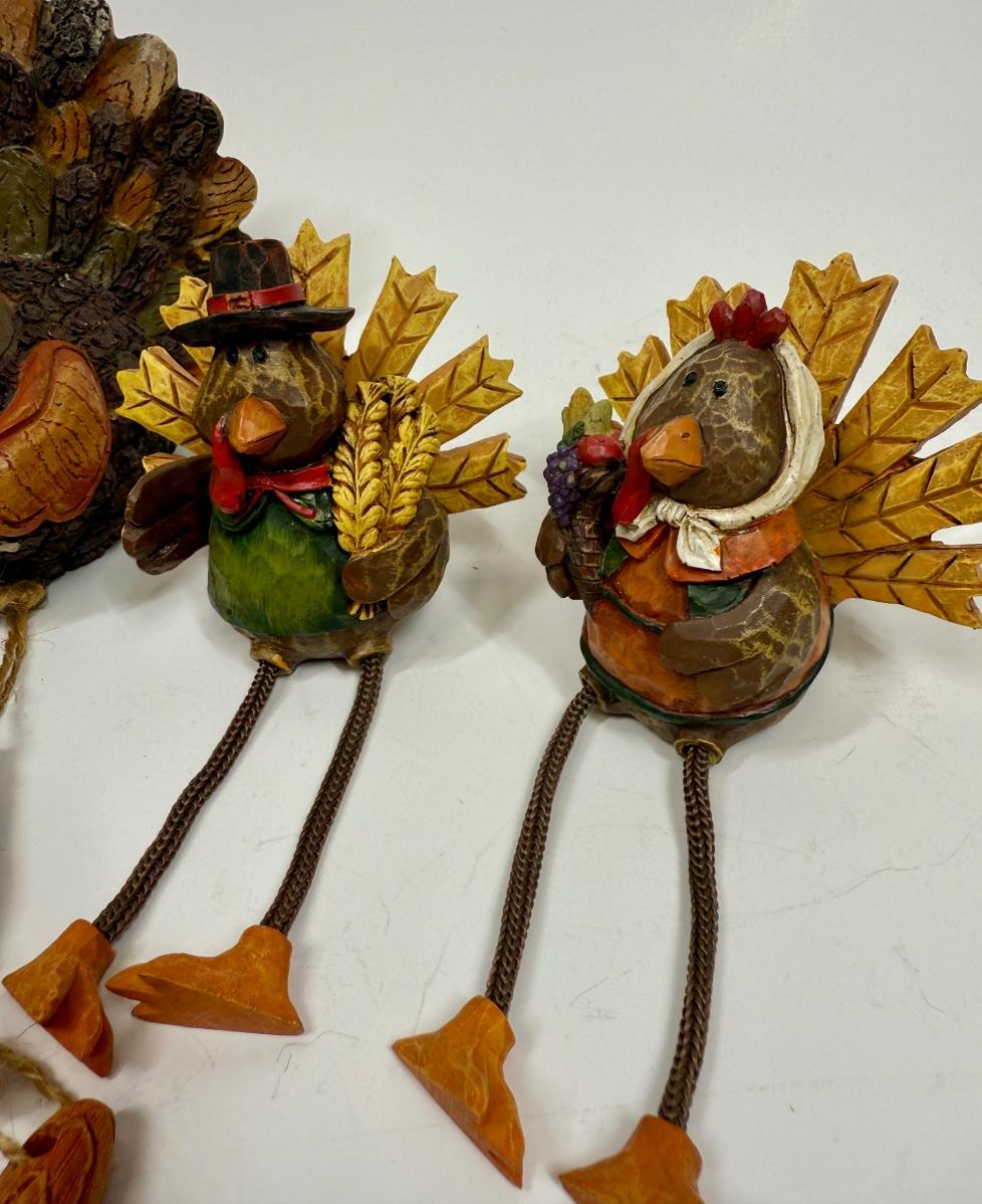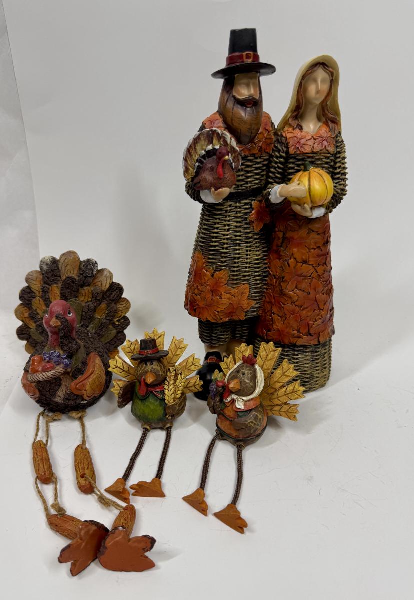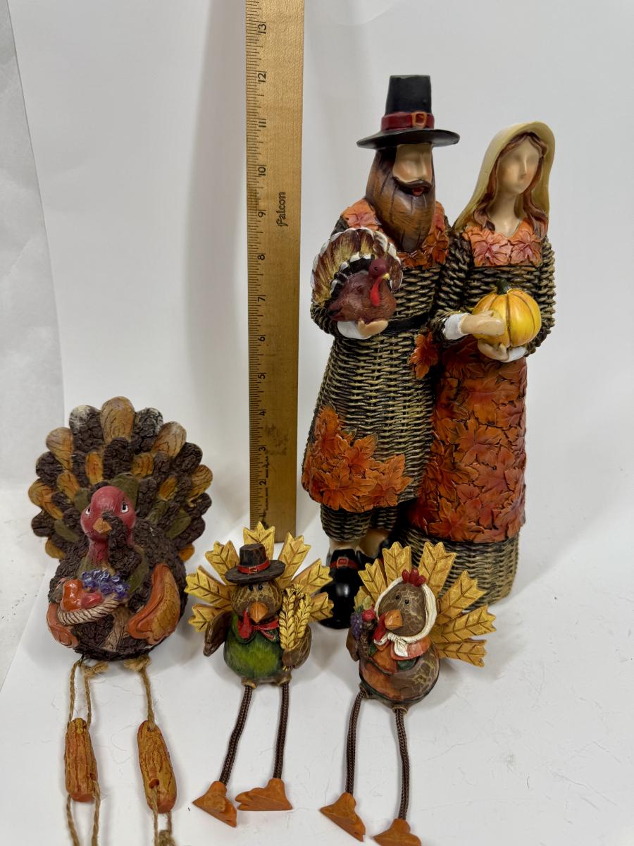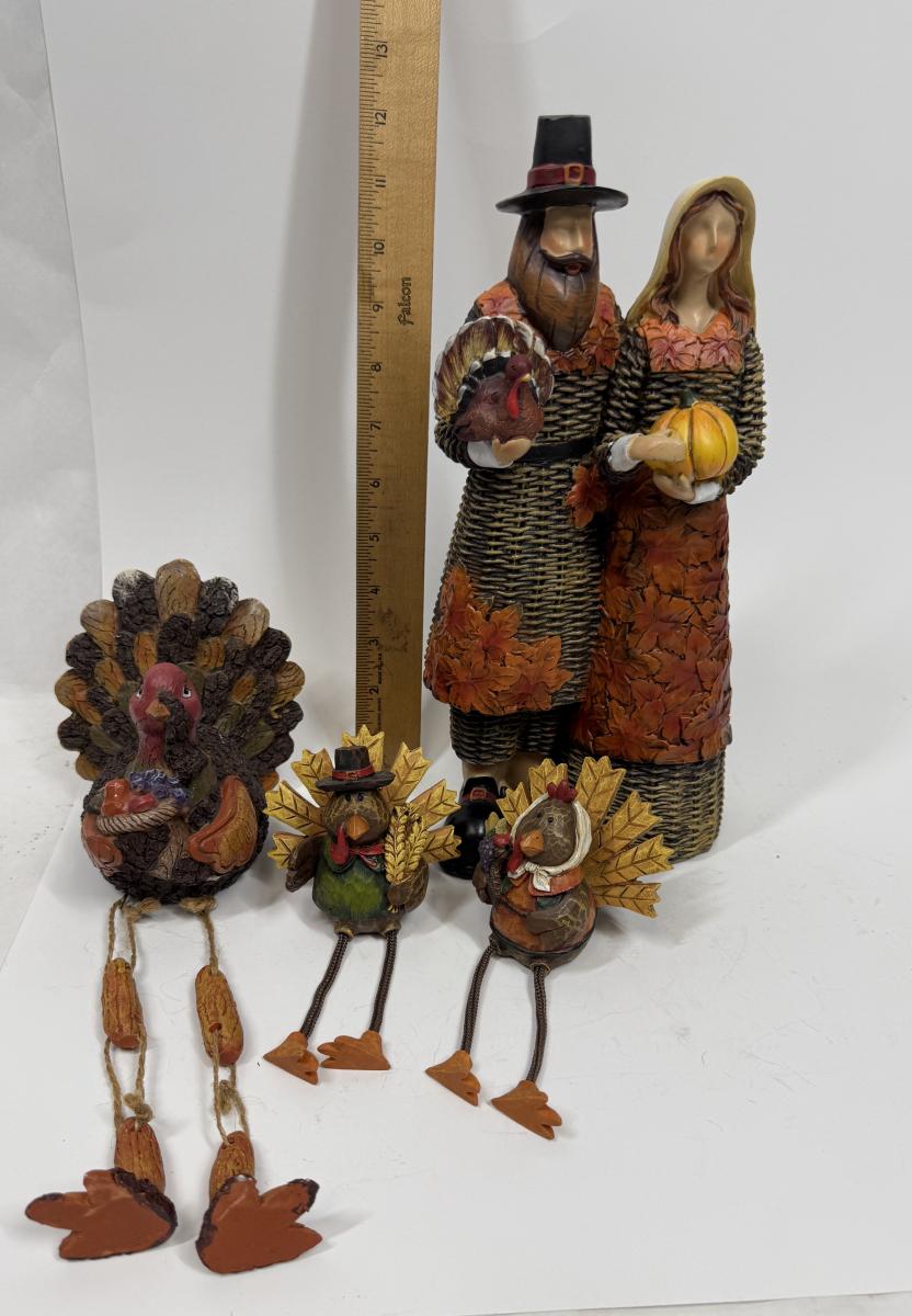 Thanksgiving Decor lot - Pilgrim Couple with 3 Turkey Shelf-sitters