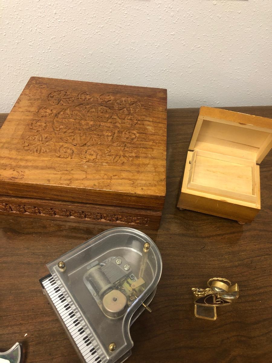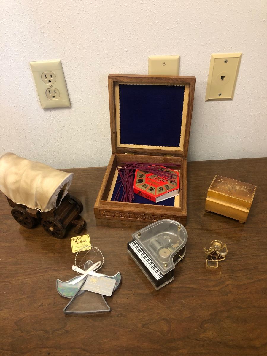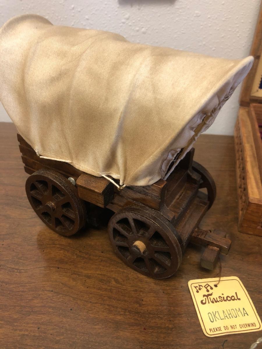 Covered wagon and piano are music boxes but do not appear to play. Small box also a music box and does play