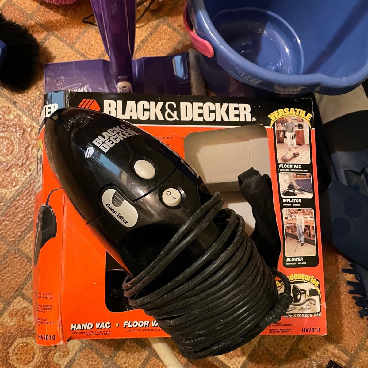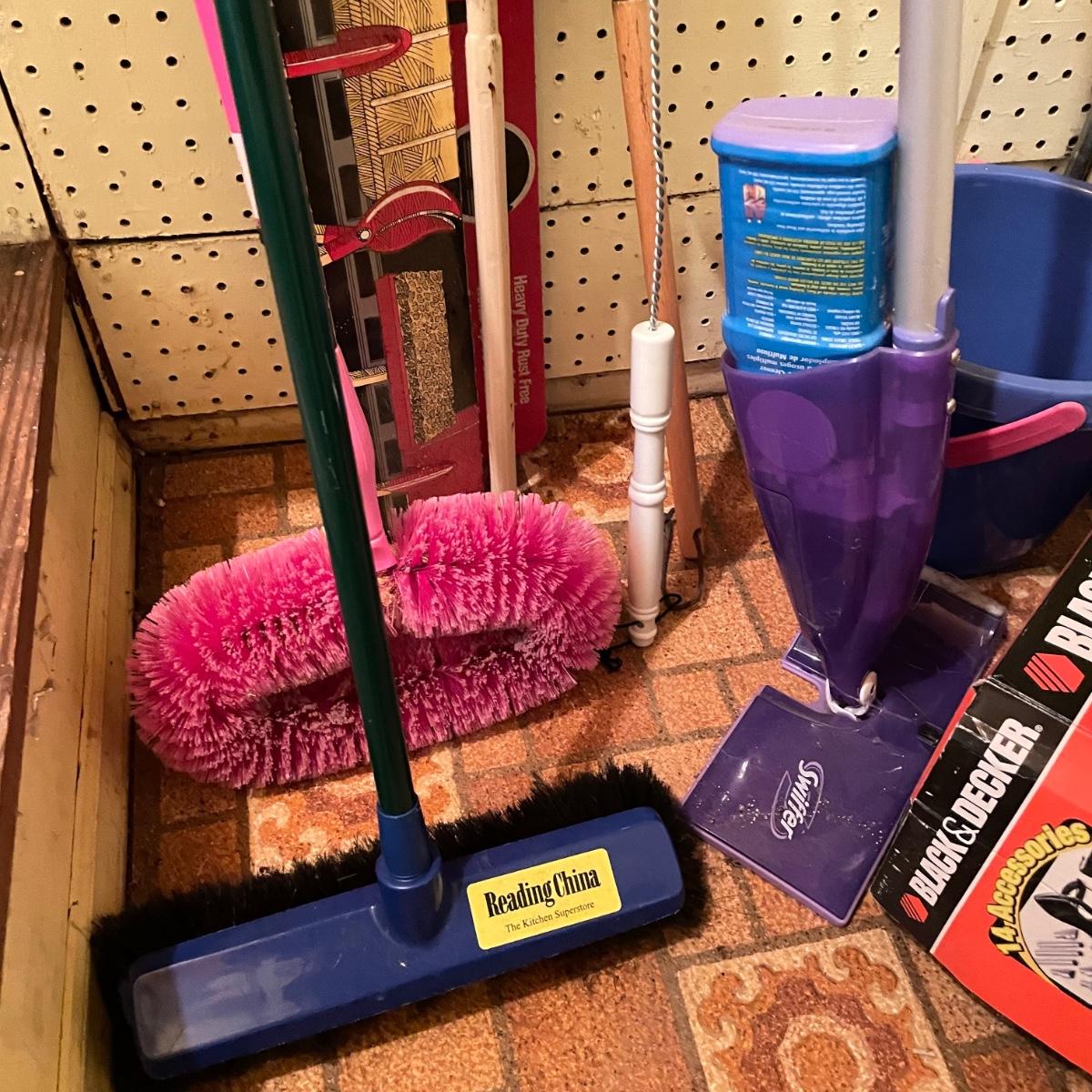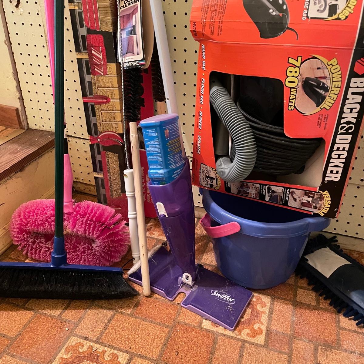 Black & Decker hand vac also boasts floor vac, blower and inflator with multiple attachments (it appears to have all included). Lot also includes a Swiffer, two sweepers, a small push broom along with a few duster/coil cleaners. Other useful items include kitchen sink items and an 8’ garage organizer. See images for all items. The hand vac powered on when plugged in. Pads will need to be purchased separately for the Swiffer and one sweeper. Local pick up only.