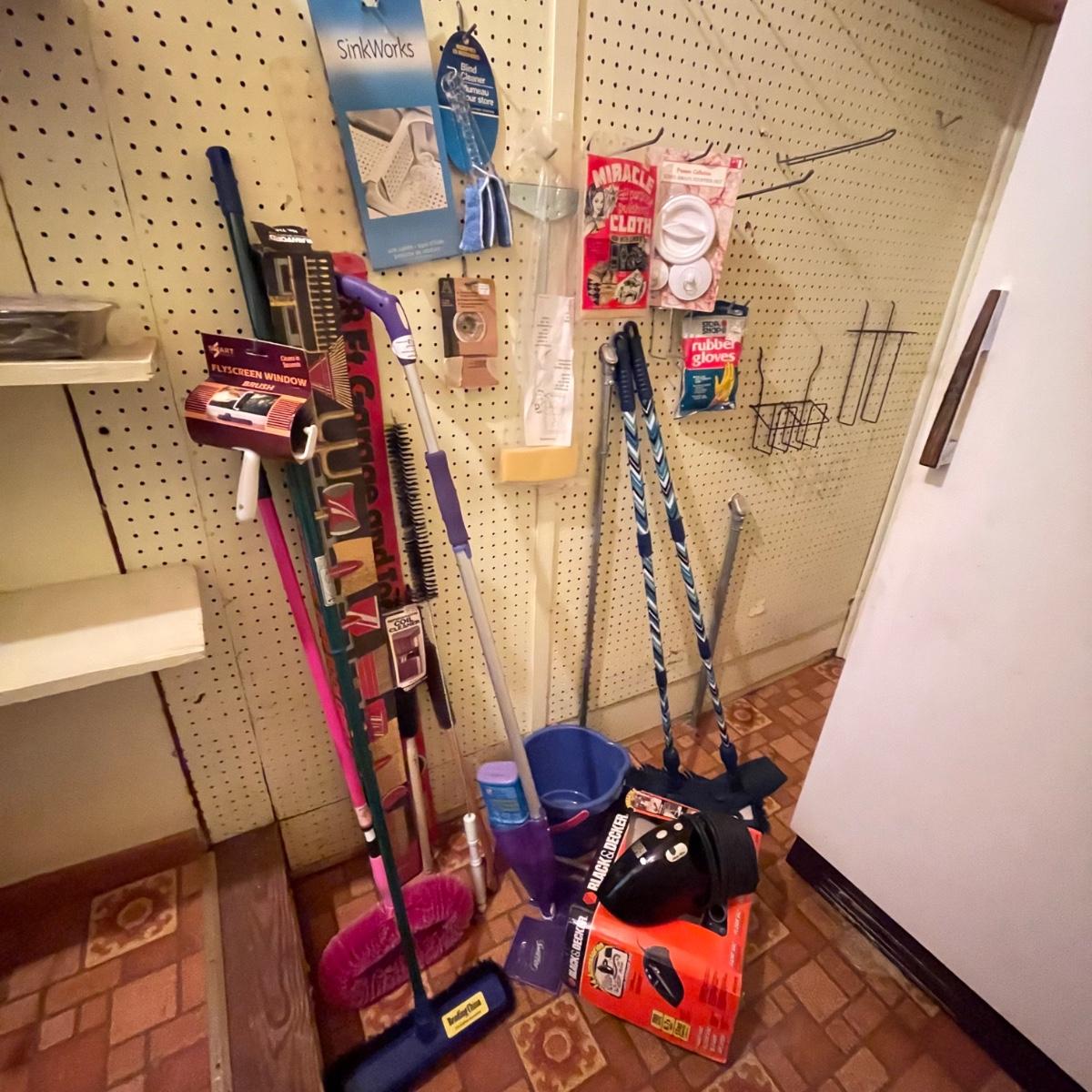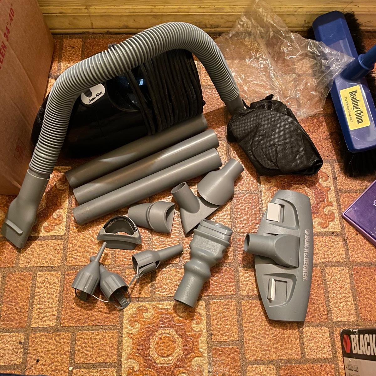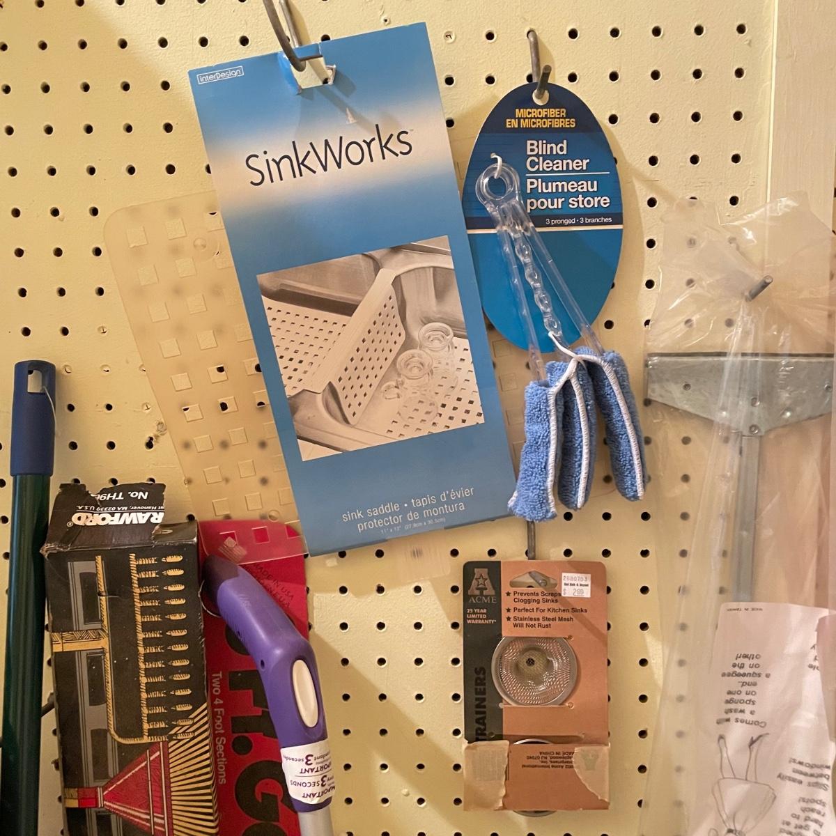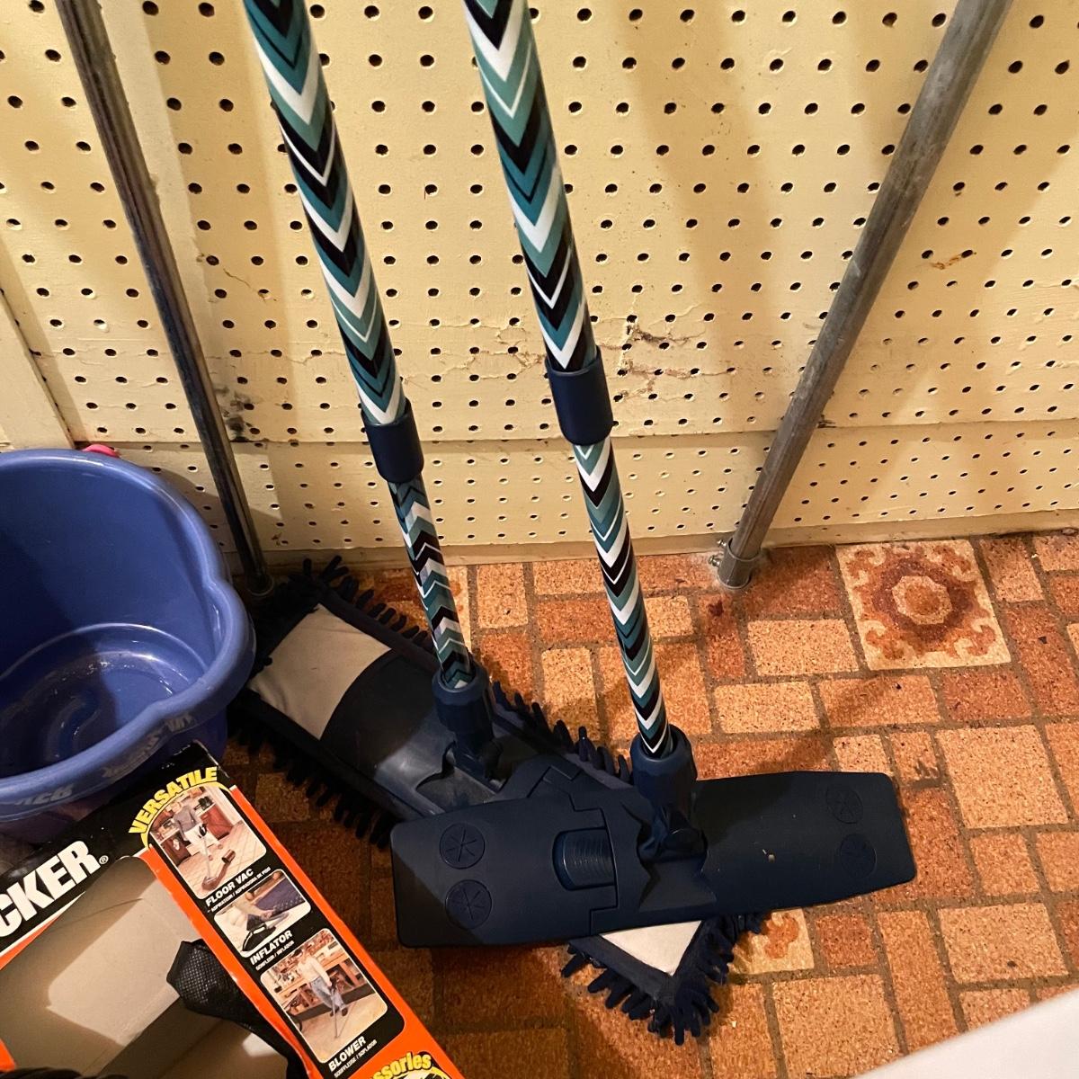 Black & Decker hand vac also boasts floor vac, blower and inflator with multiple attachments (it appears to have all included). Lot also includes a Swiffer, two sweepers, a small push broom along with a few duster/coil cleaners. Other useful items include kitchen sink items and an 8’ garage organizer. See images for all items. The hand vac powered on when plugged in. Pads will need to be purchased separately for the Swiffer and one sweeper. Local pick up only.
