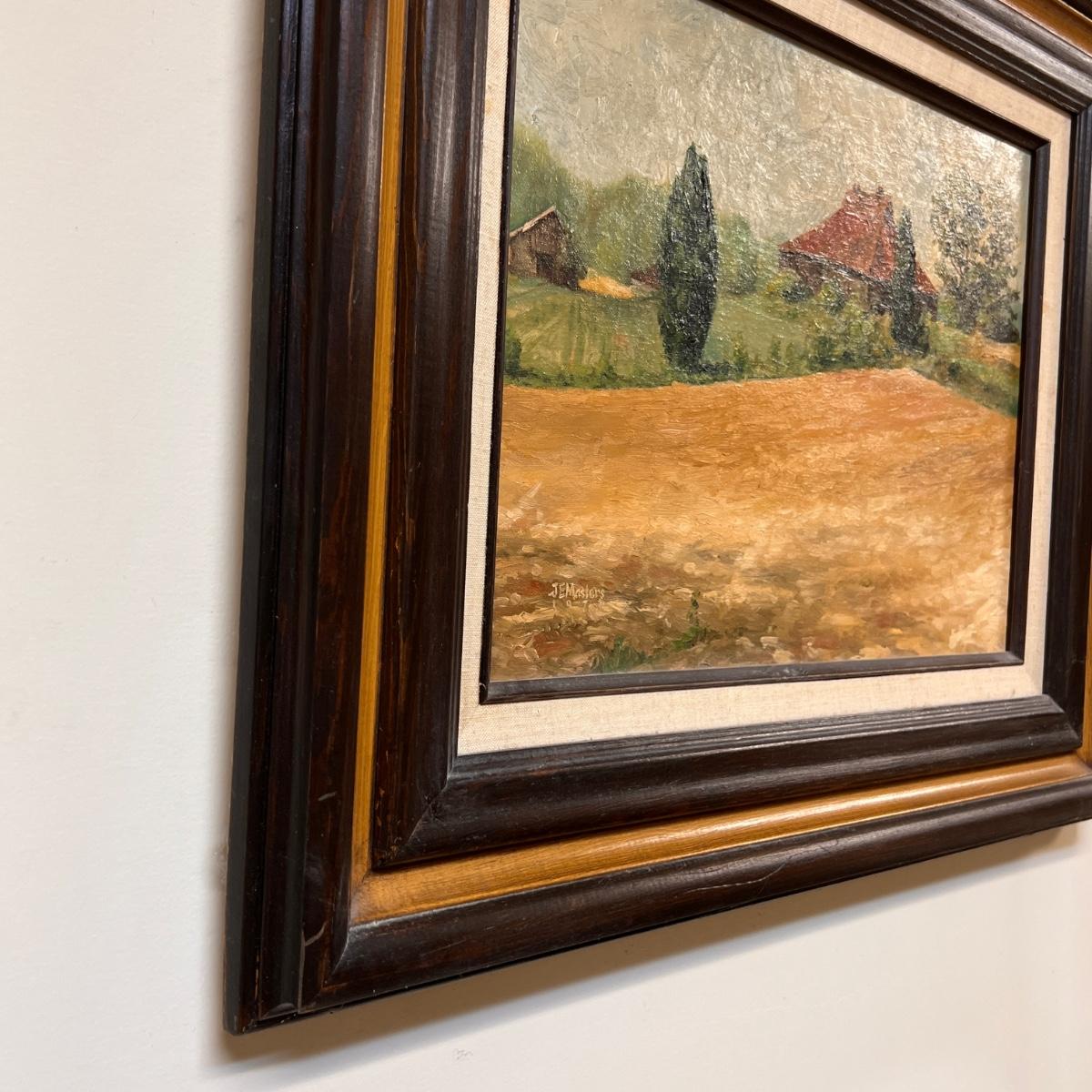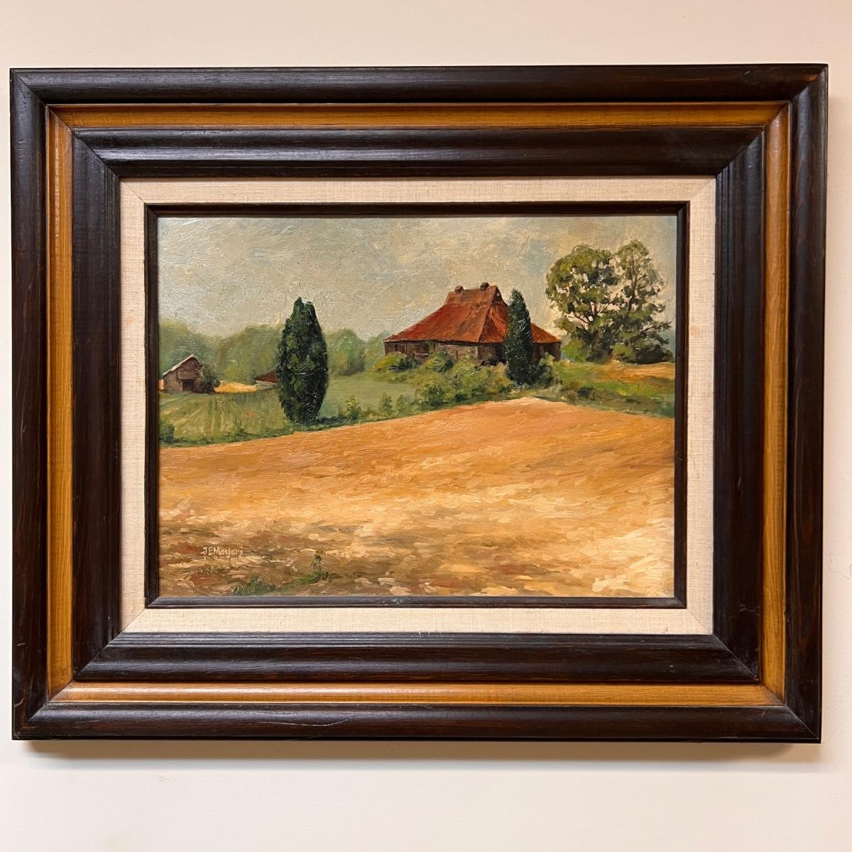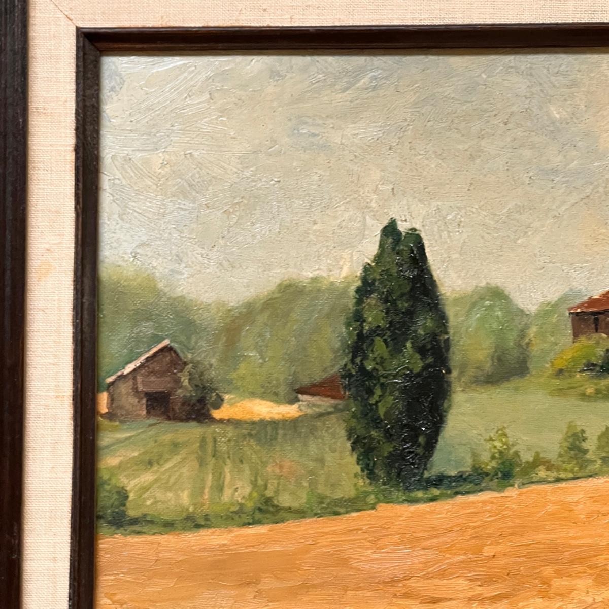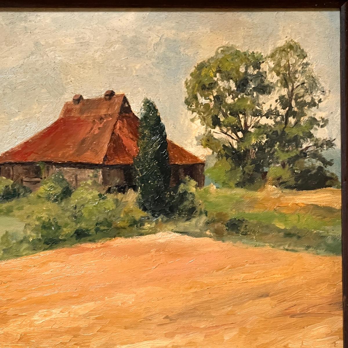 Professionally framed with linen liner house portraiture landscape oil painting entitiled "Old Barn - Hamilton Farm". Beveled wooden two tone frame.
