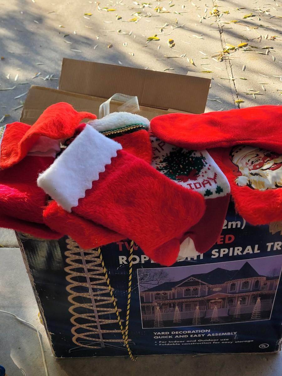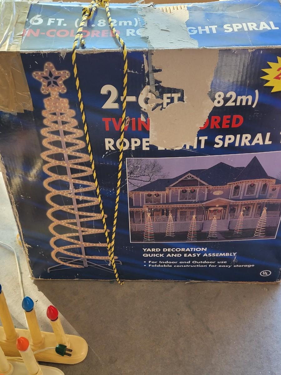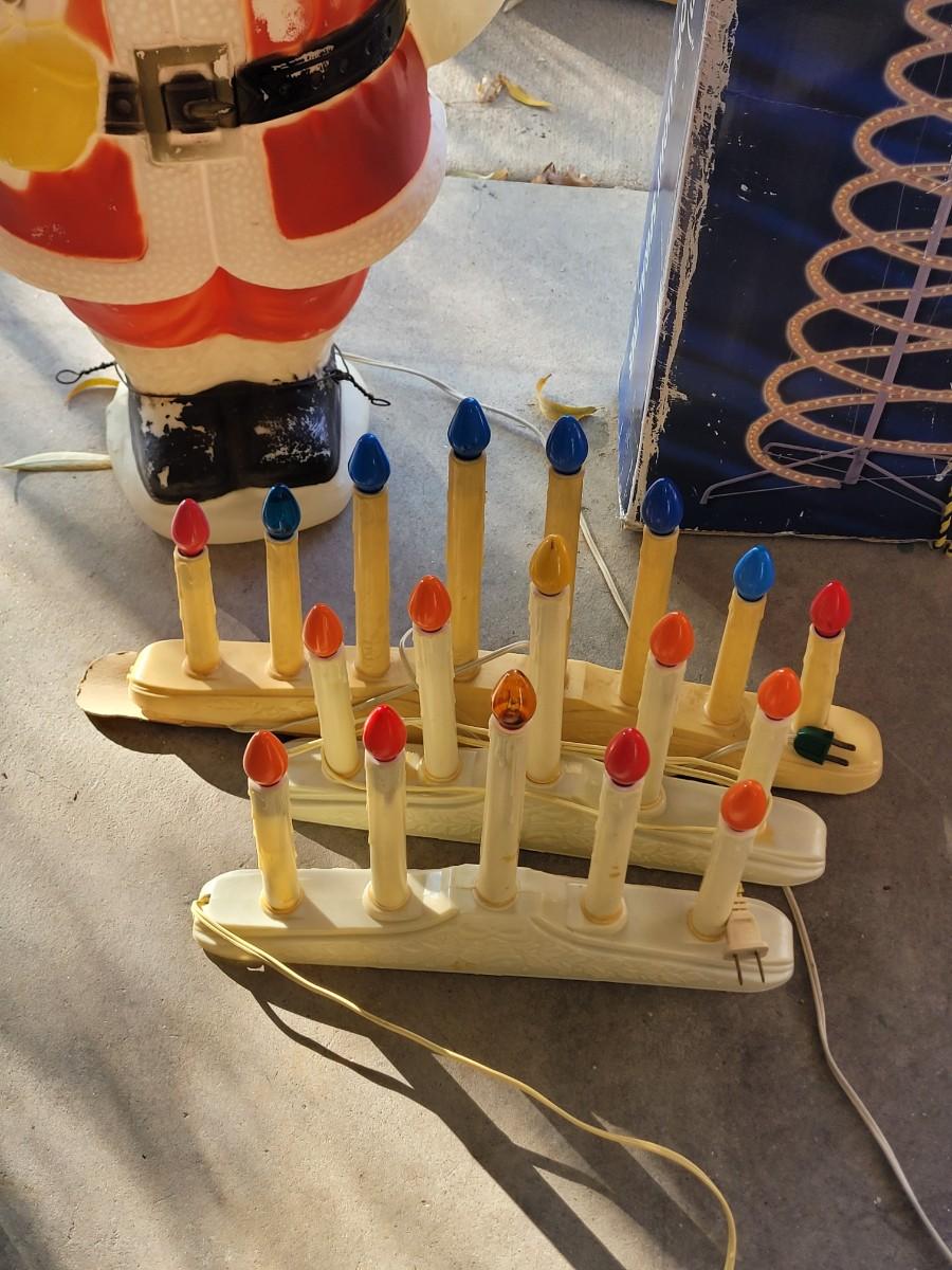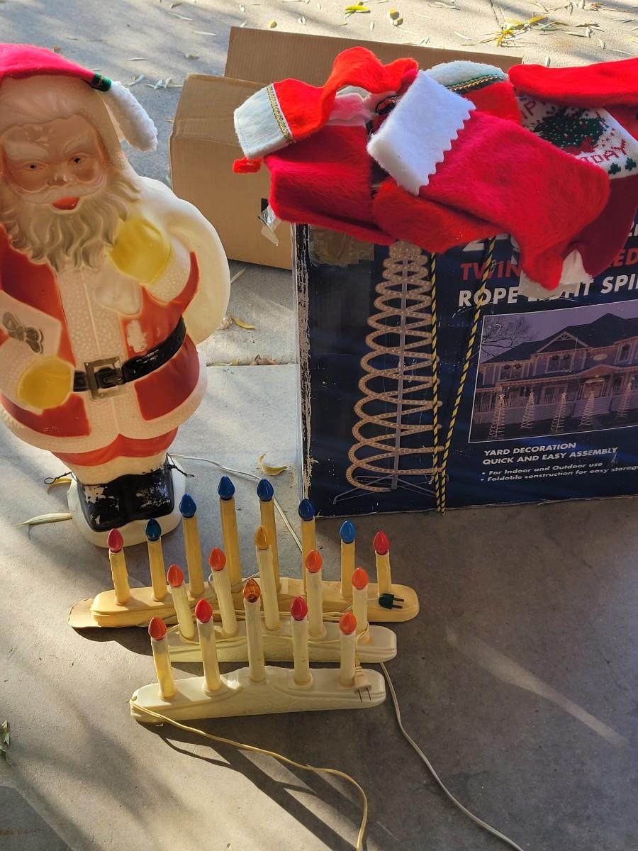 Two 6 foot rope light spiral trees.Three electric plastic candelabras, working, a couple of bulbs are out one santa clause who needs a bulb and maybe a little paint, stockings for craft projects. NOTE, LAST POC IS ADDITIONAL CANDELABRA THAT I found, there are 4 total
