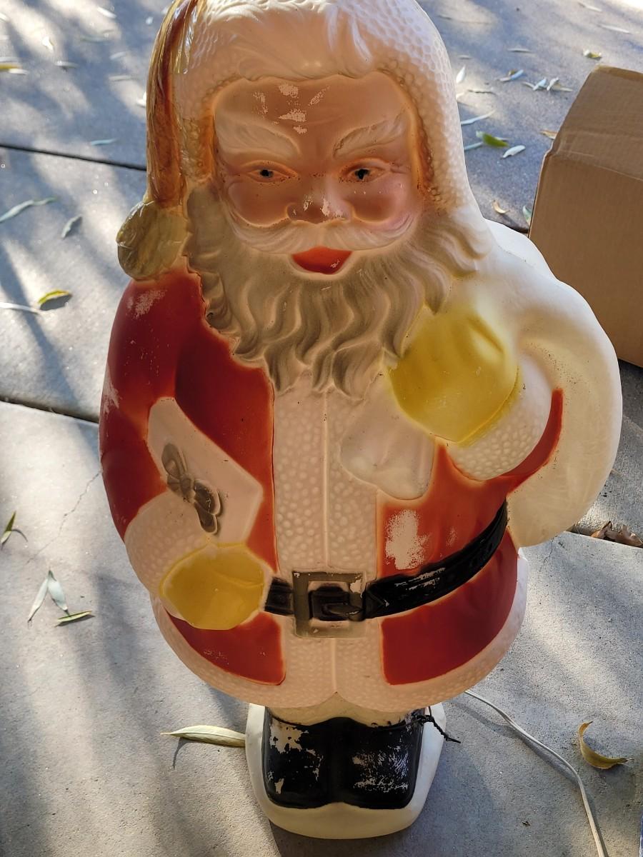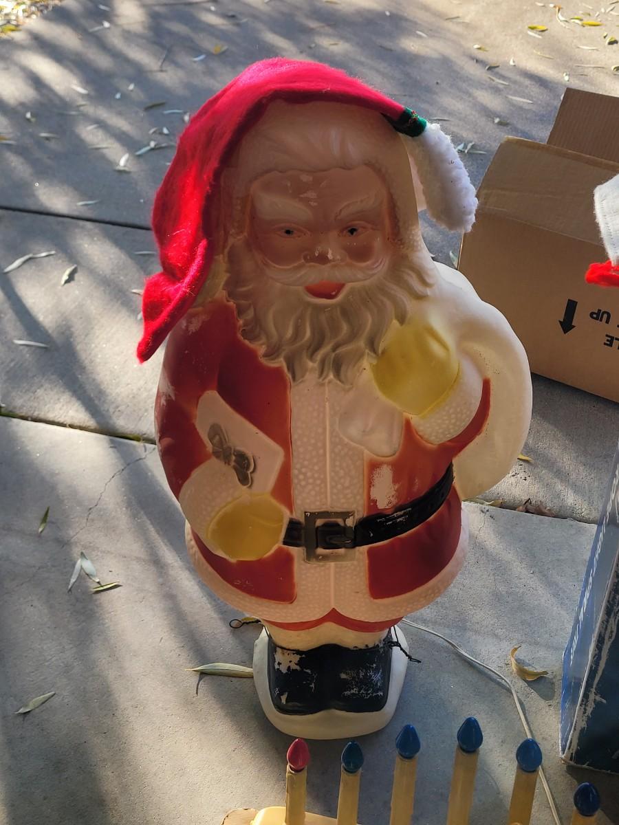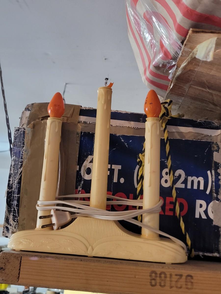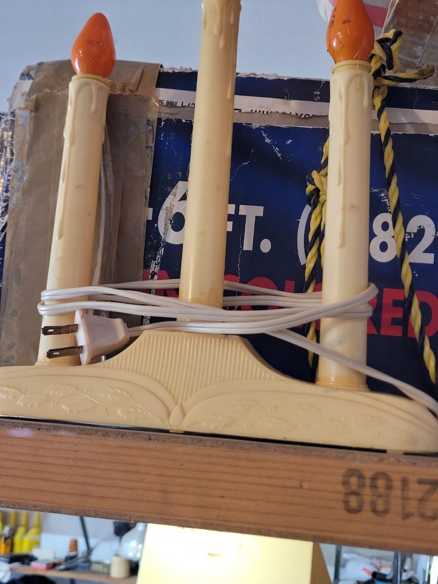Two 6 foot rope light spiral trees.Three electric plastic candelabras, working, a couple of bulbs are out one santa clause who needs a bulb and maybe a little paint, stockings for craft projects. NOTE, LAST POC IS ADDITIONAL CANDELABRA THAT I found, there are 4 total
