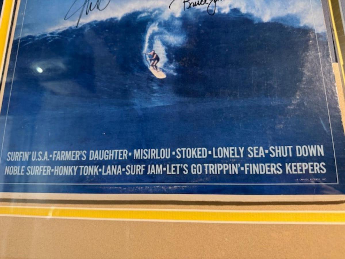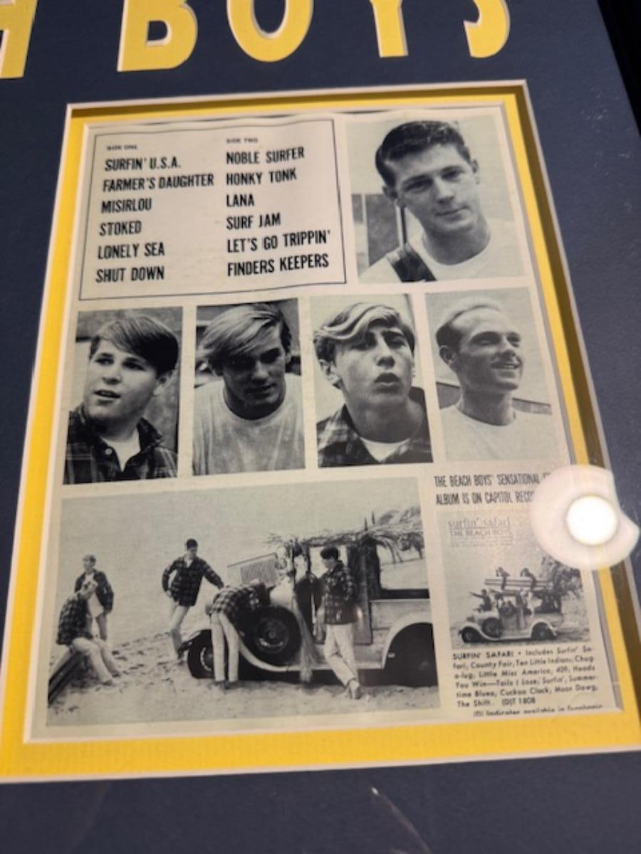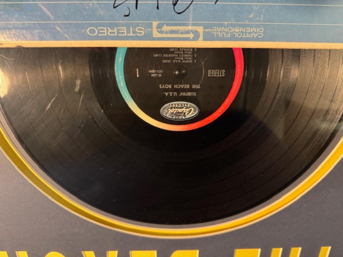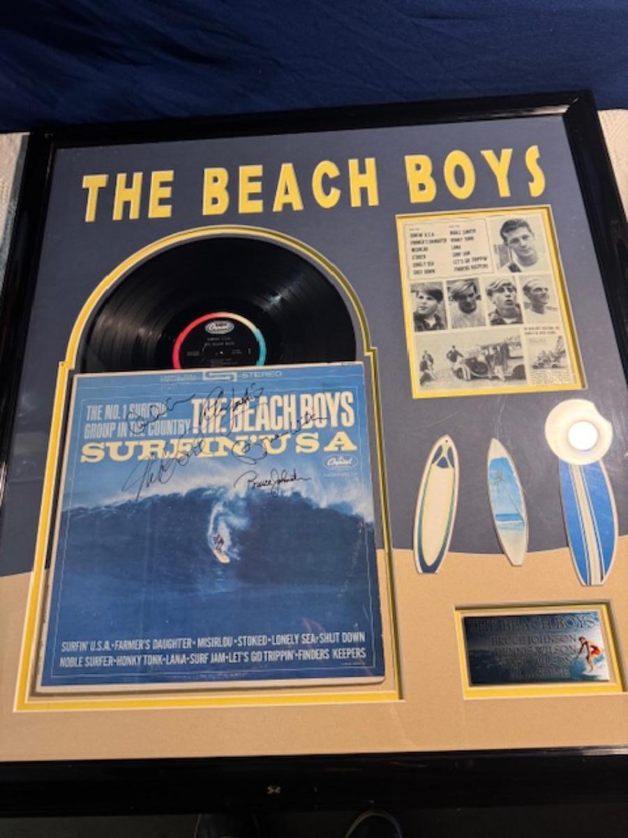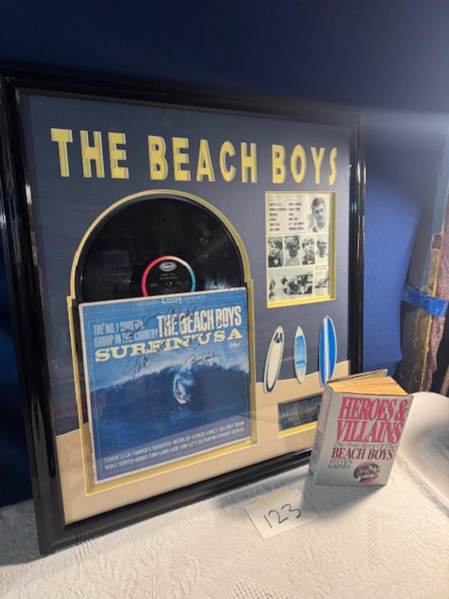 Beach Boys signed and framed LP 30.5" x 28.5" and book Heroes and Villains the true story of the Beach Boys by Steven Gaines.