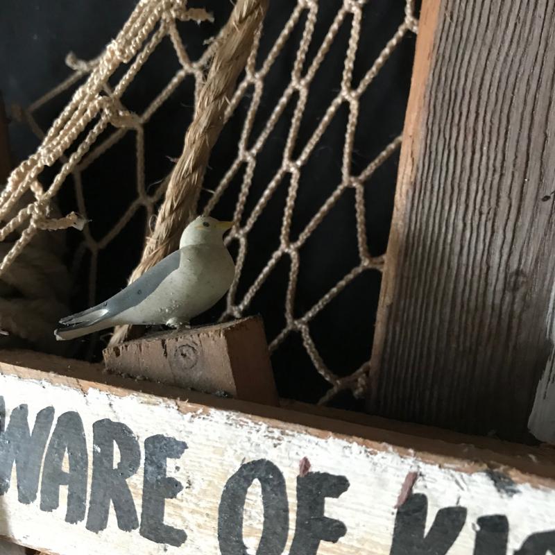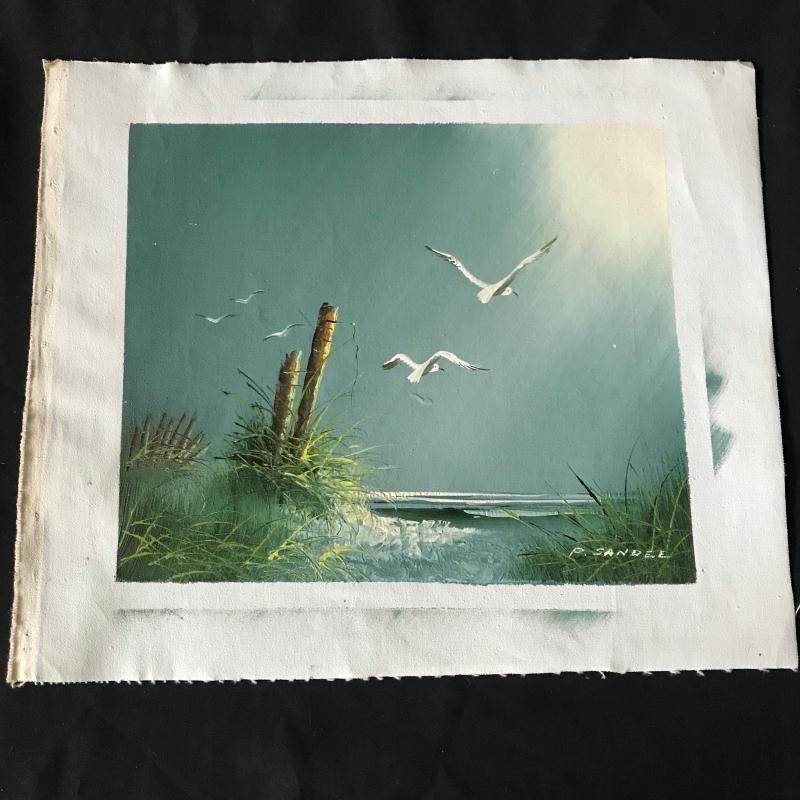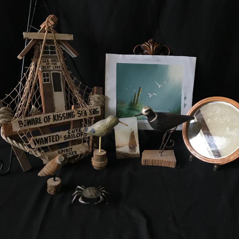 Lot contains three birds (tallest is 9.5” tall), hinged metal crab that opens, round mirror, sea hags wall art, and two seaside paintings. Larger painting is on canvas and signed “P. Sandee” and smaller one is on watercolor paper and signed “HMB”. No shipping available. Local pickup only in Hendersonville, NC.