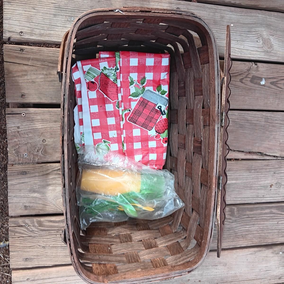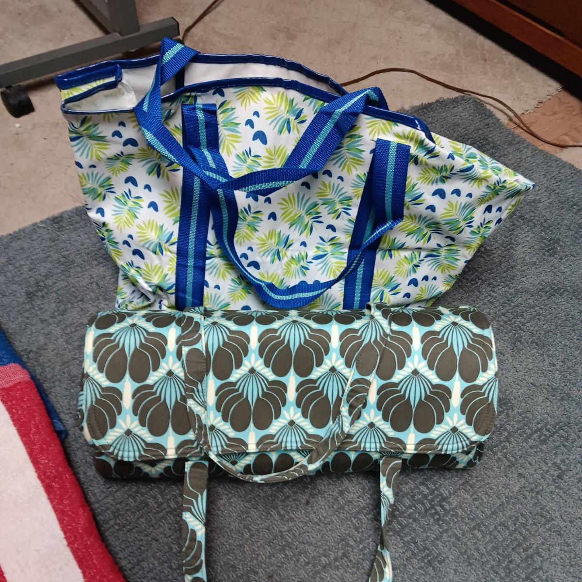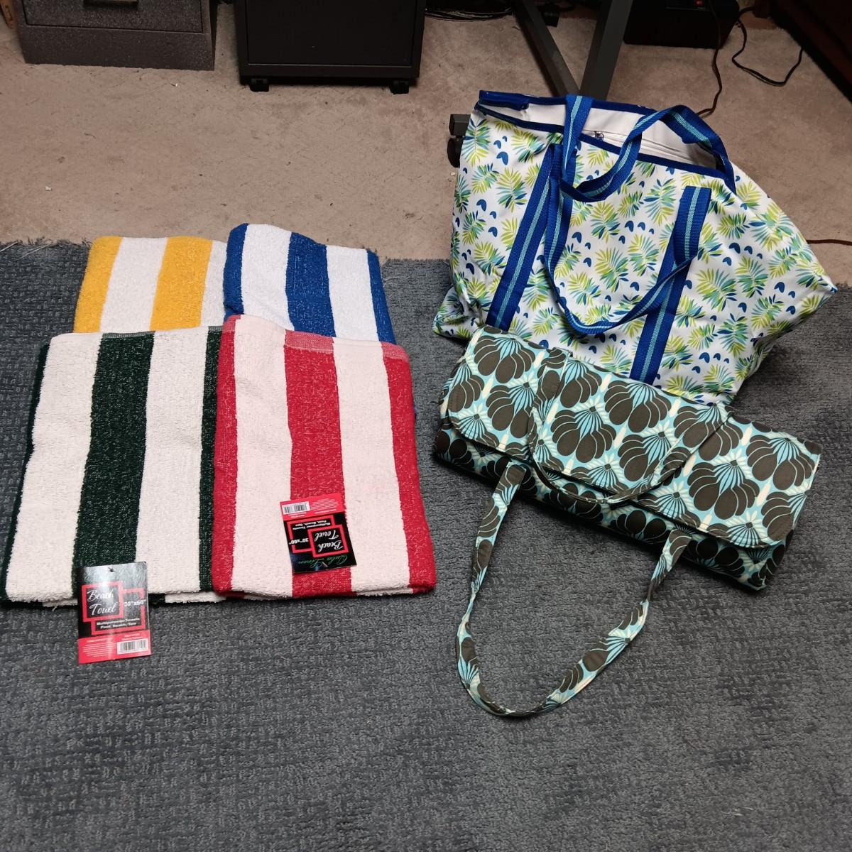 BEACH TOWELS, TOTES AND A WOODEN PICNIC BASKET