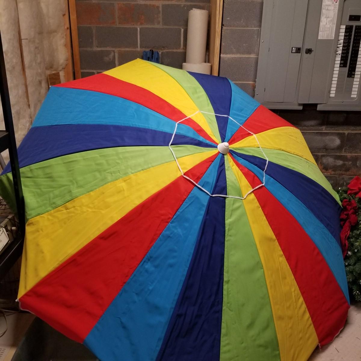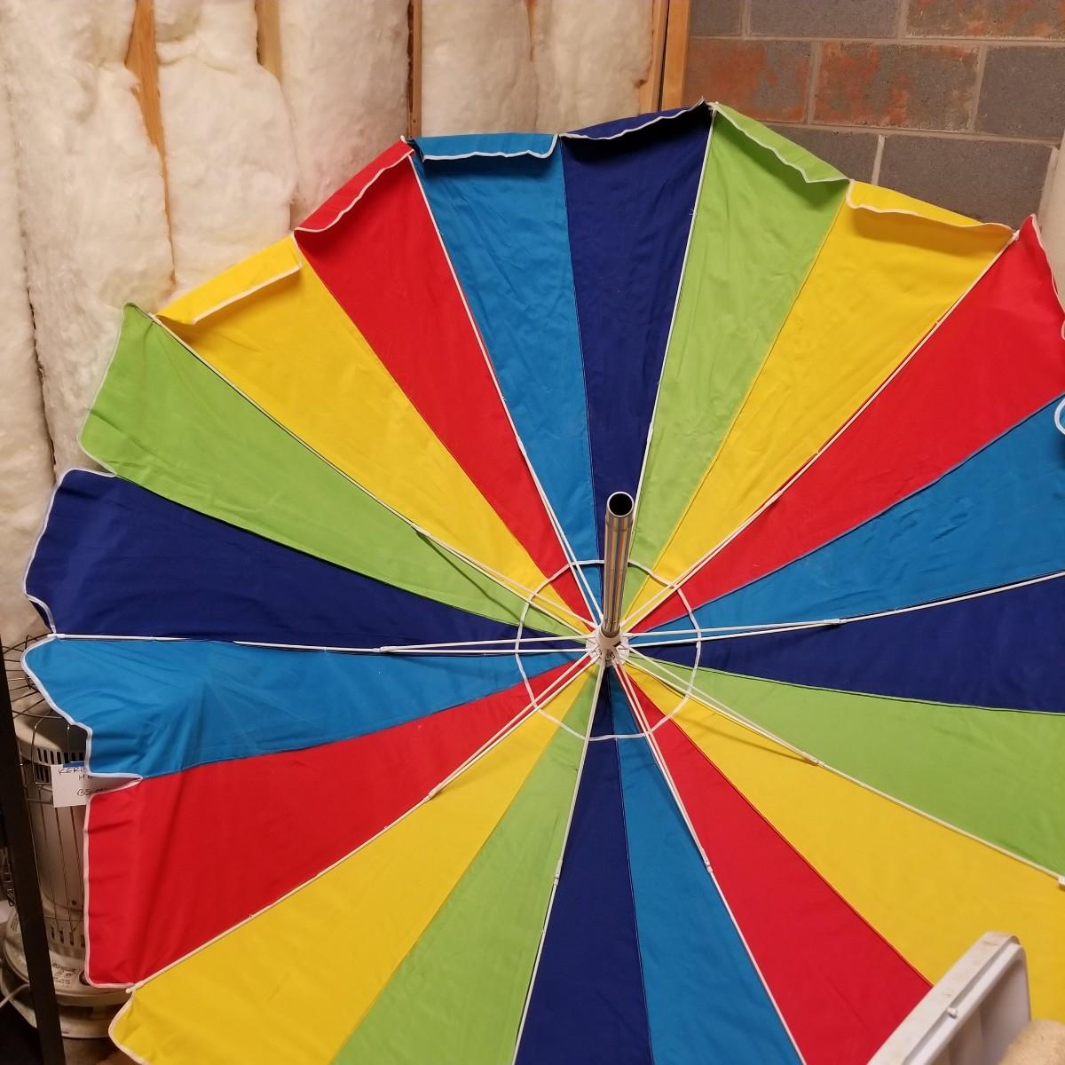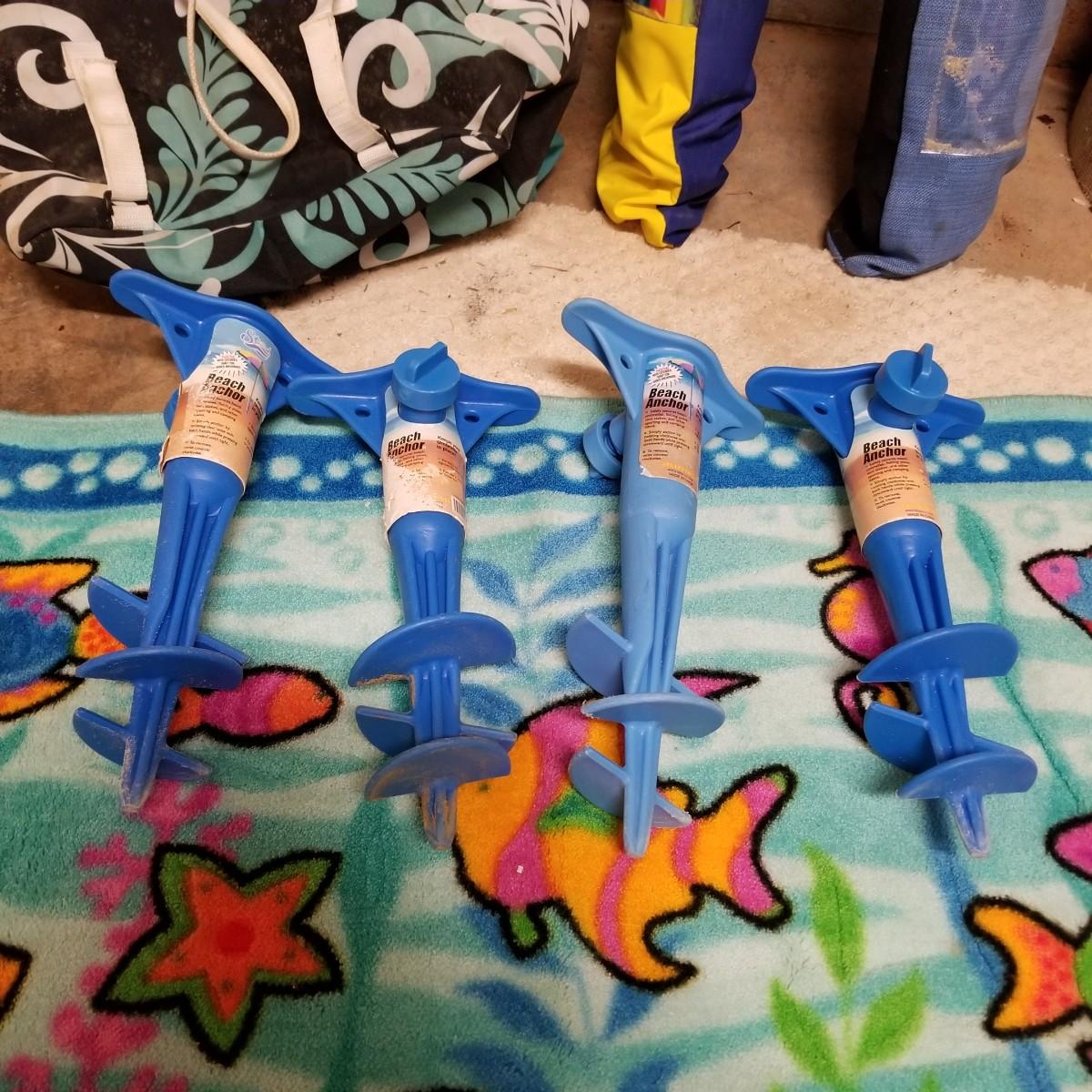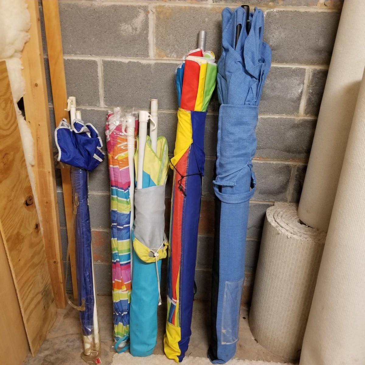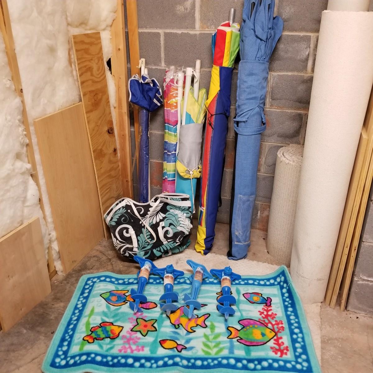 Five beach umbrellas with four umbrella screw in anchors, a carry bag and a beach themed rug. Various colors and sizes, ranging from 6' to 8' diameter. All with support poles and cases. Rug measures 25"x45". See photos for details. Local pickup only.