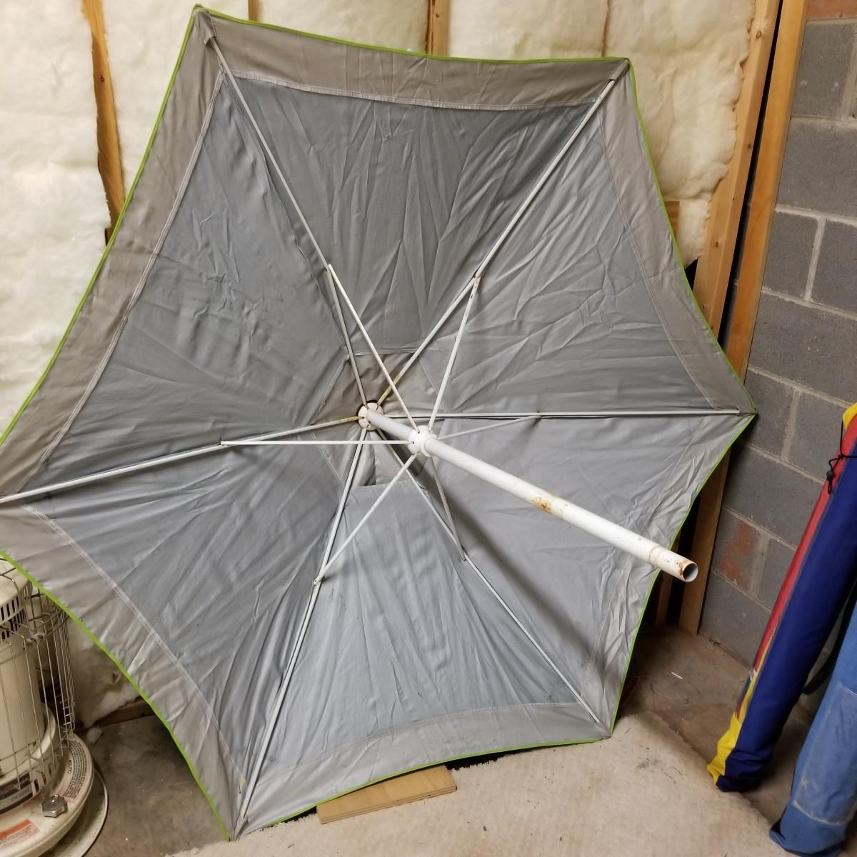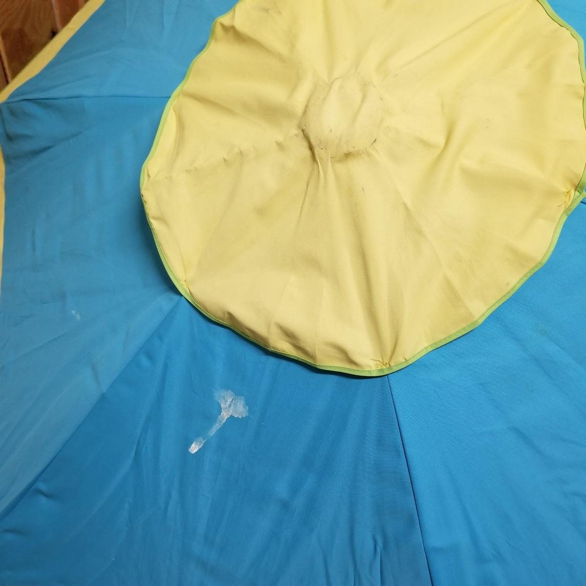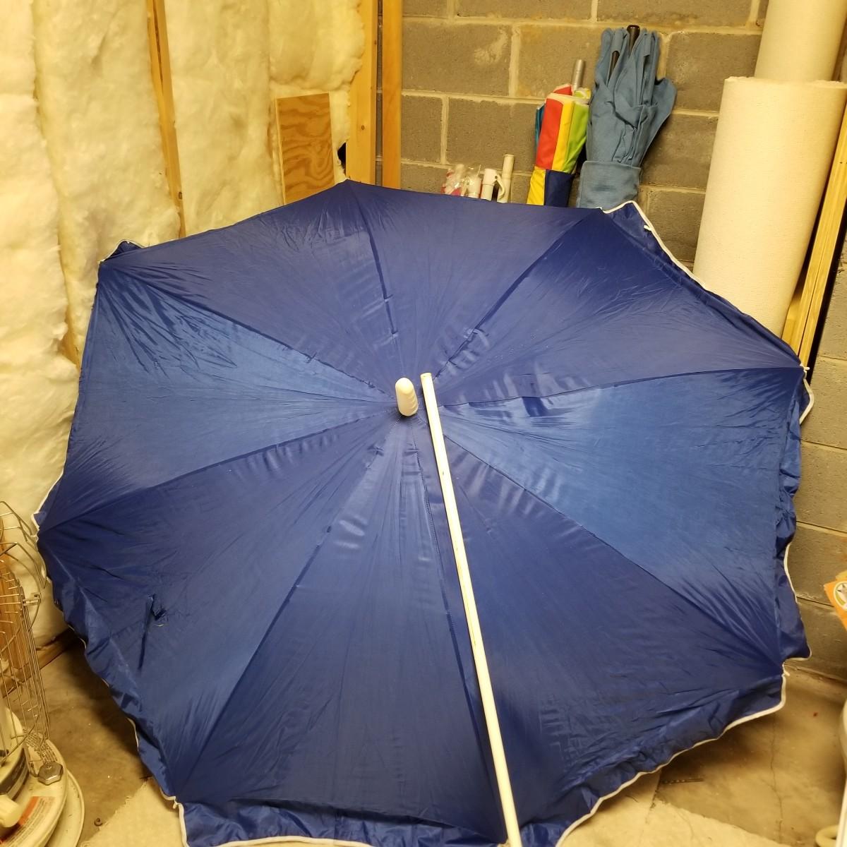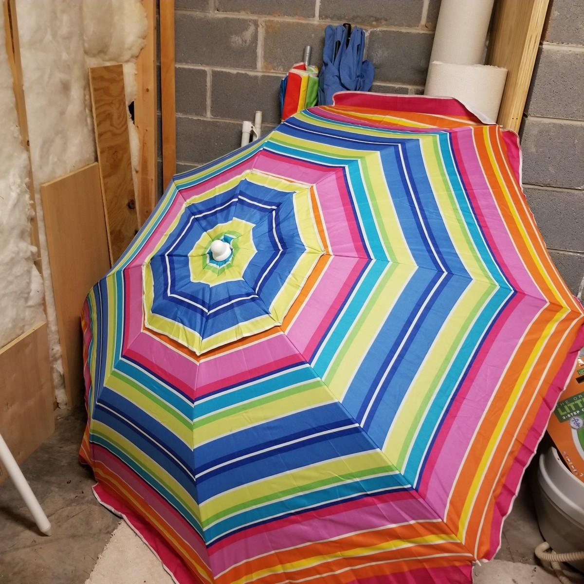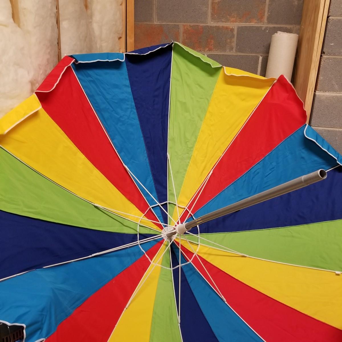 Five beach umbrellas with four umbrella screw in anchors, a carry bag and a beach themed rug. Various colors and sizes, ranging from 6' to 8' diameter. All with support poles and cases. Rug measures 25"x45". See photos for details. Local pickup only.