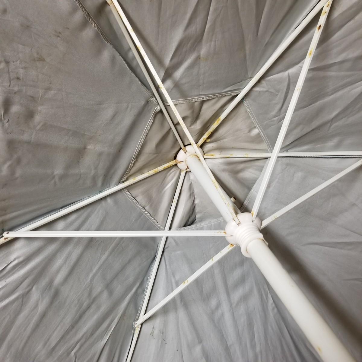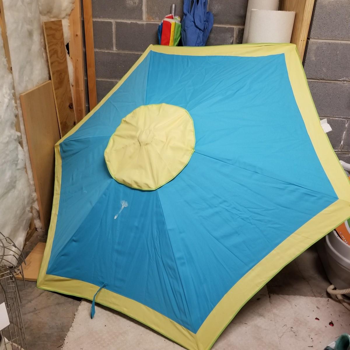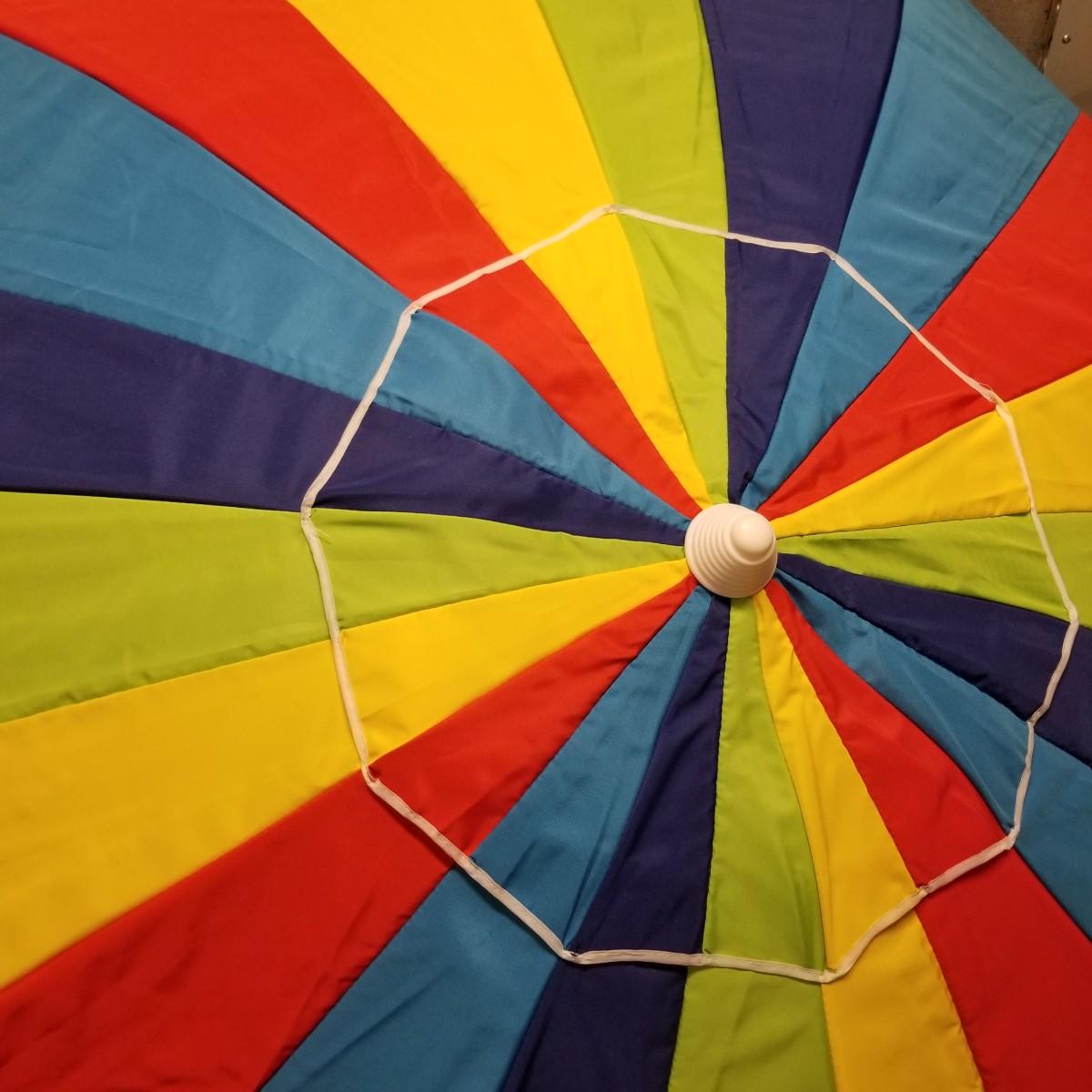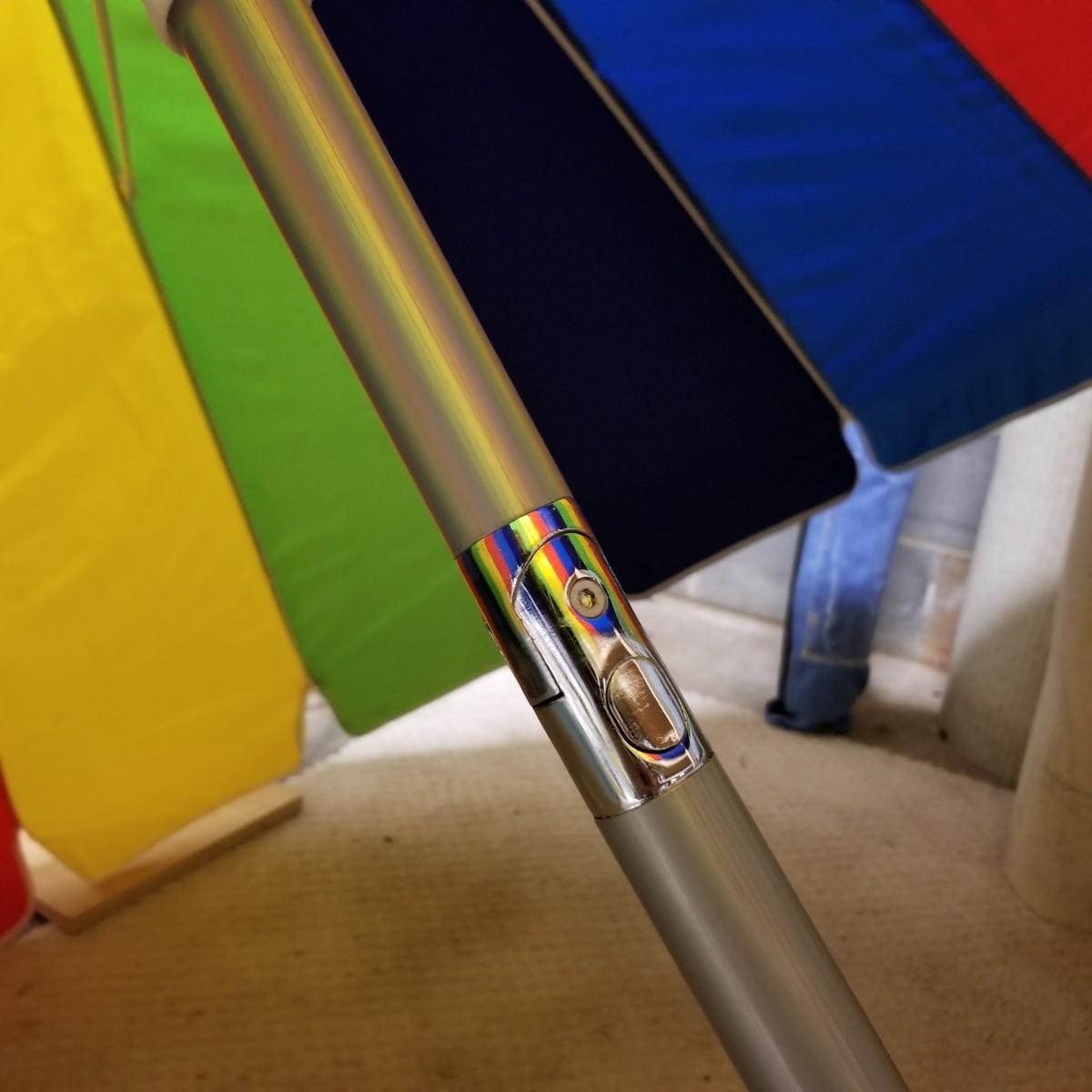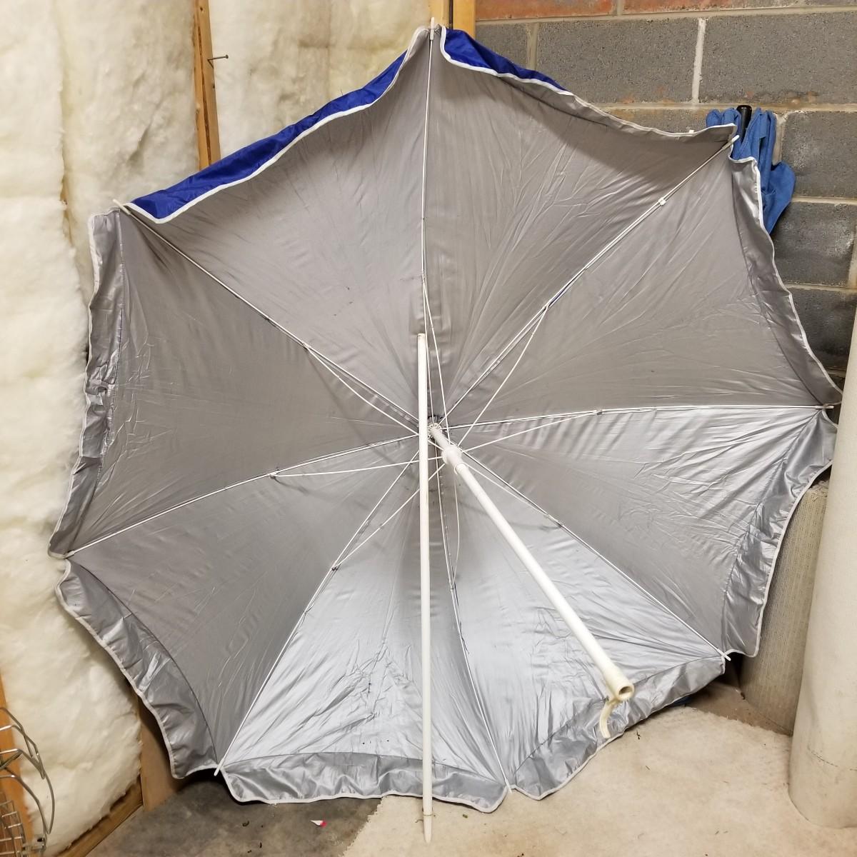 Five beach umbrellas with four umbrella screw in anchors, a carry bag and a beach themed rug. Various colors and sizes, ranging from 6' to 8' diameter. All with support poles and cases. Rug measures 25"x45". See photos for details. Local pickup only.