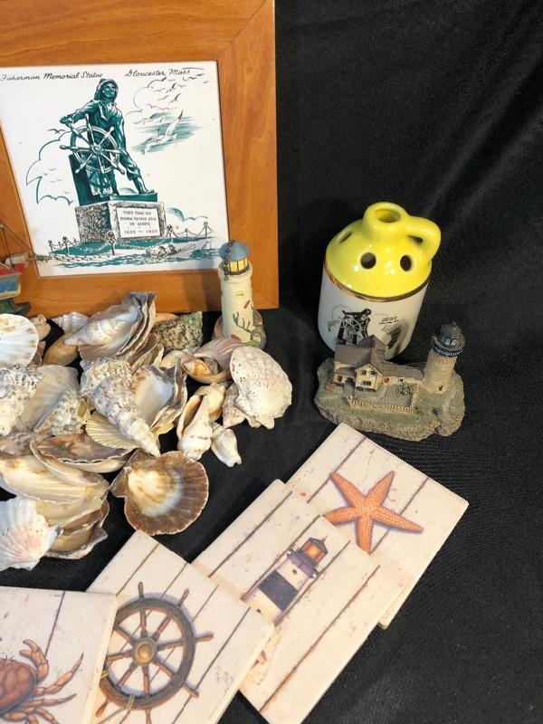 Great lot of beachy coastal themed items. Seashells, lighthouses, Fisherman memorial souvenirs, and some great beachy tile coasters.