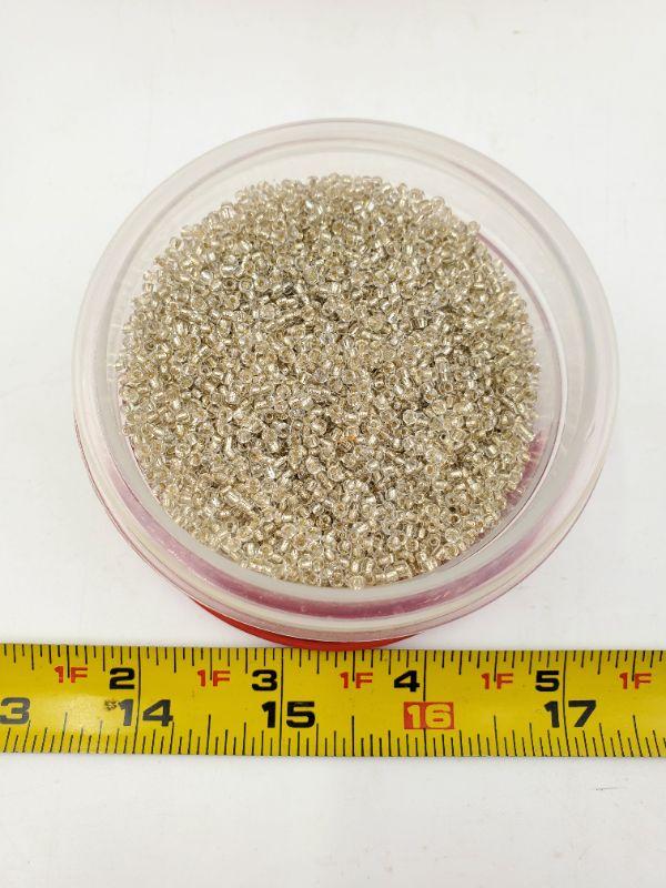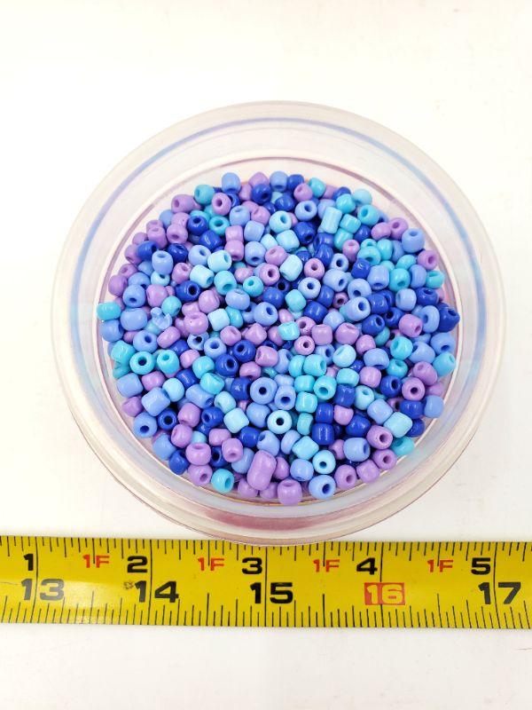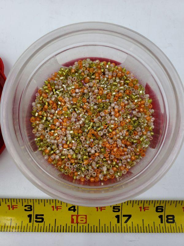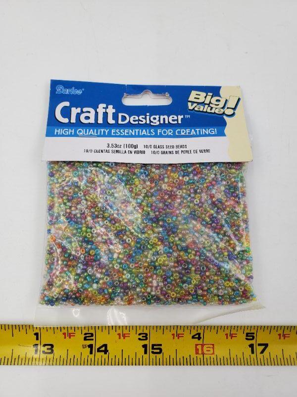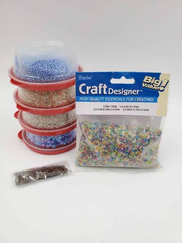 3 containers contain glass beads, 1 container plastic colorful beads, 1 unopened package of Darice glass seed beads and a small package of bronze colored spacers.
