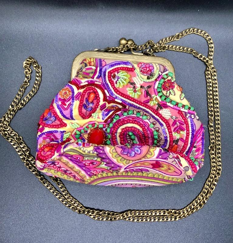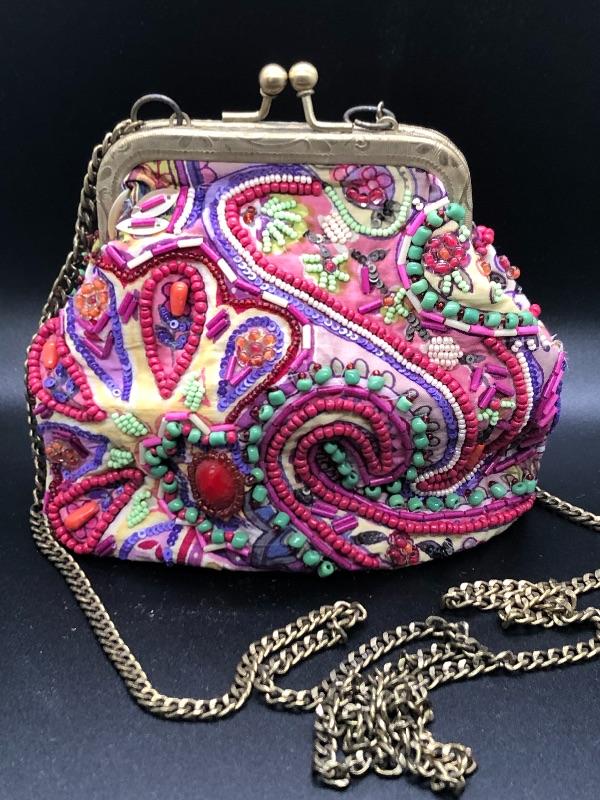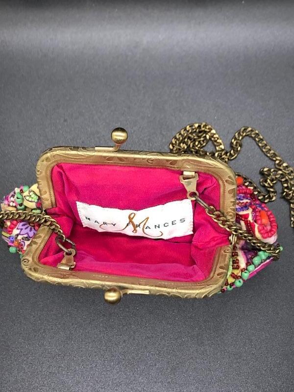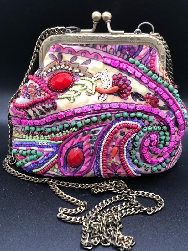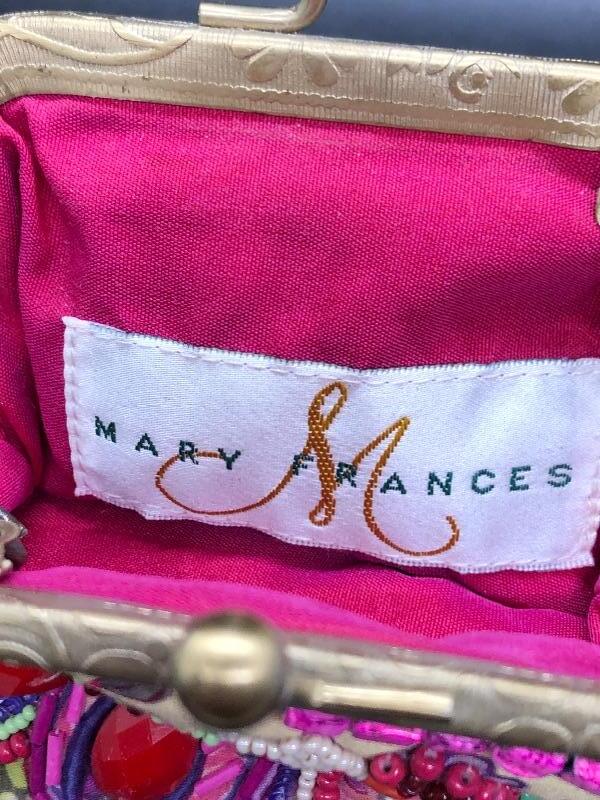 Brightly colored bead embellished purse by Mary Frances. Covered in beads and sequins, Can be carried as a shoulder bag or clutch. Has tag inside with bright pink lining. Very good condition.