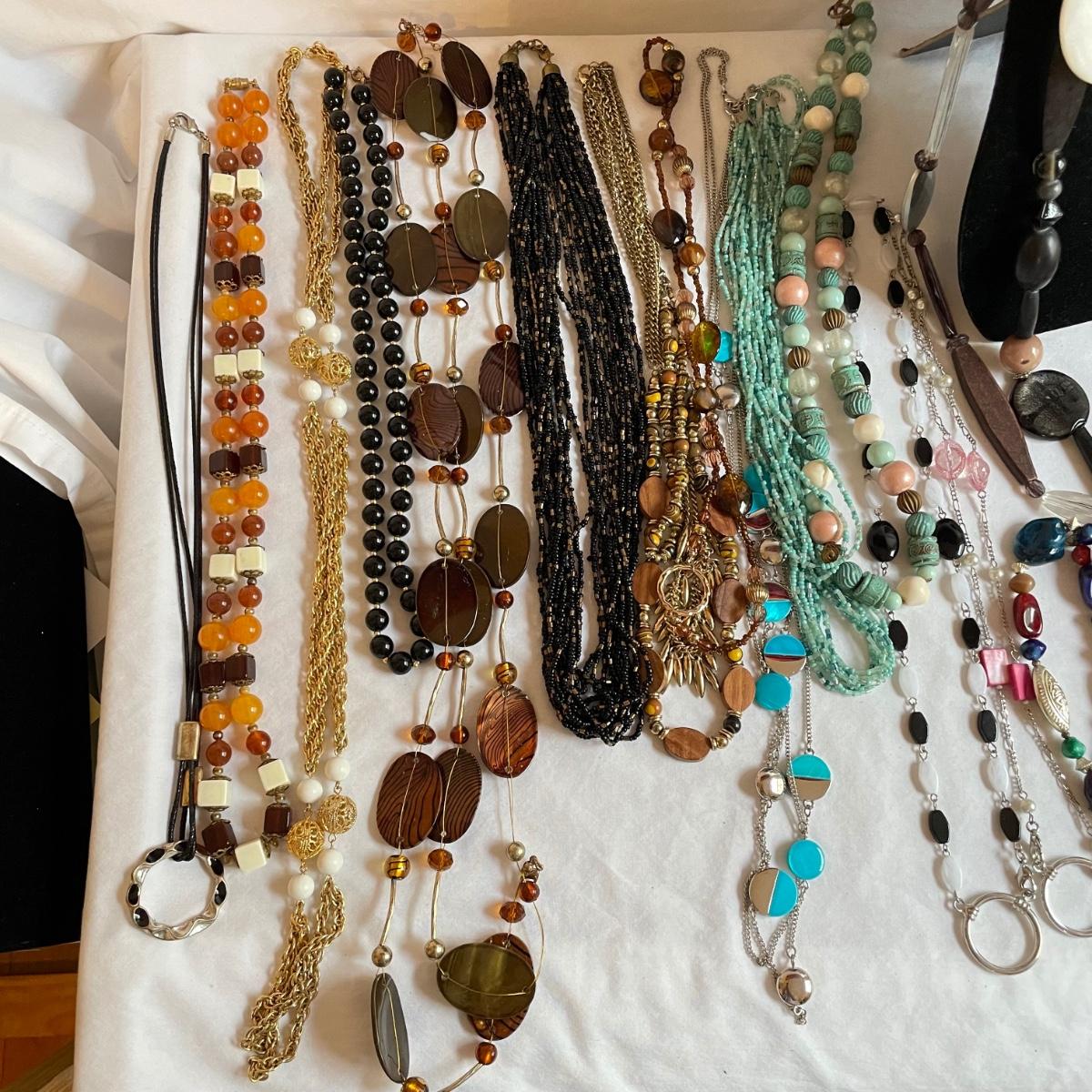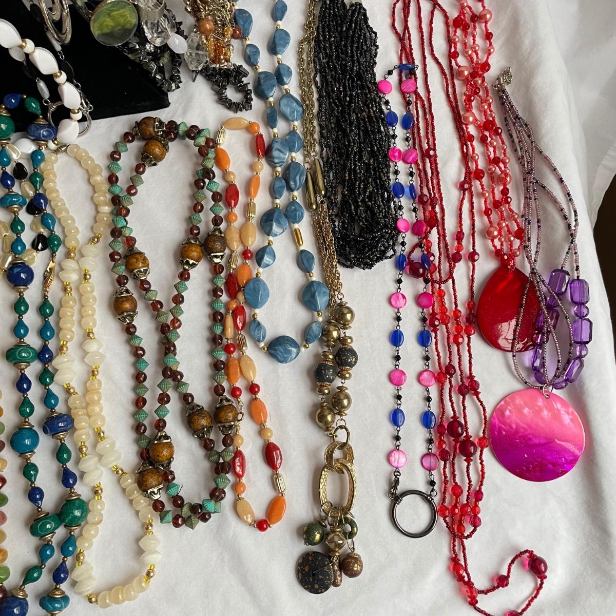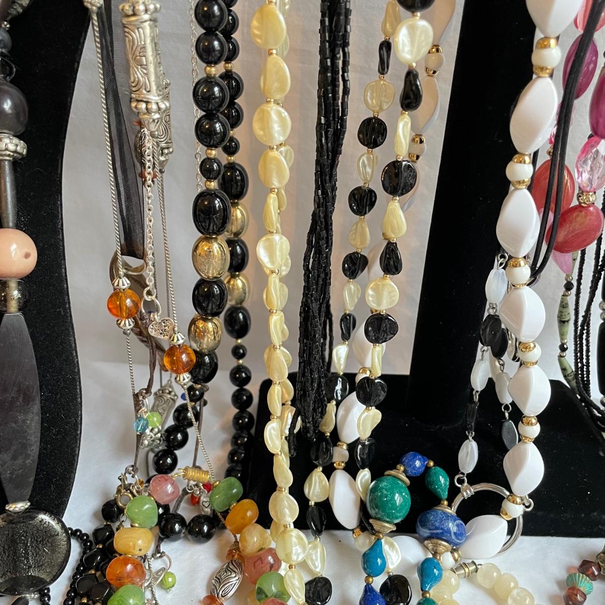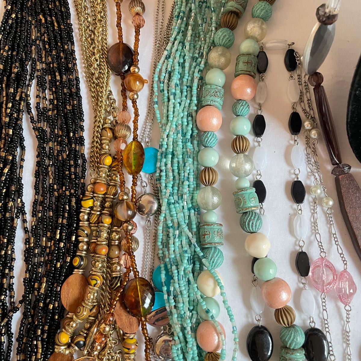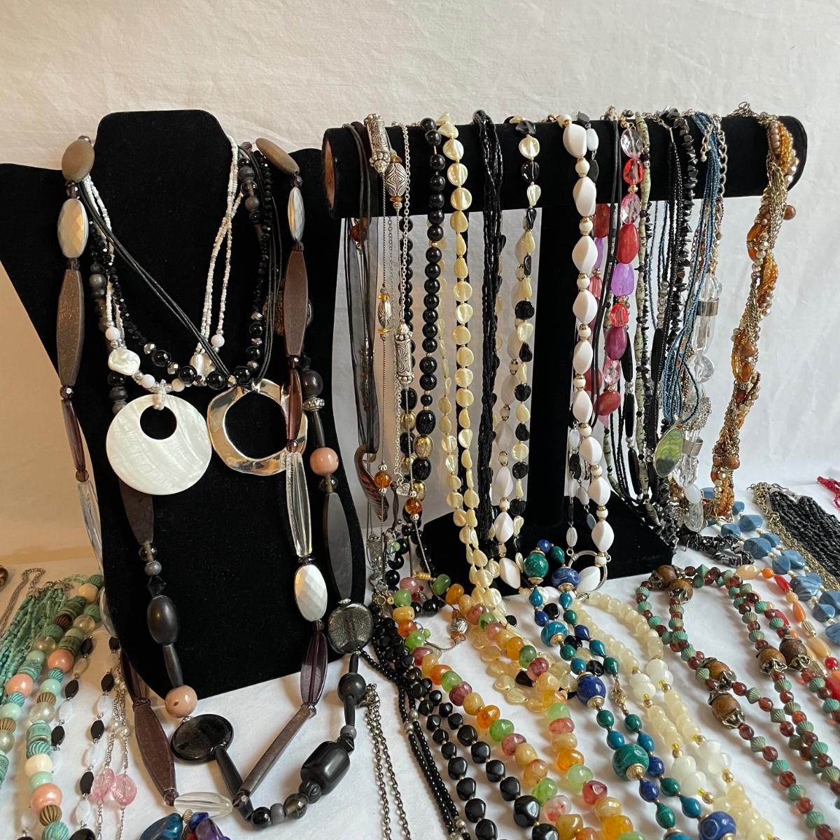 Large selection of beaded necklaces created from shell, metal, stones, resin and more. Lot includes around 60 necklaces, mostly long in length - more than 30”. See images. Shipping available. All sales are final. No returns or refunds. Please bid accordingly.