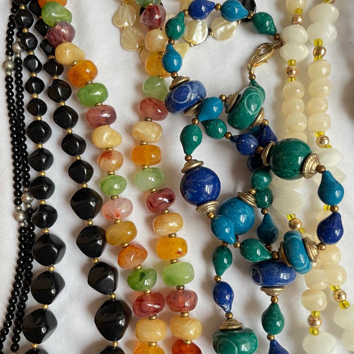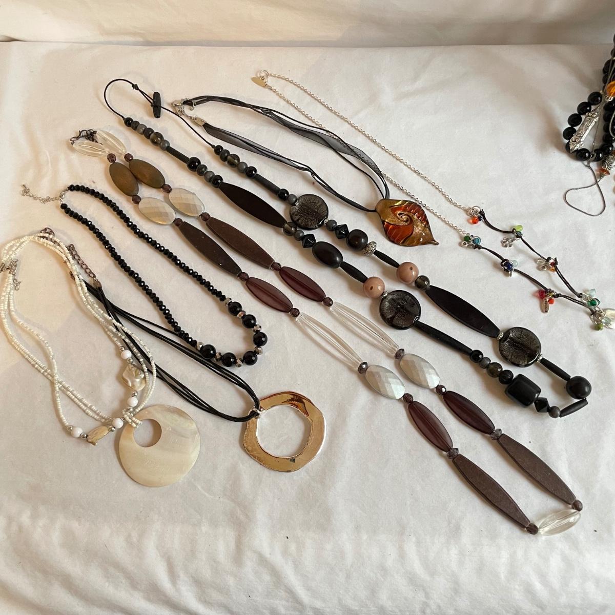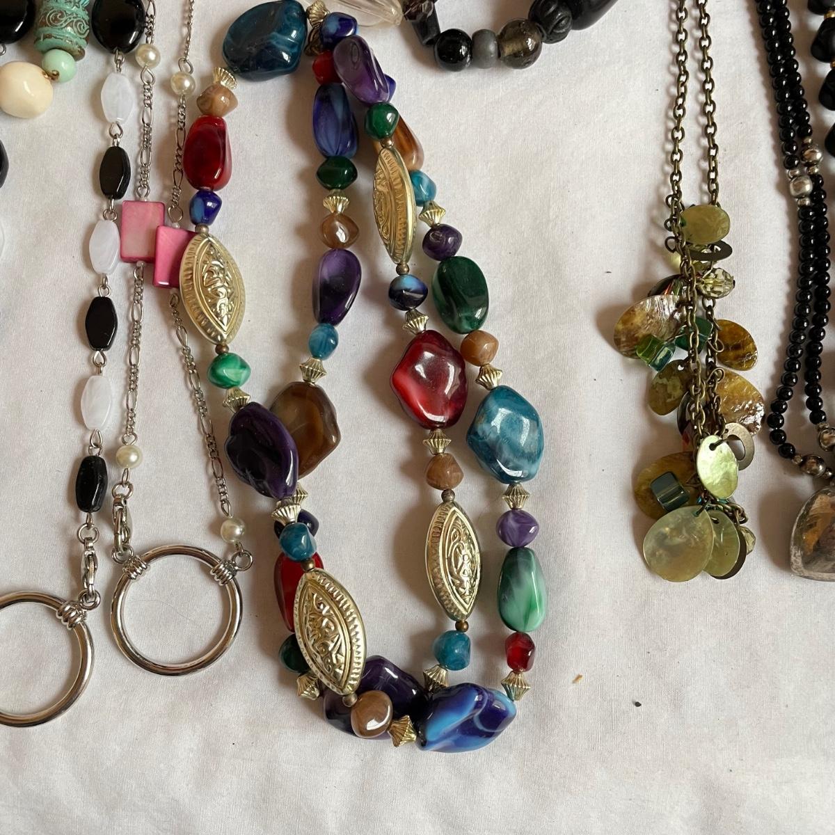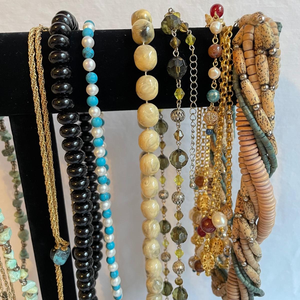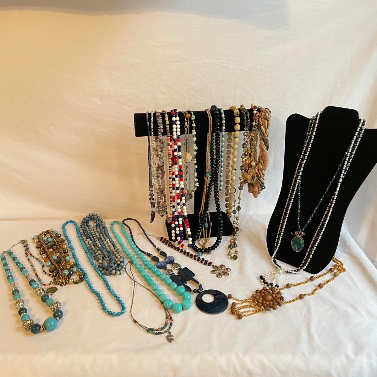 Large selection of beaded necklaces created from shell, metal, stones, resin and more. Lot includes around 60 necklaces, mostly long in length - more than 30”. See images. Shipping available. All sales are final. No returns or refunds. Please bid accordingly.