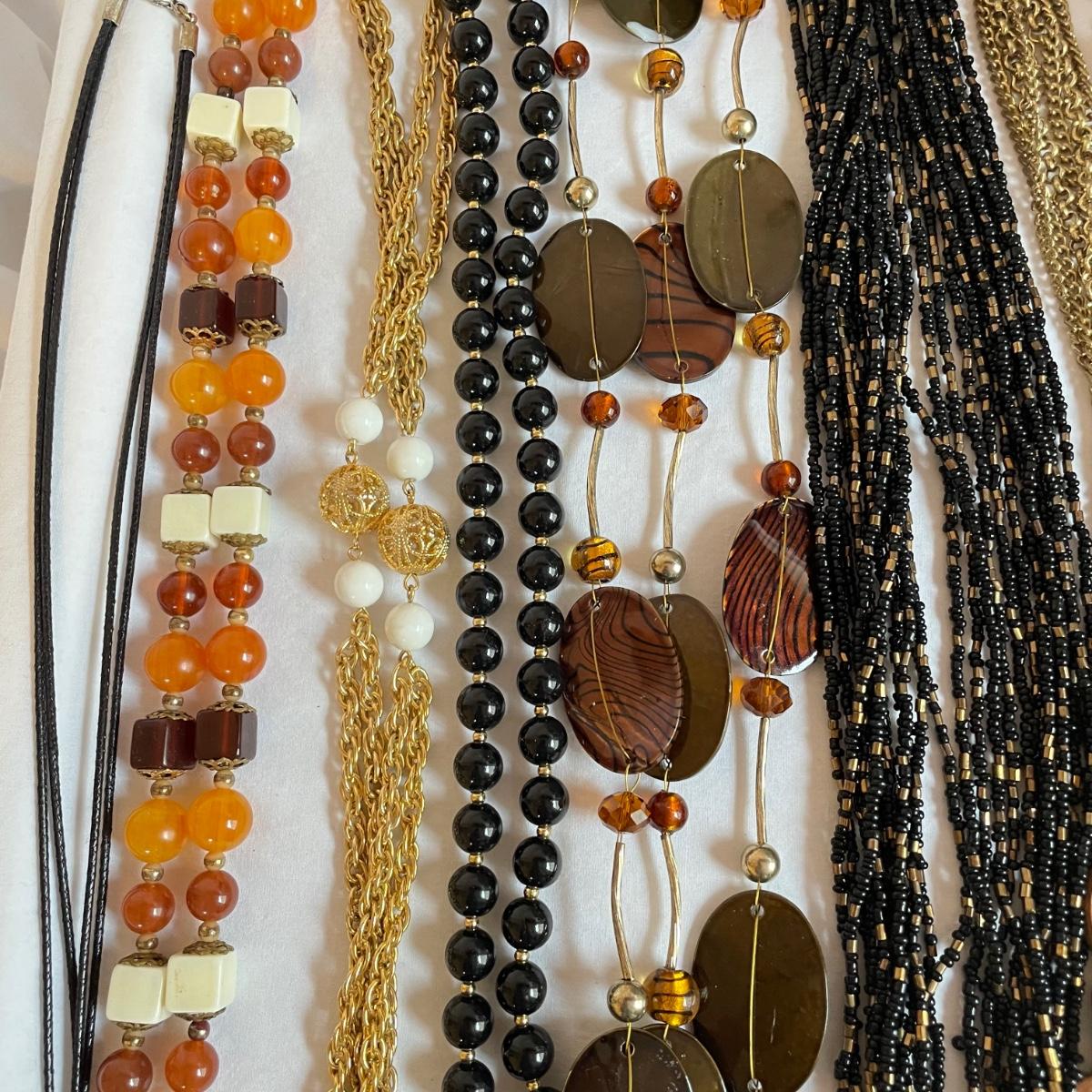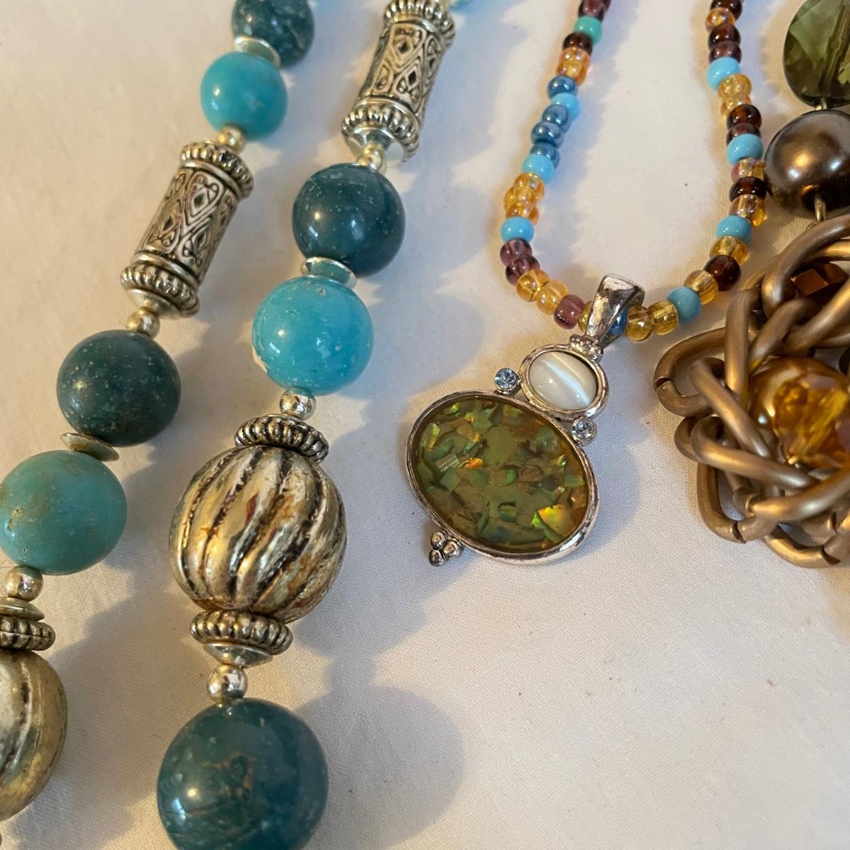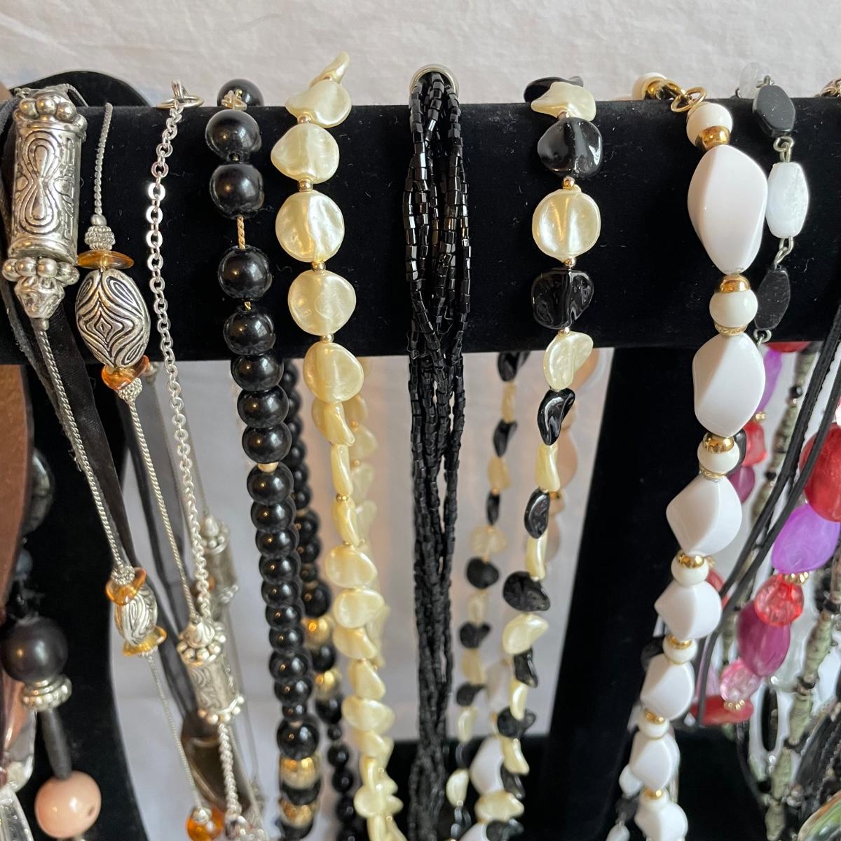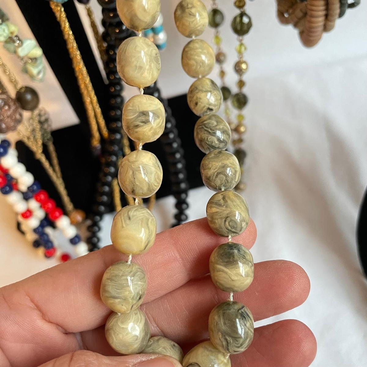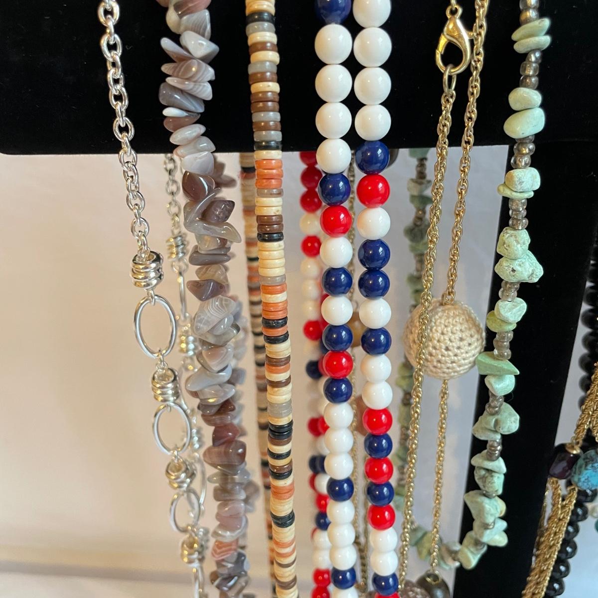 Large selection of beaded necklaces created from shell, metal, stones, resin and more. Lot includes around 60 necklaces, mostly long in length - more than 30”. See images. Shipping available. All sales are final. No returns or refunds. Please bid accordingly.