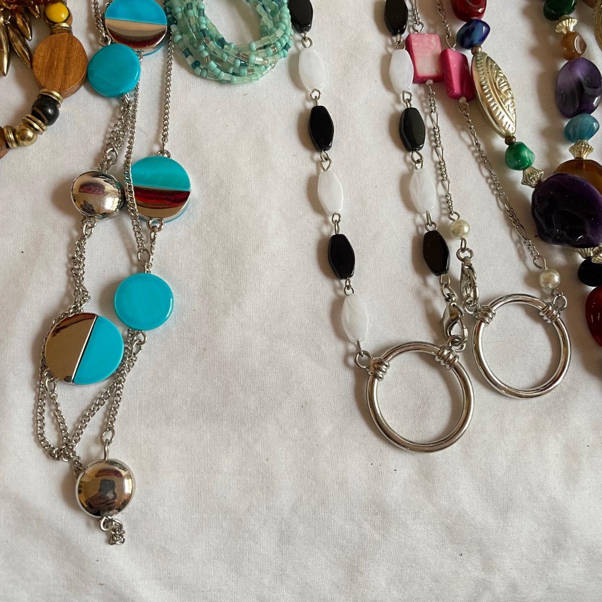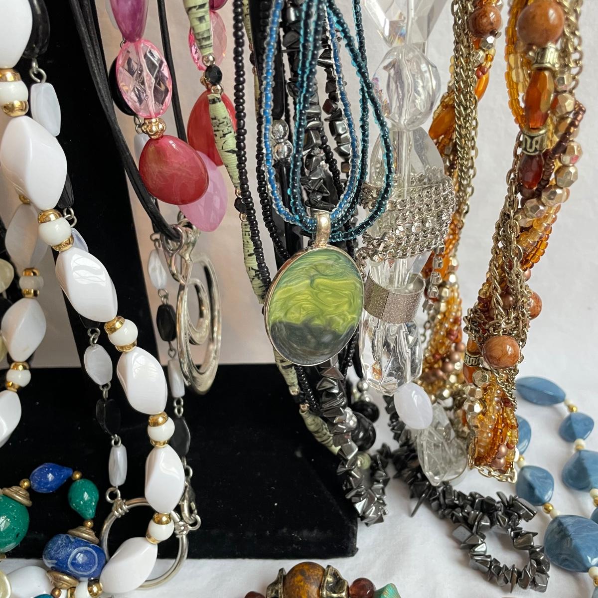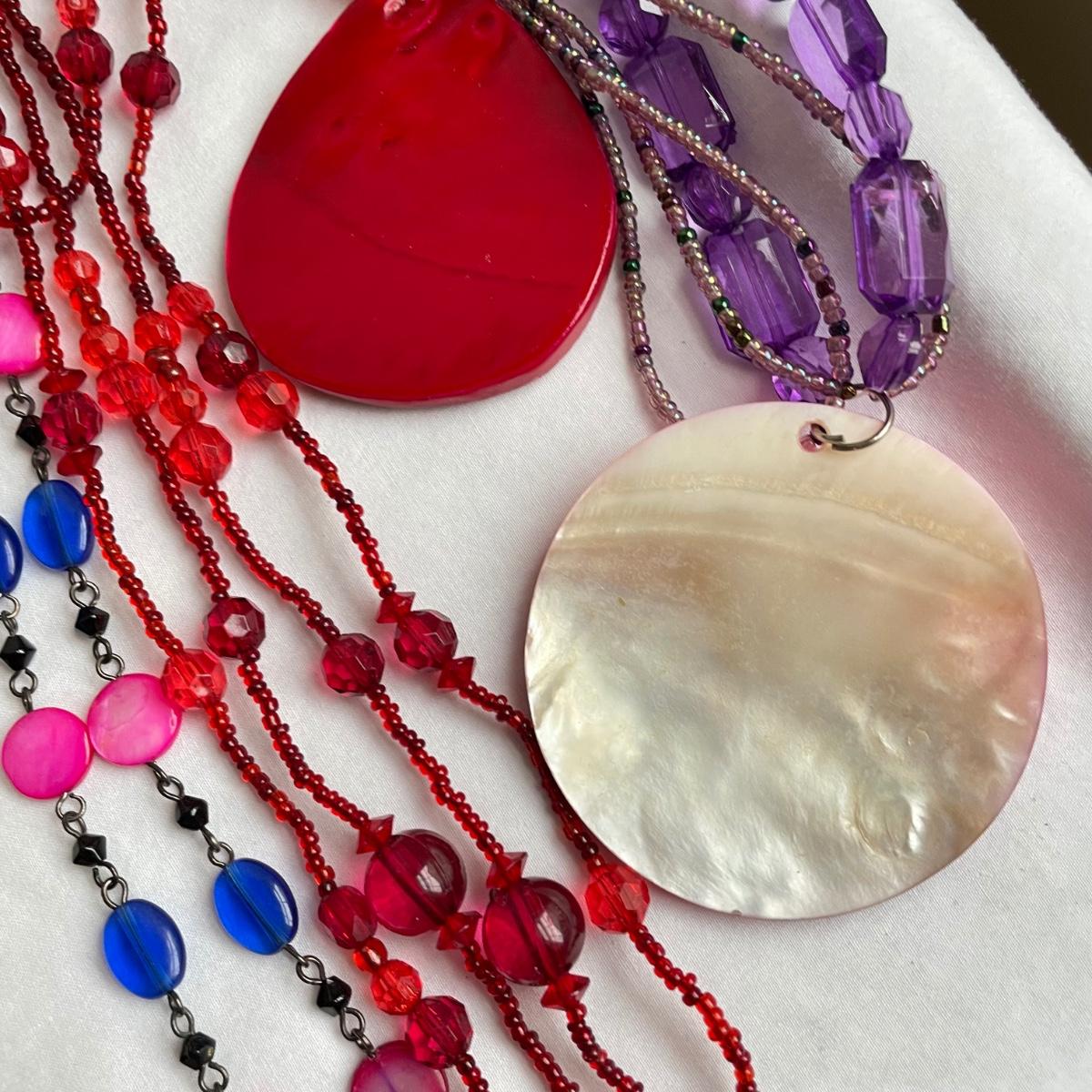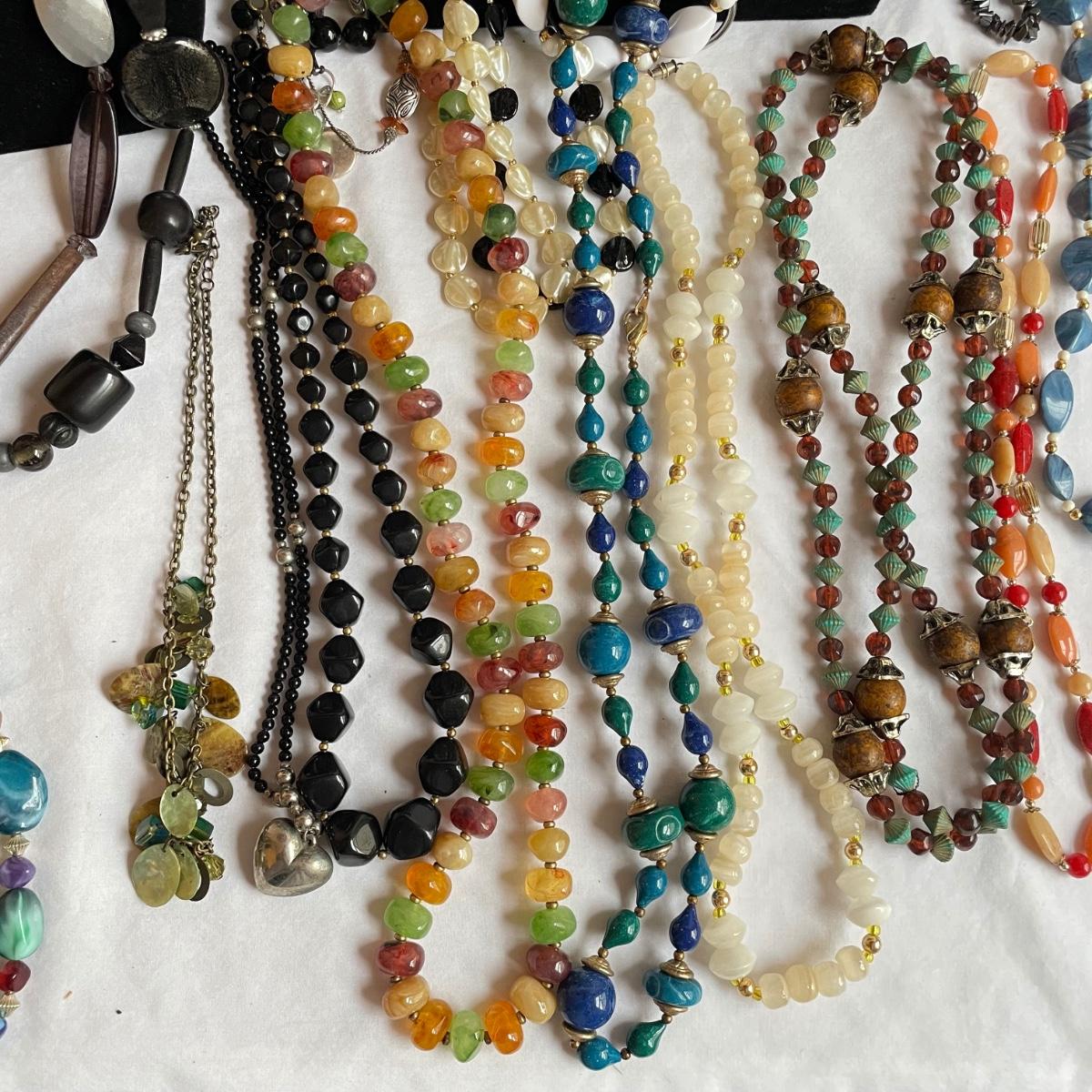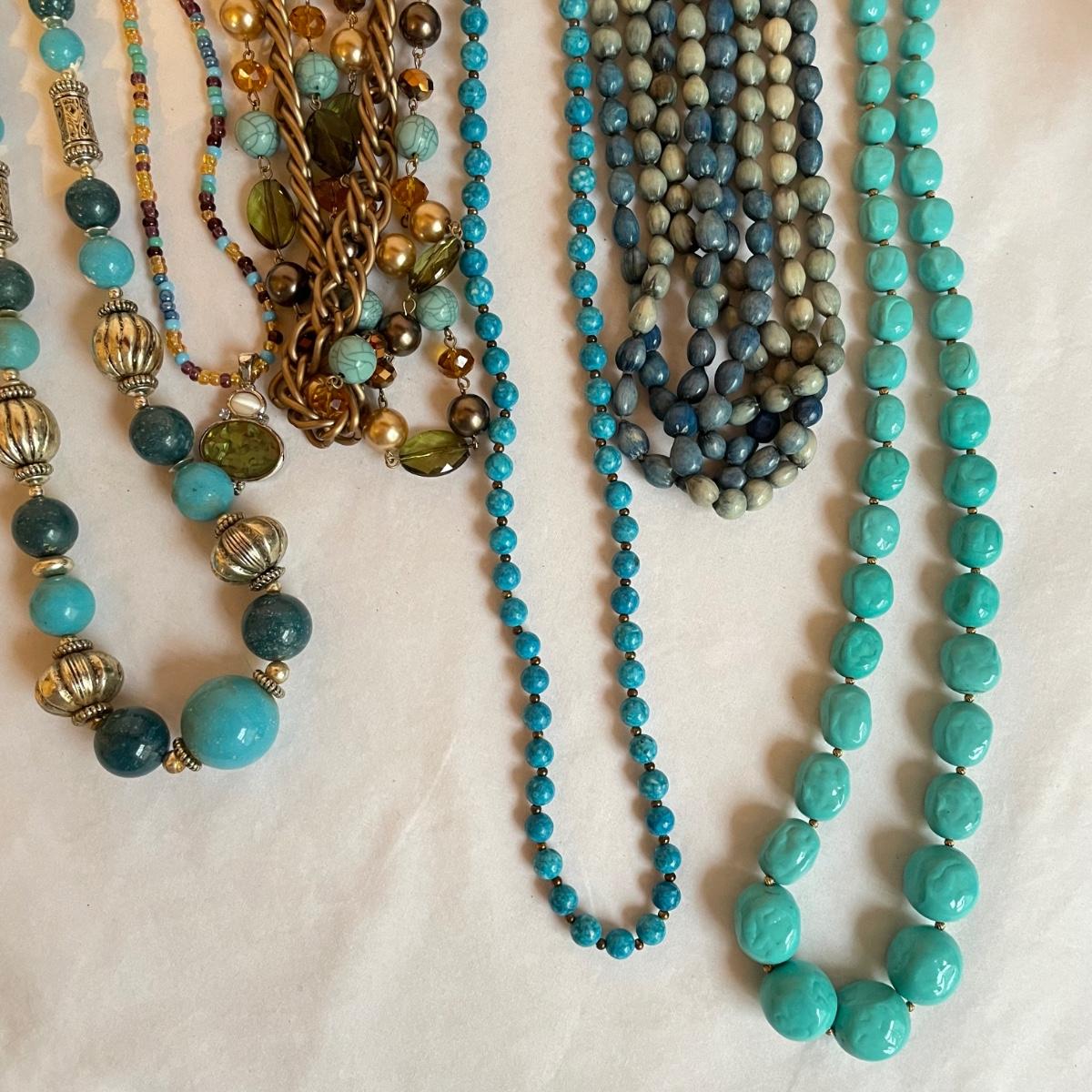 Large selection of beaded necklaces created from shell, metal, stones, resin and more. Lot includes around 60 necklaces, mostly long in length - more than 30”. See images. Shipping available. All sales are final. No returns or refunds. Please bid accordingly.