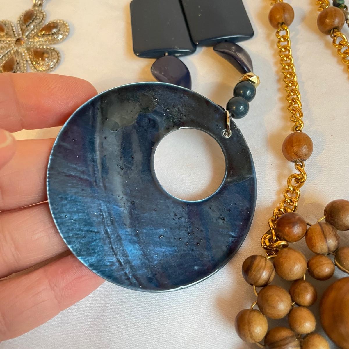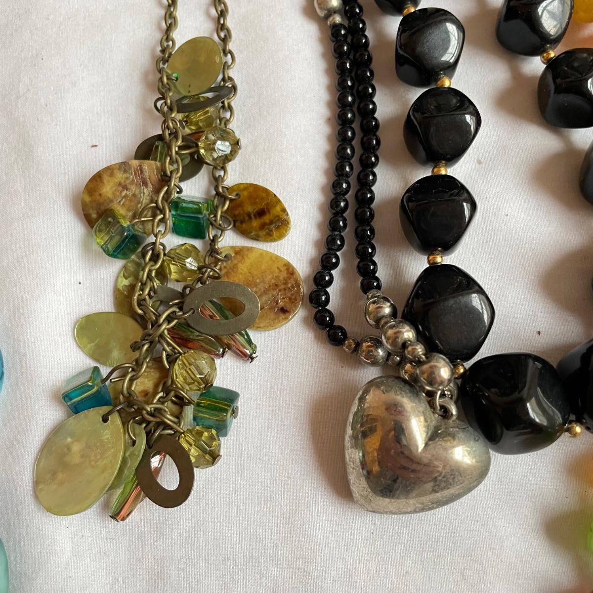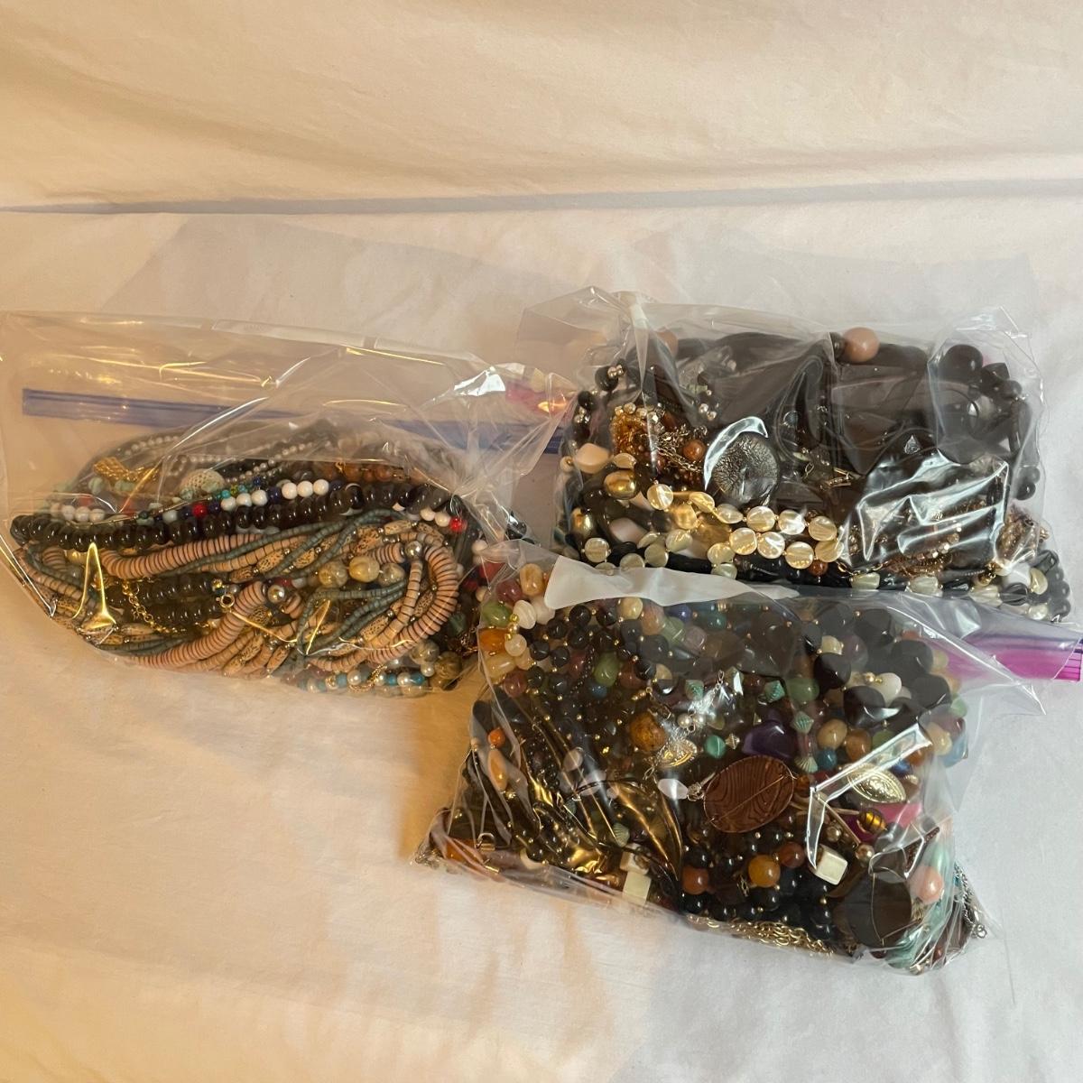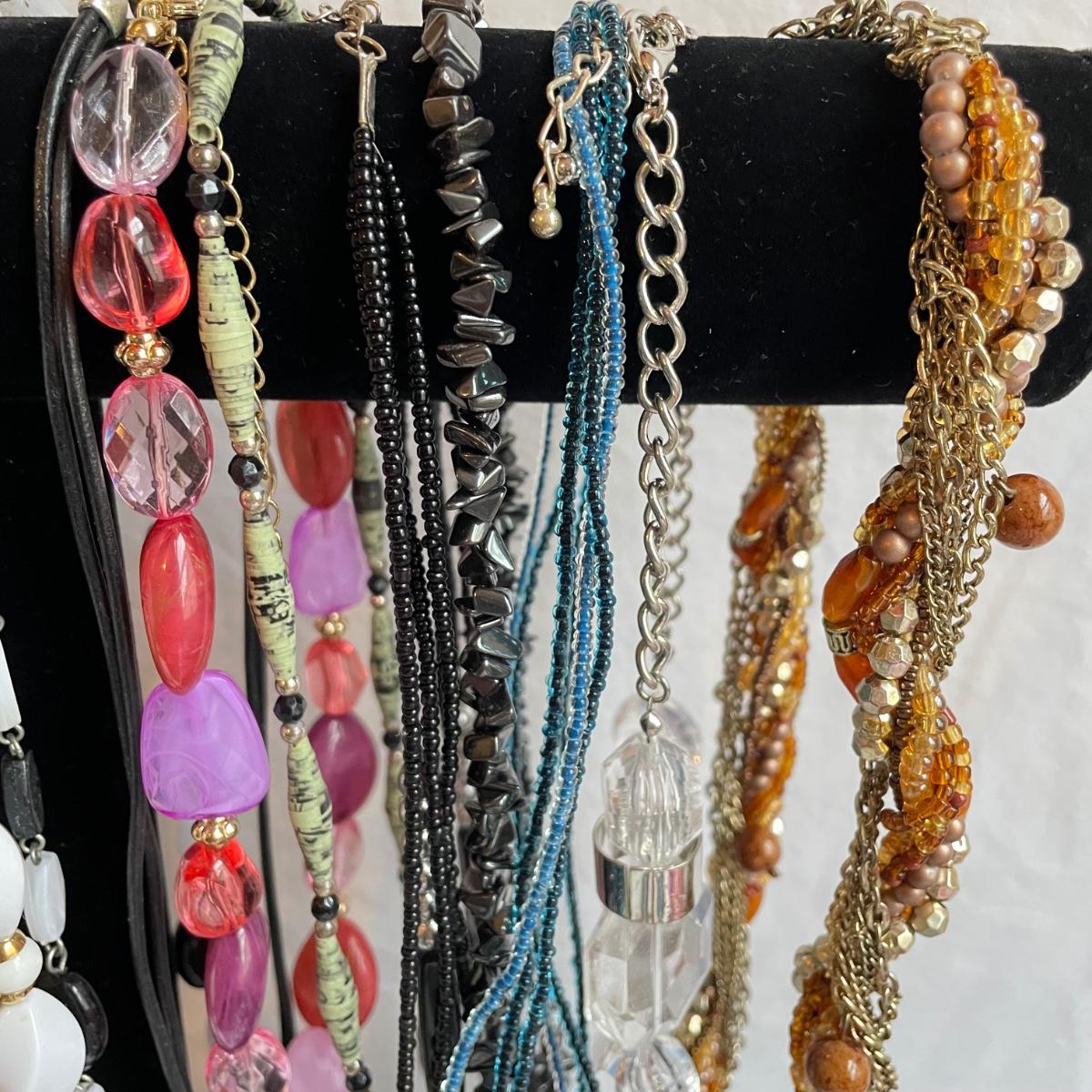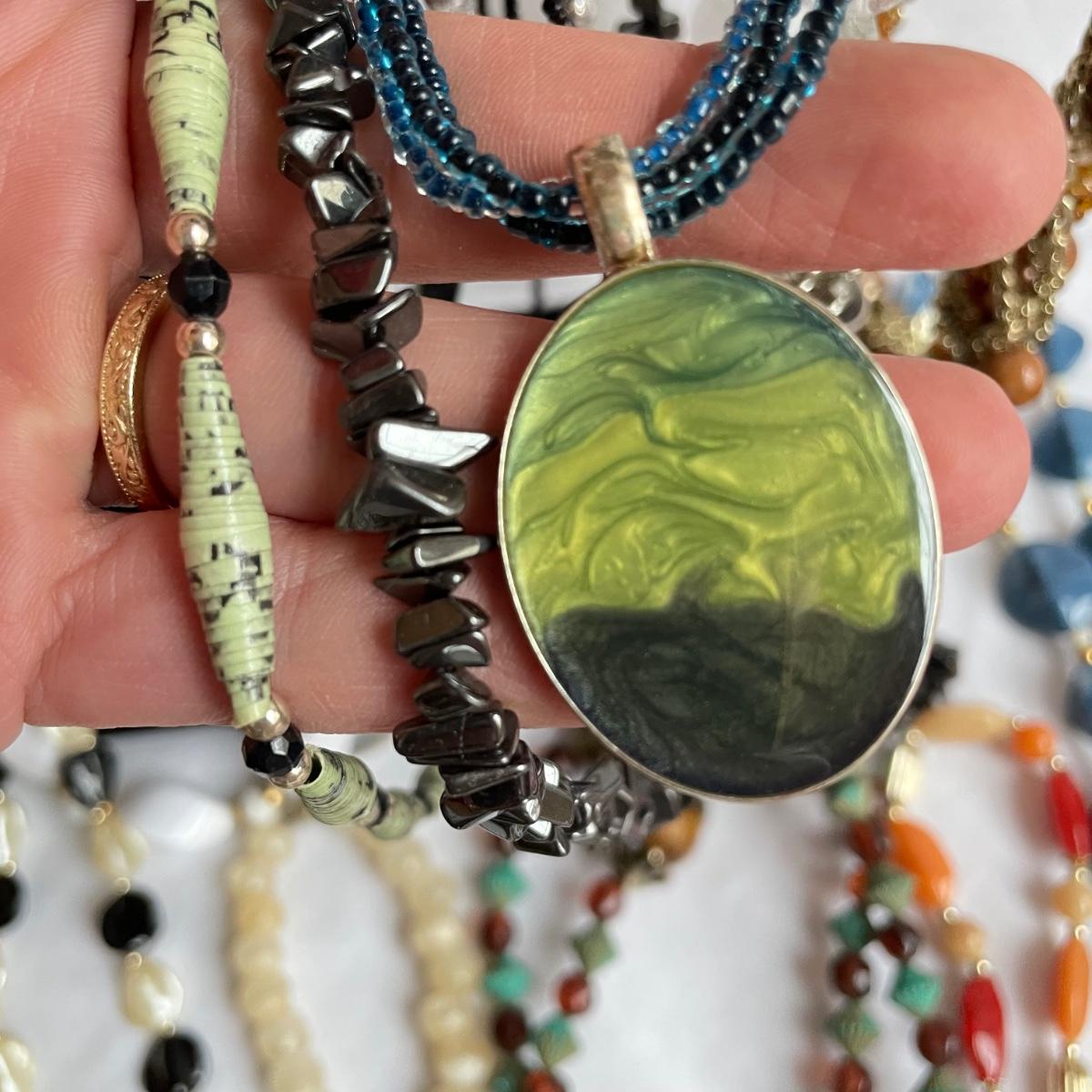 Large selection of beaded necklaces created from shell, metal, stones, resin and more. Lot includes around 60 necklaces, mostly long in length - more than 30”. See images. Shipping available. All sales are final. No returns or refunds. Please bid accordingly.