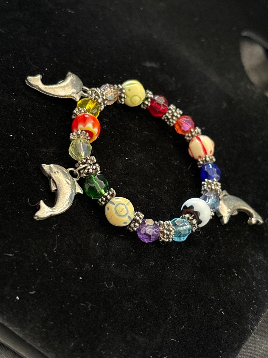Beaded Bracelet Silver Tone DOLPHINS Multicolor Stretch