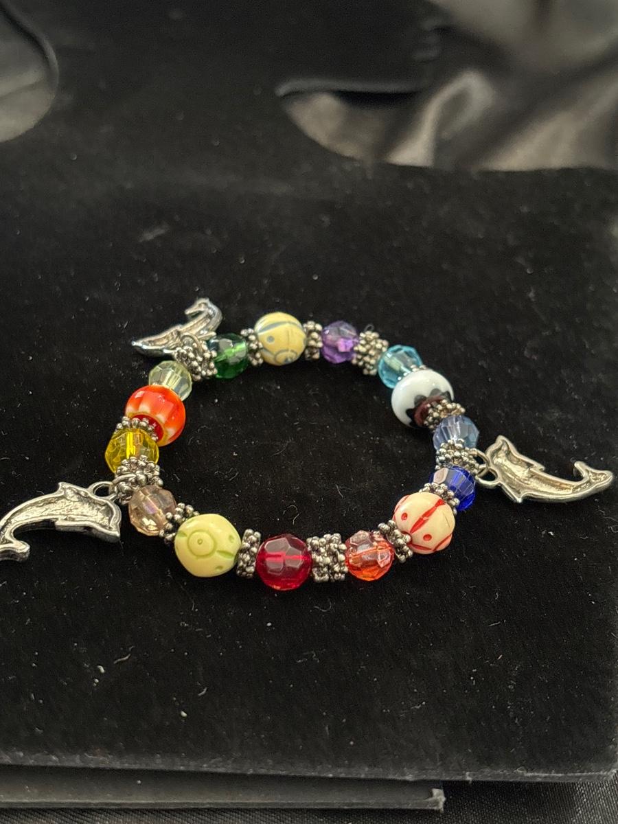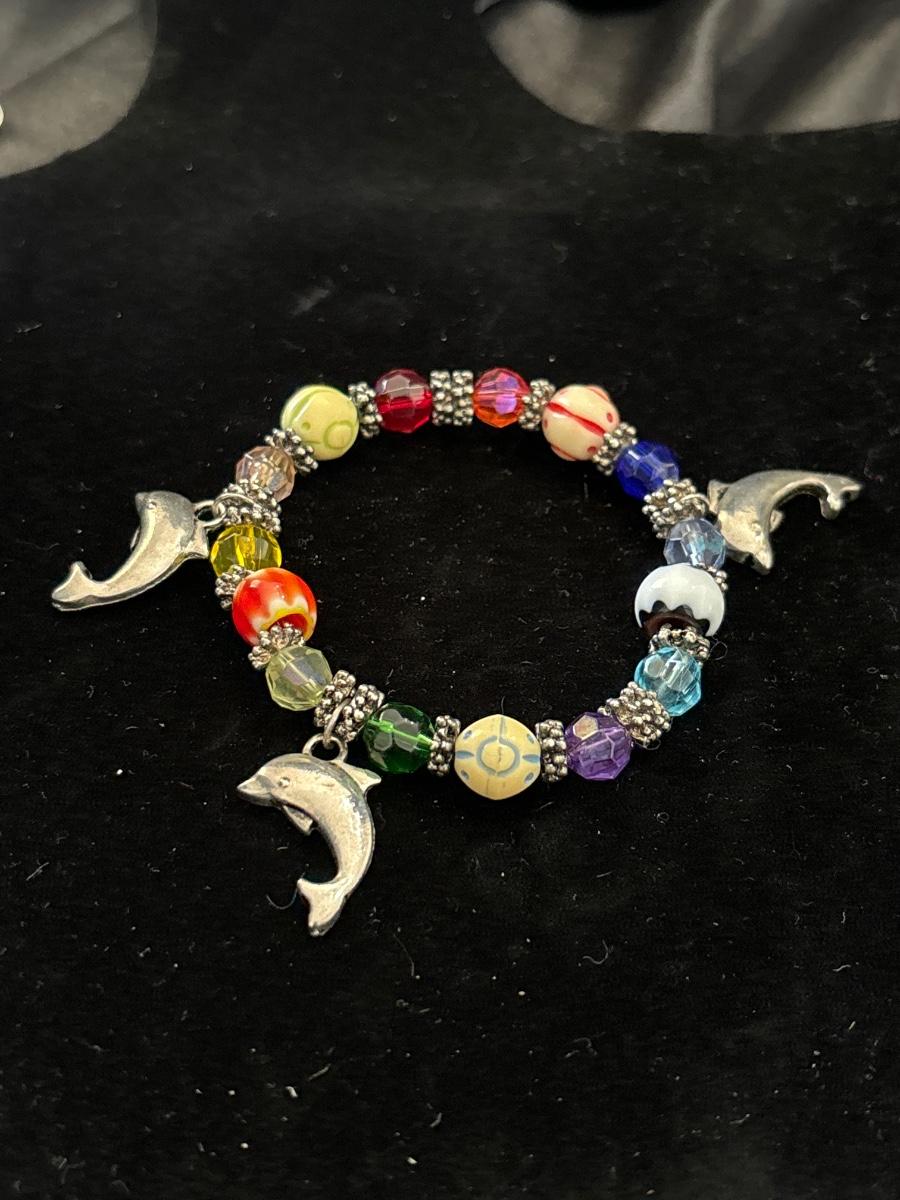 Beaded Bracelet Silver Tone DOLPHINS Multicolor Stretch