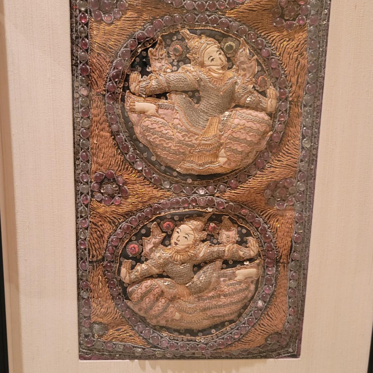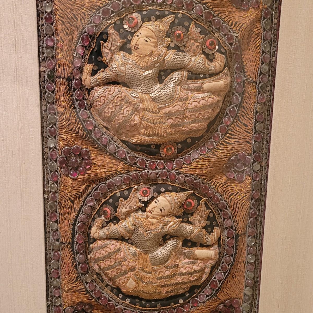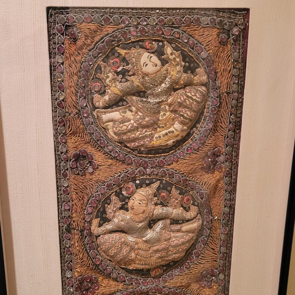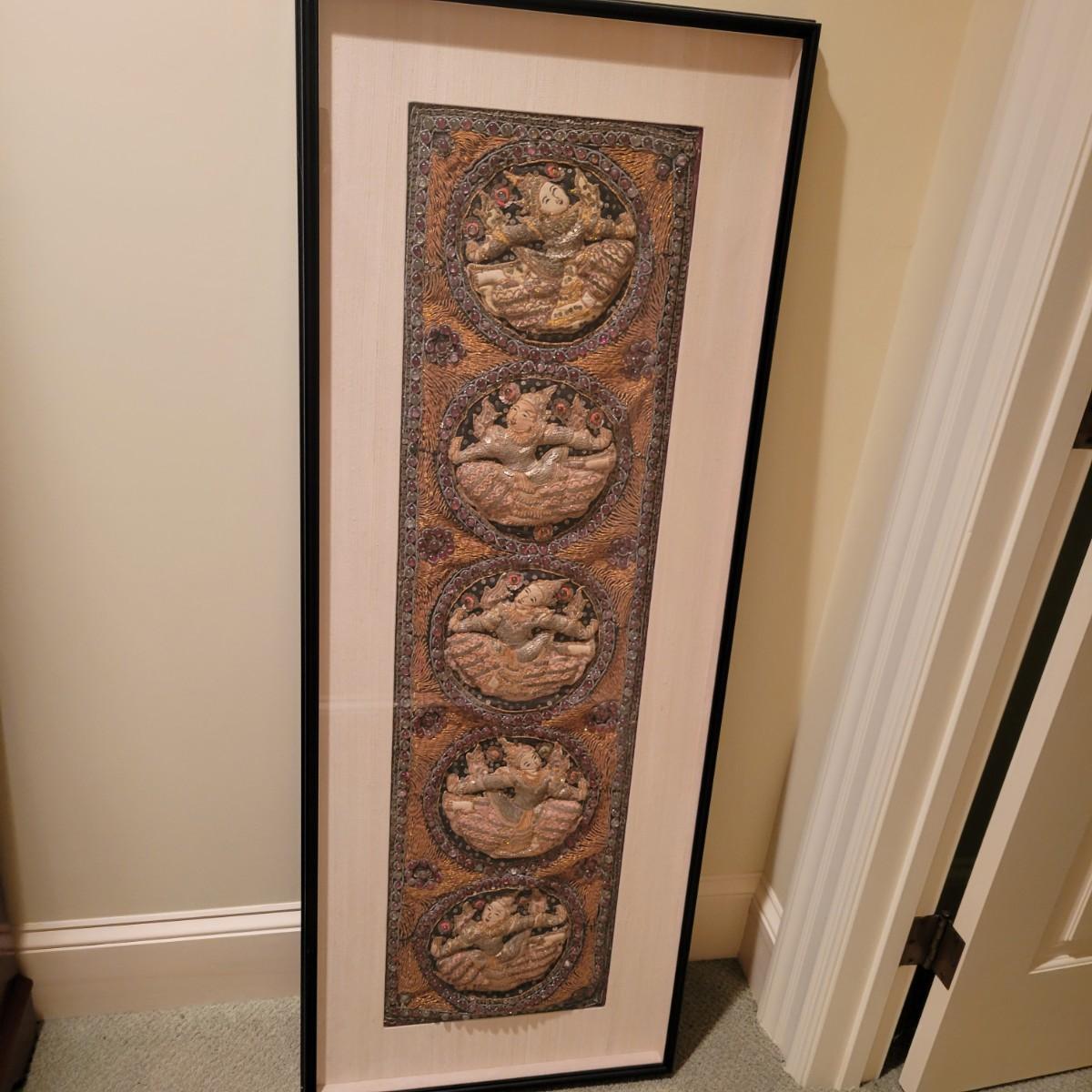 A framed, beaded Burmese Kalaga tapestry that features glass beads and three deminsional elements. It is framed in a hand wrapped silk mat with shadow box spacing. It has a wooden frame with a black finish and measures approximately 20.5" x 2.5" x 53.5". This piece matches another tapastrey in this auction. Shipping available. Shipping can be costly. We suggest contacting our preferred local shipping provider, Postage Express, with dimensions and getting an estimate before bidding: (828) 670-5501 or postageexpress@yahoo.com.