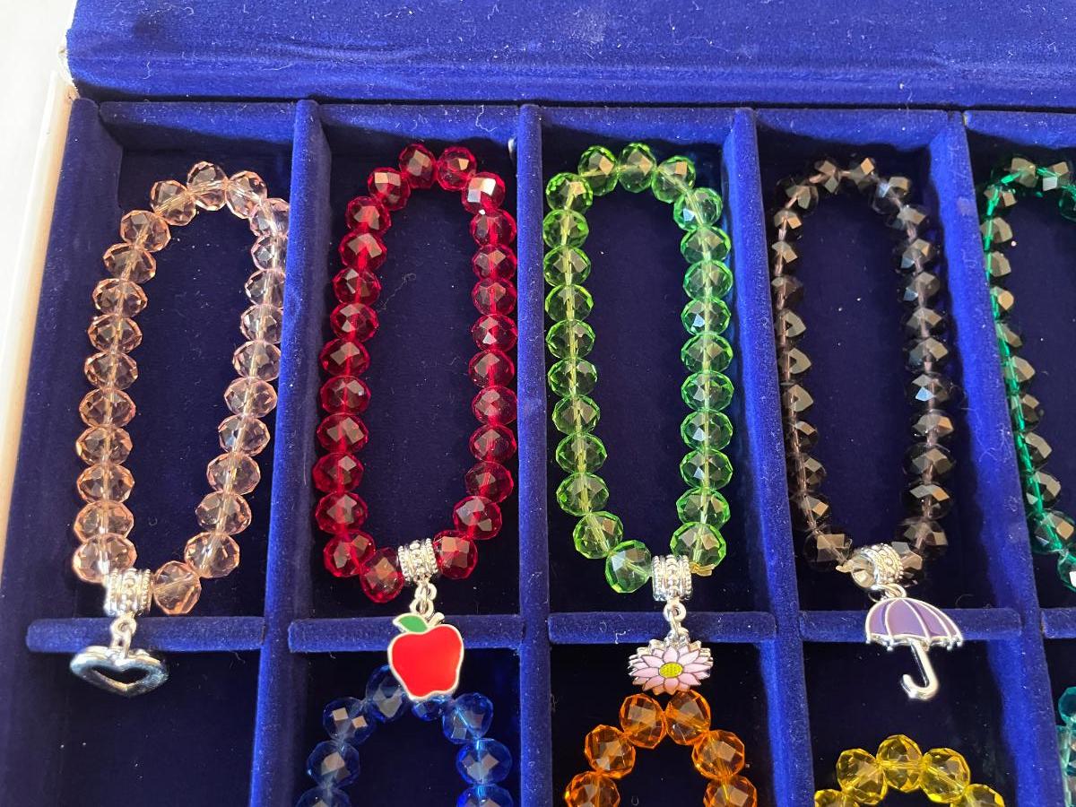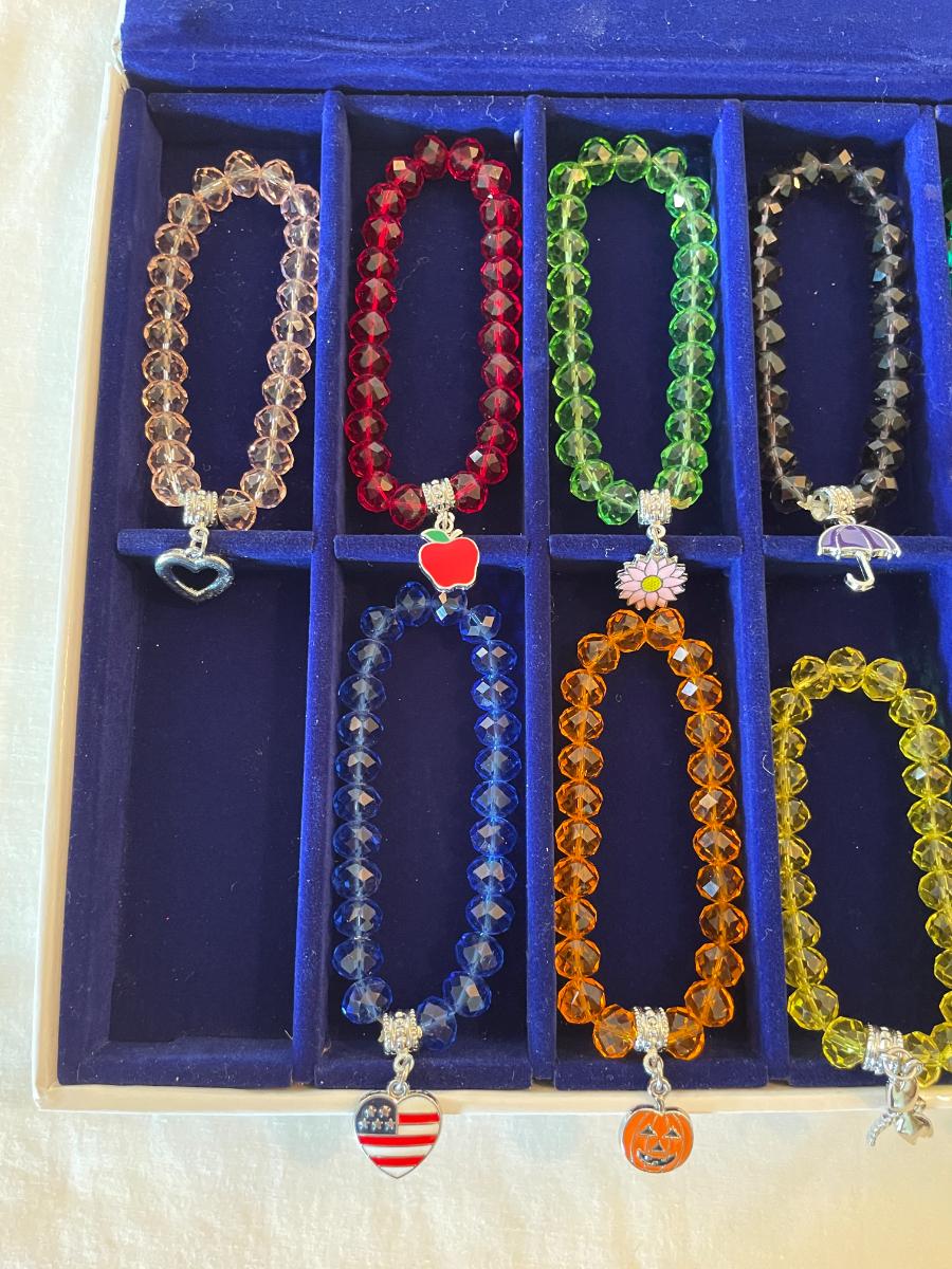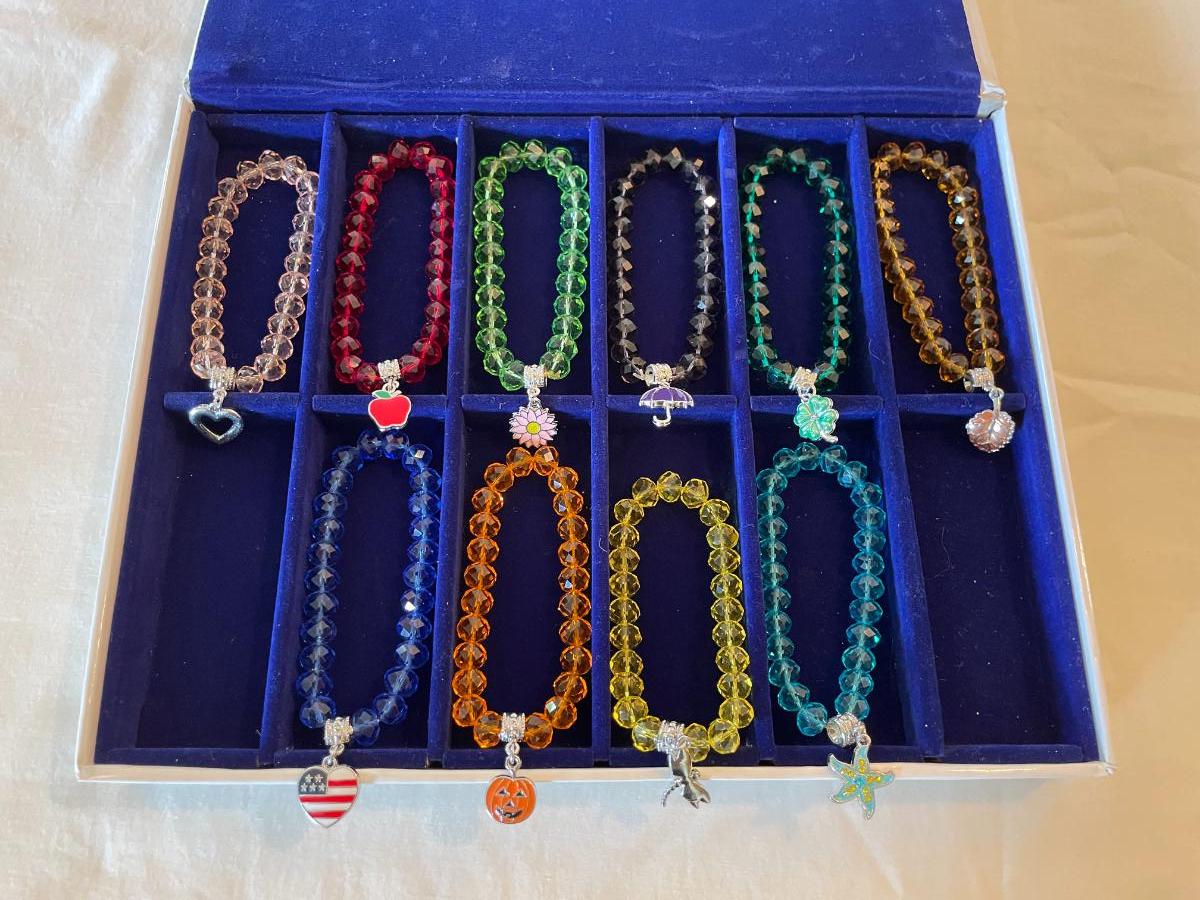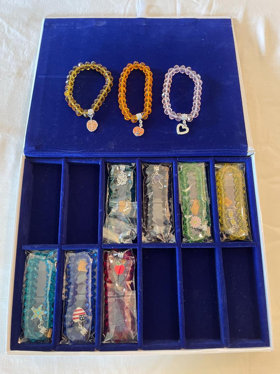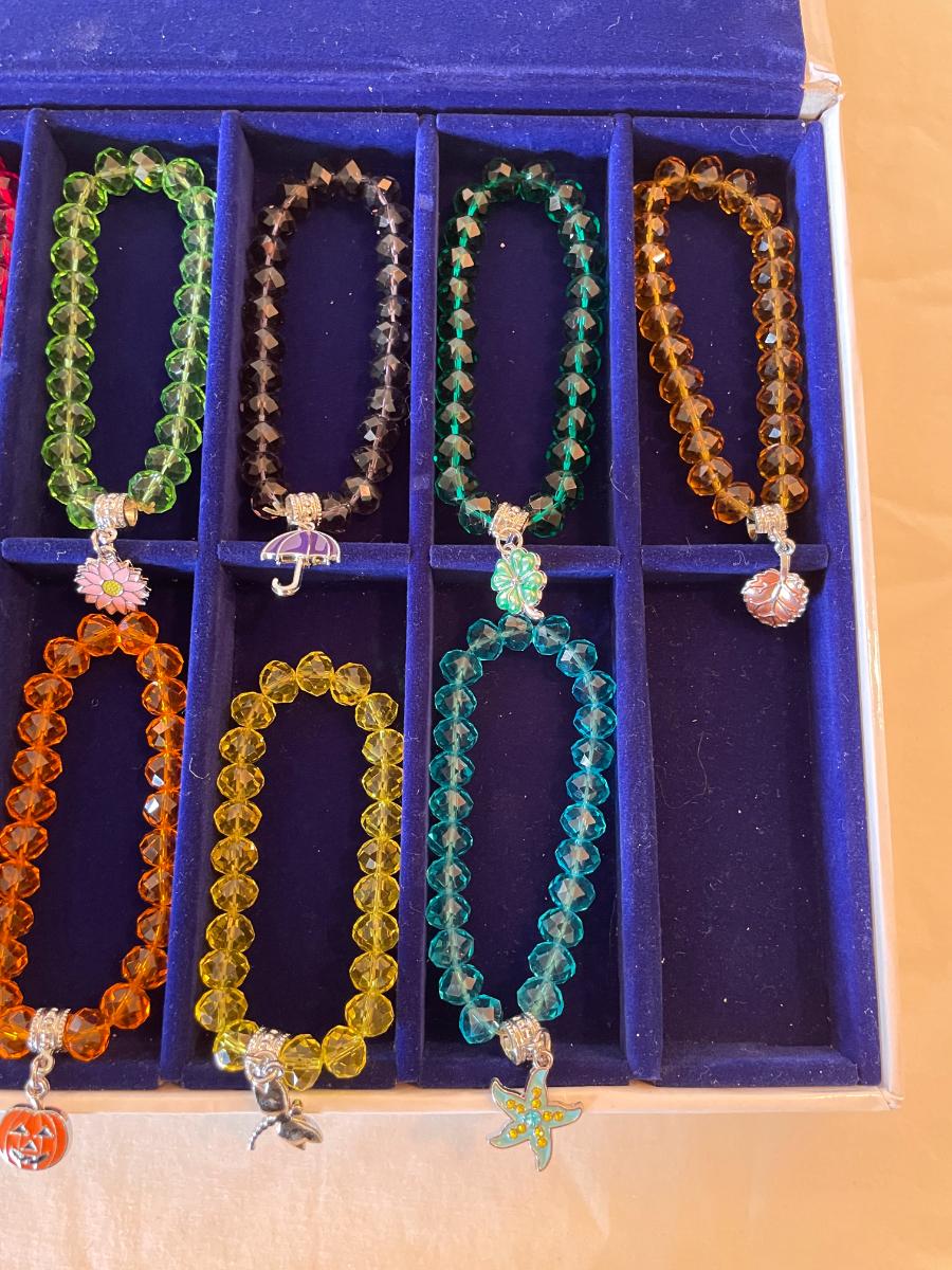 10 stretchable beaded bracelets in assorted colors including red, yellow, blue, green, and orange. Each bracelet features a unique decorative charm, such as a heart, apple, pumpkin, umbrella, and other themed designs. Comes in a fitted blue presentation tray. Bracelets are designed with faceted beads and silver-tone hardware.