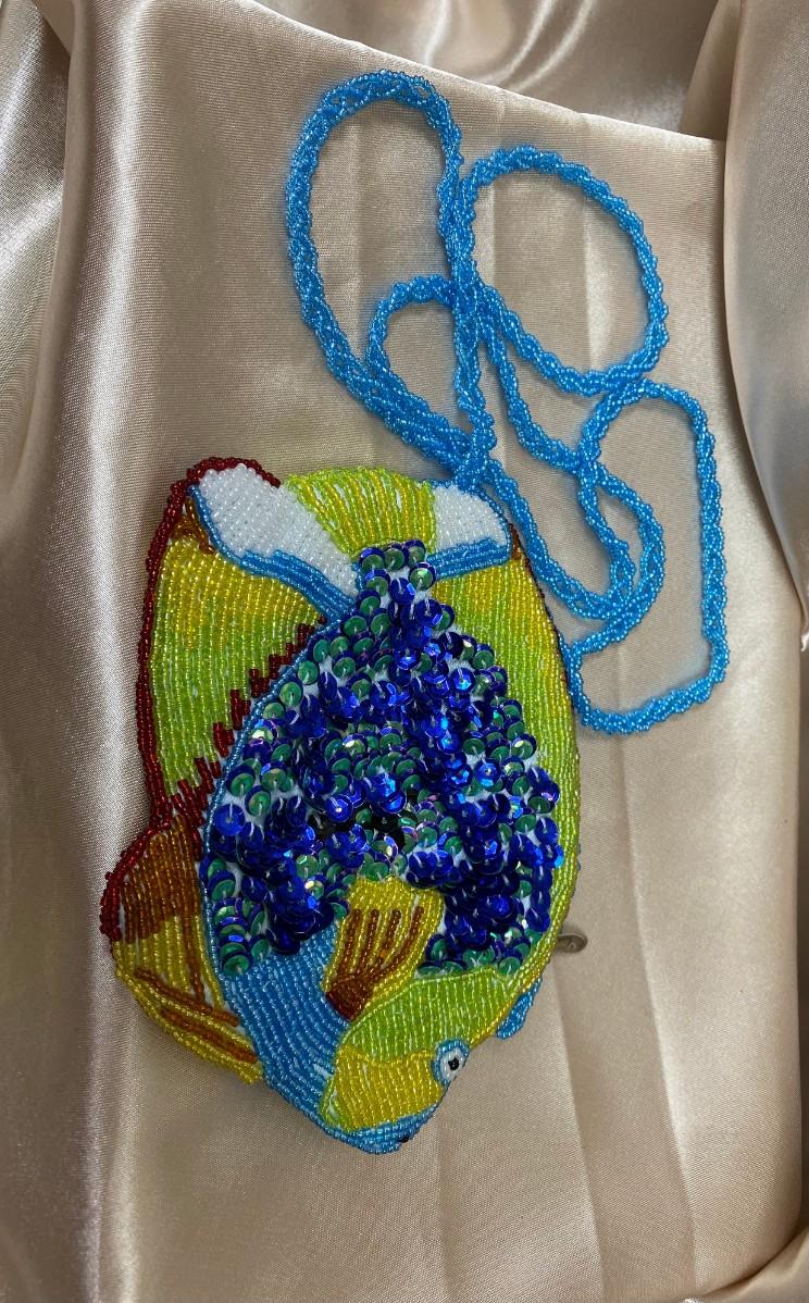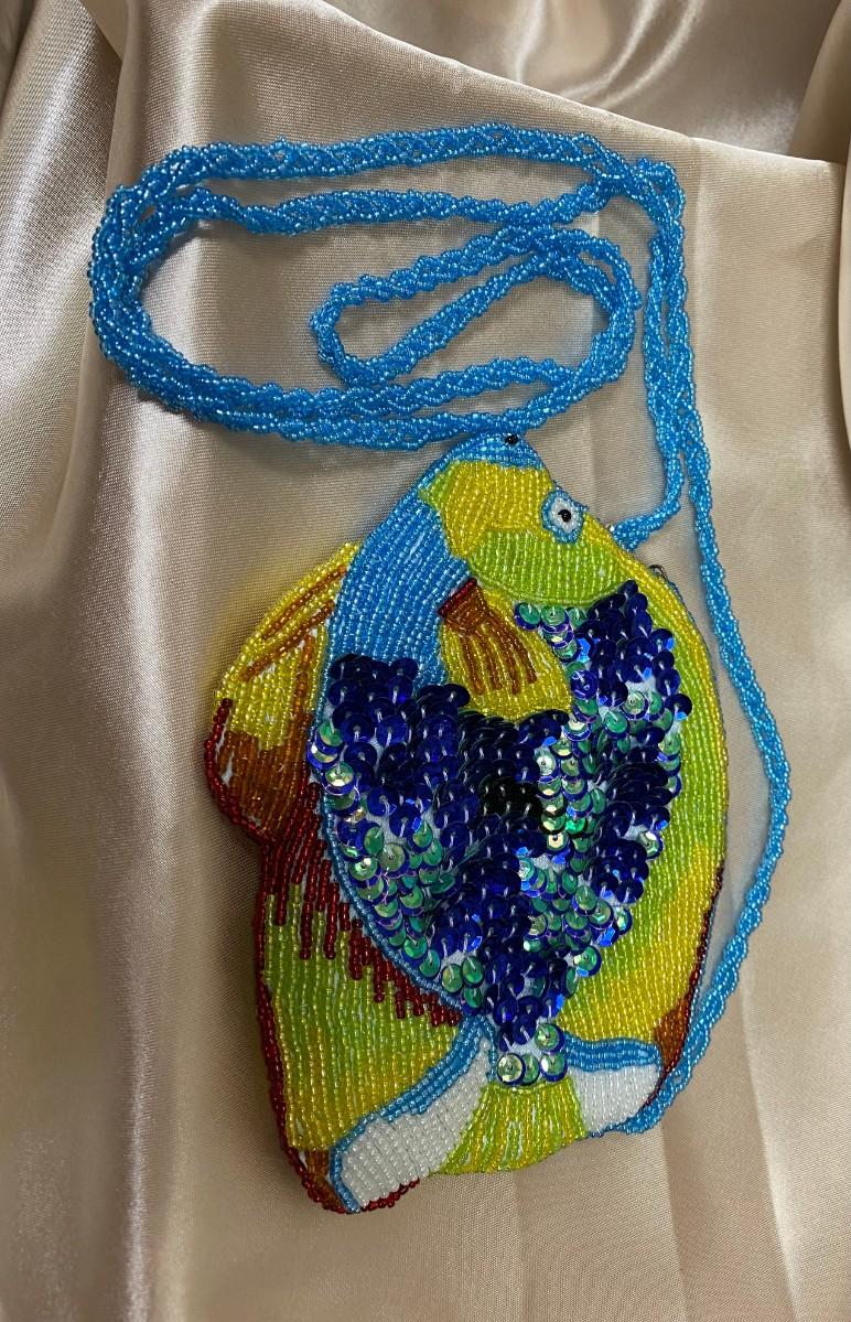 fully beaded bag with 20 inch shoulder strap. Good condition