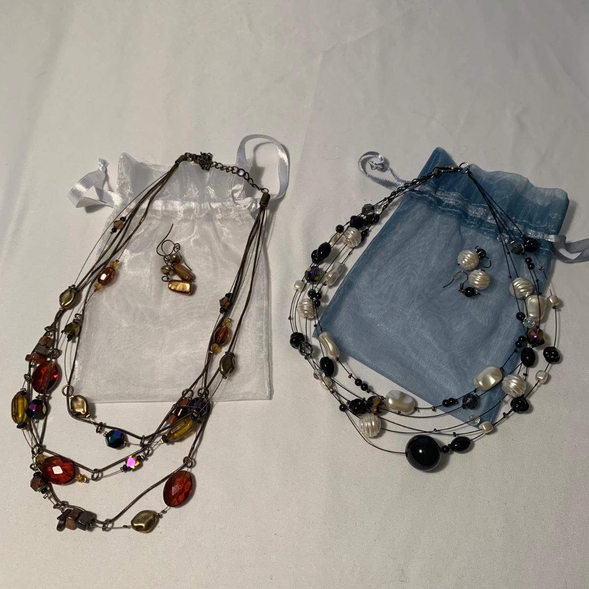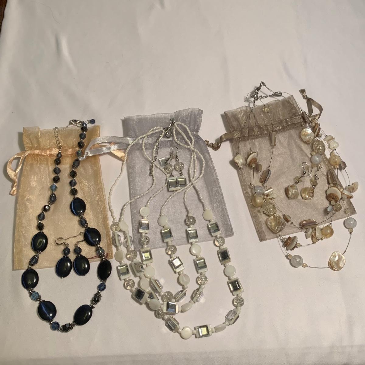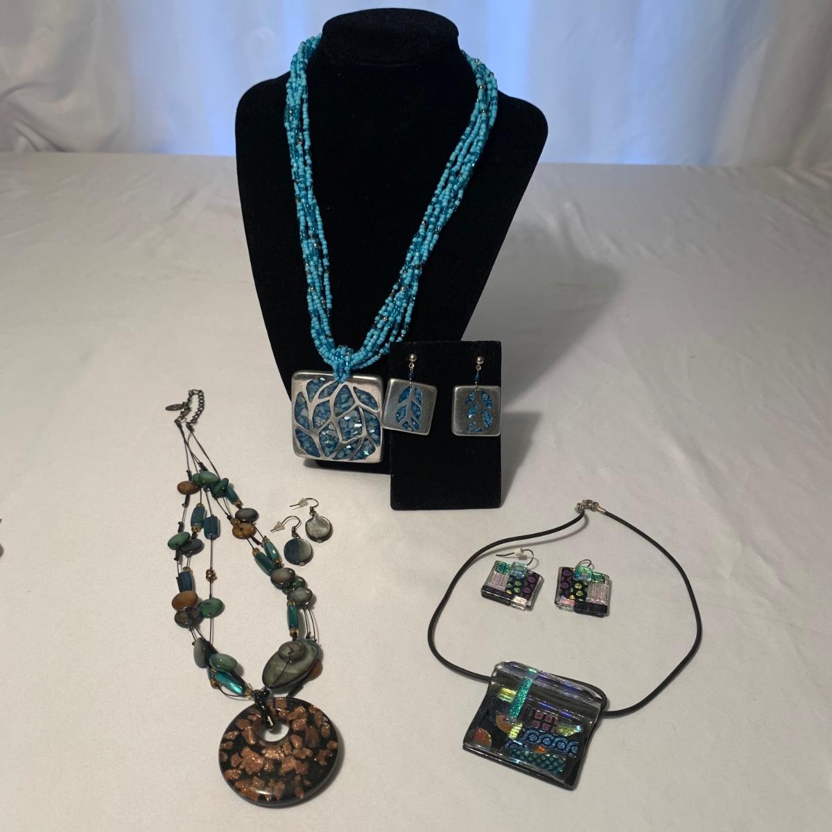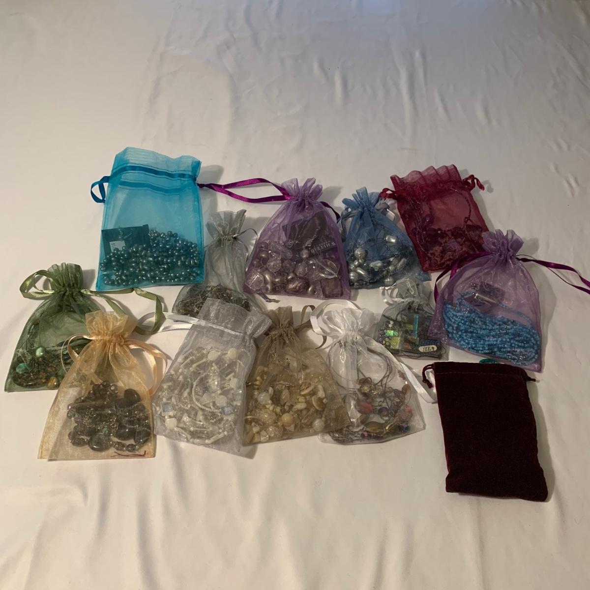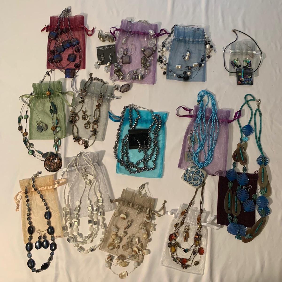 Twelve beaded jewelry sets, all in pouches to keep them organized. Each set has a necklace and a pair of pierced earrings. One set has two pairs of earrings. There are pearls, dichroic glass beads, metal beads, plastic beads, and more. The longest necklace is approximately 32” and the shortest is about 17”. One clasp will need a small and easy repair (see pictures). Shipping available.