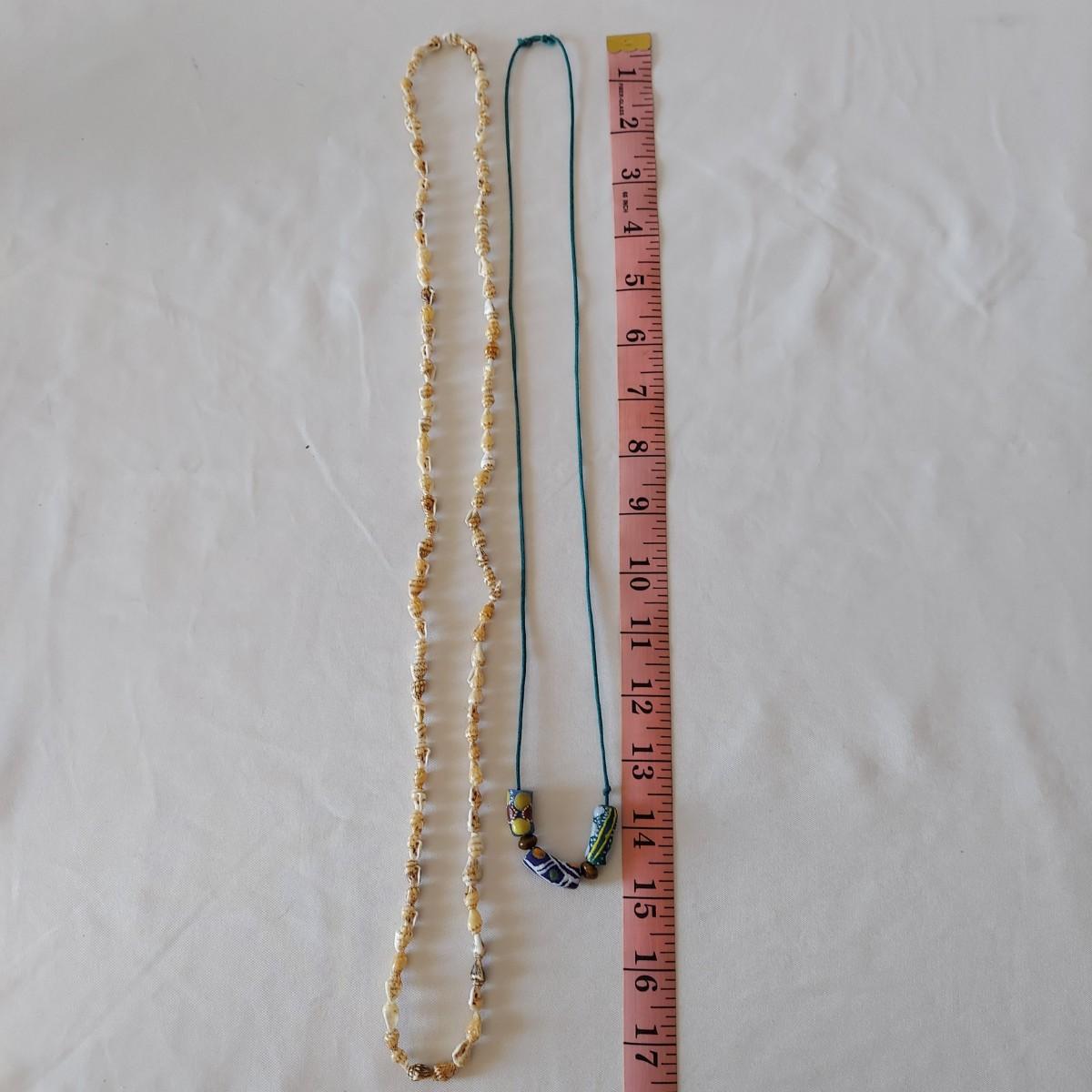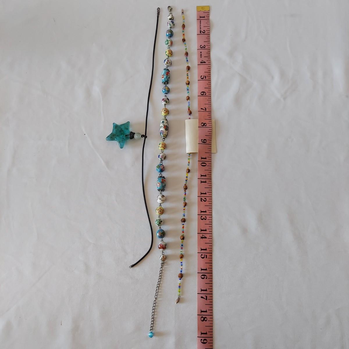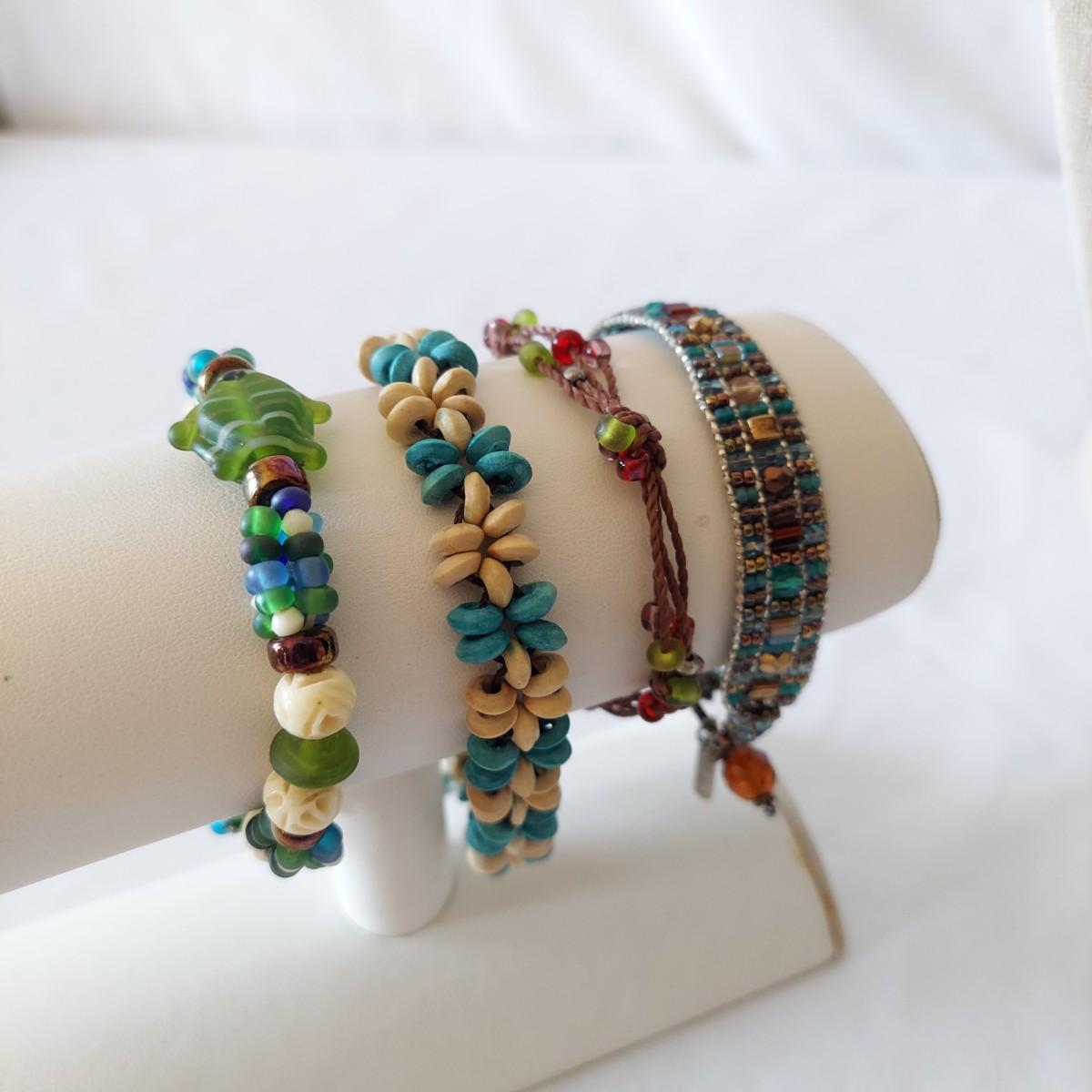 Several pieces of beaded jewelry. Lot includes four bracelets, five necklaces and two pairs of earrings for pierced ears. Some of the necklaces and bracelets are pull on and do not have a clasp. The necklaces range from approximately 16-35" in length.