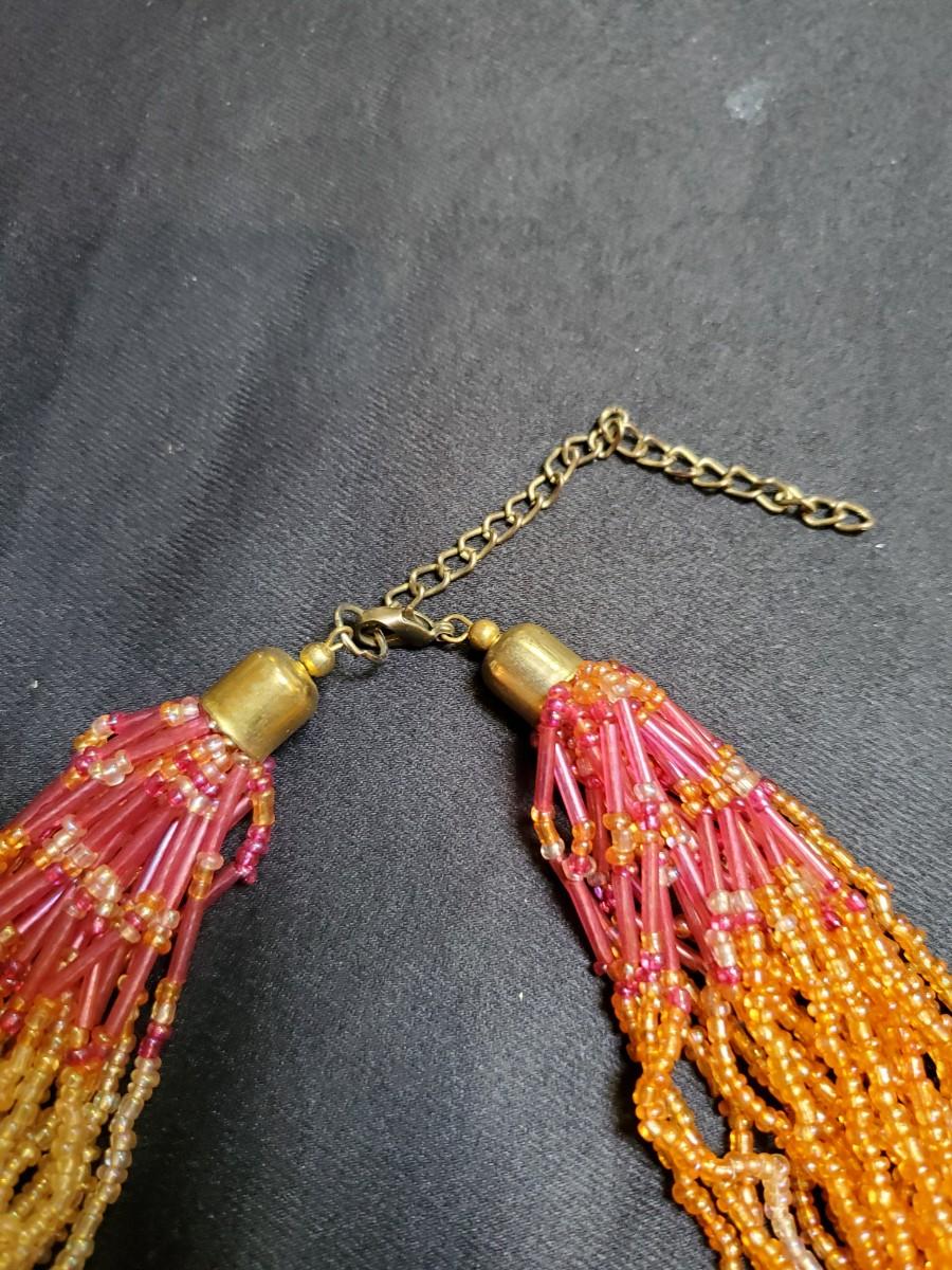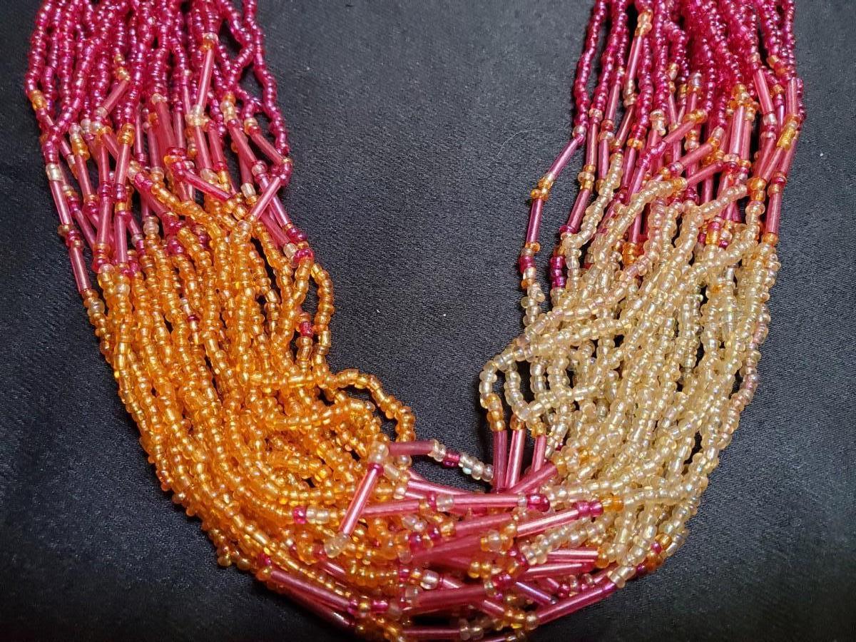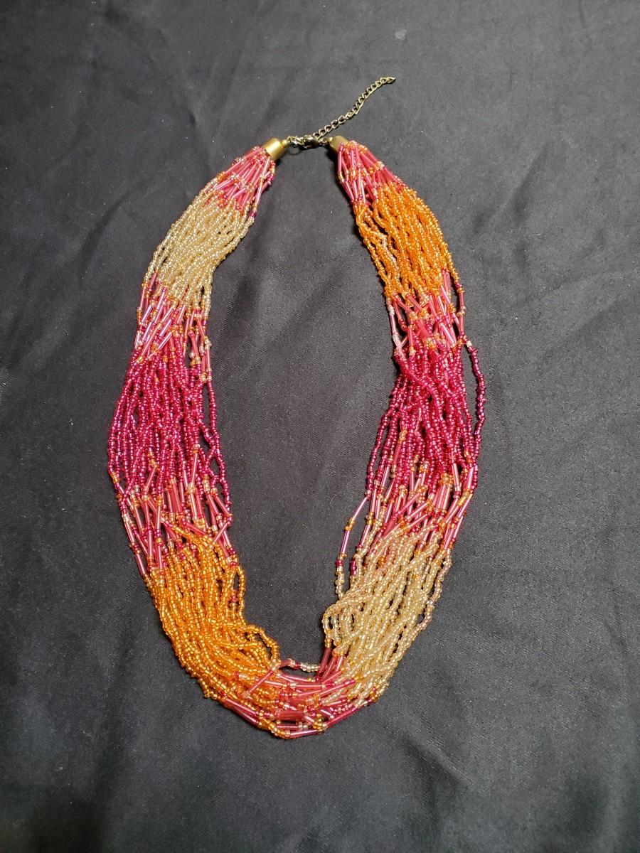Multi-Strand Beaded Necklace. 24" with Extender. Pinks, Orange, Natural.