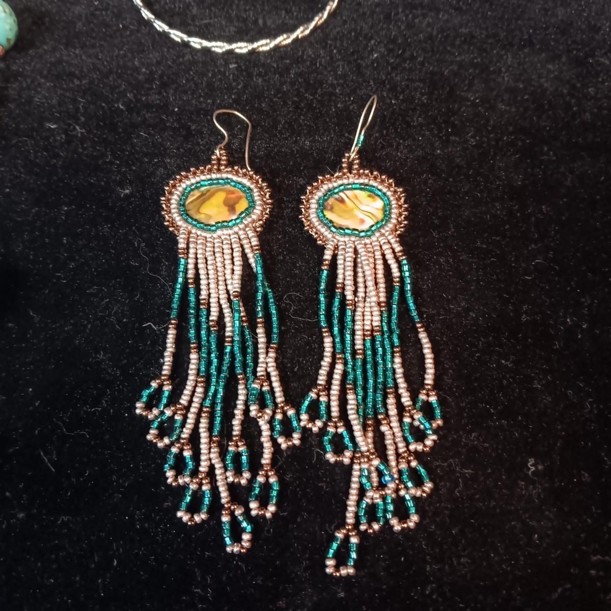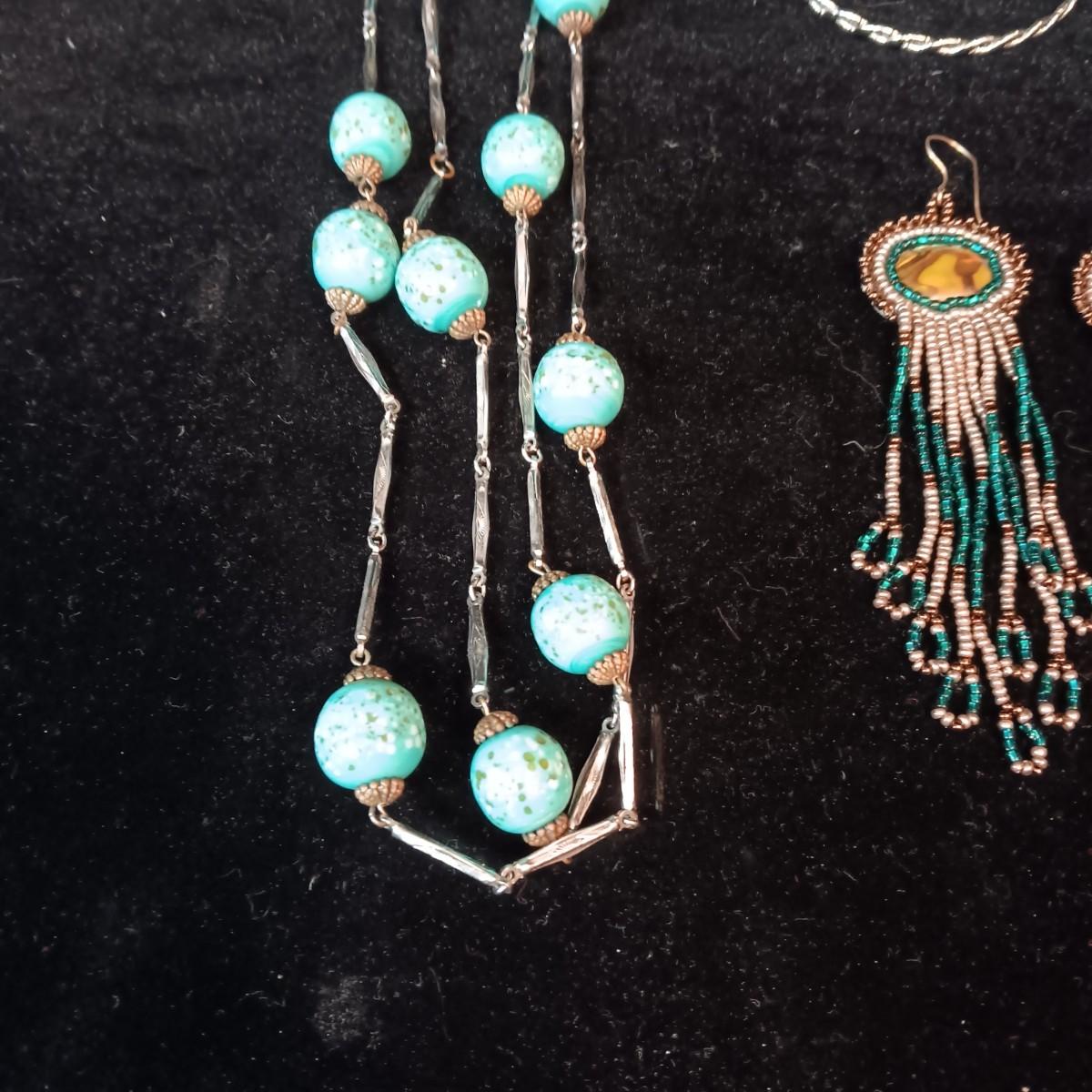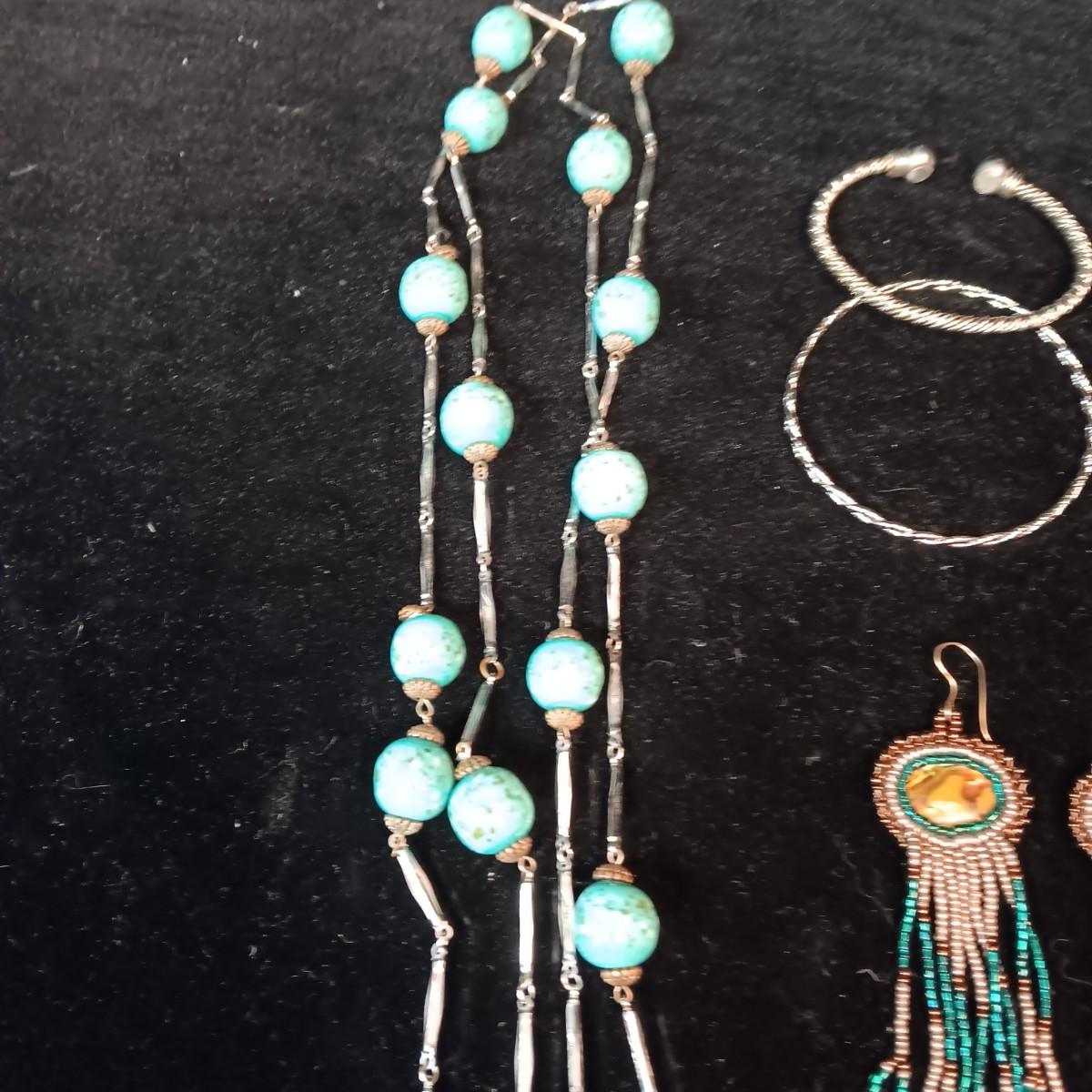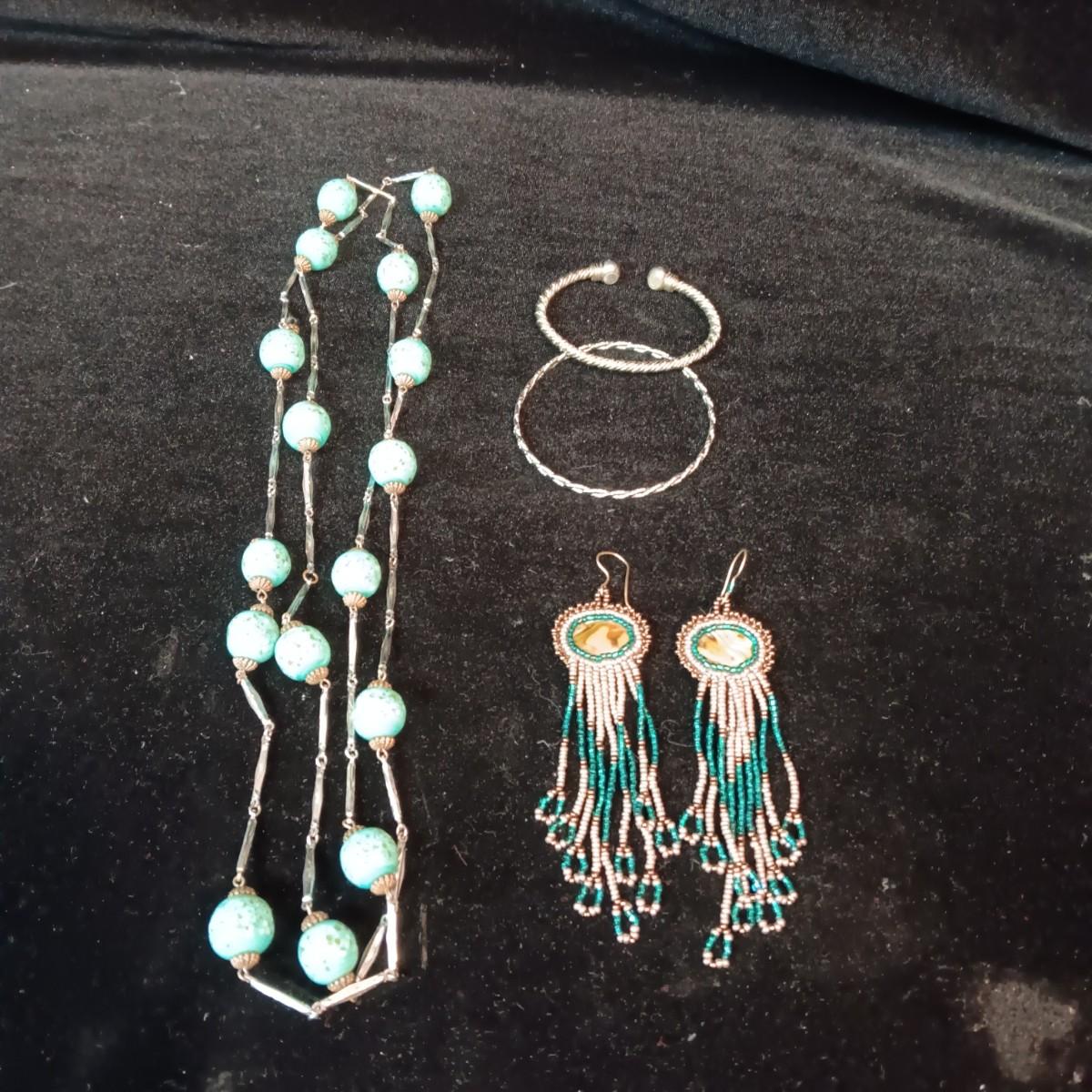 BEADED NECKLACE, EARRINGS AND 2 BRACELETS